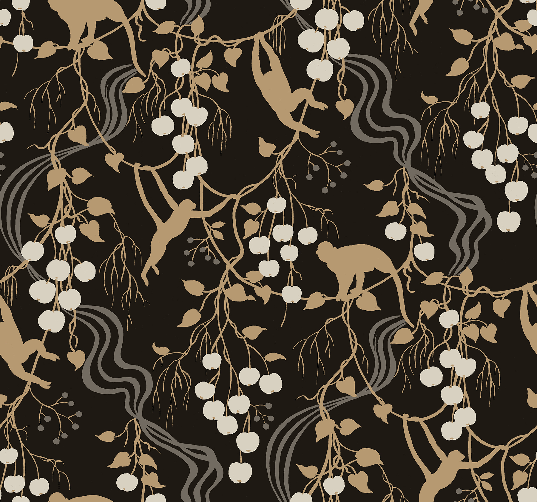 | Dynamic Description (French) | Des singes se balancent et grimpent parmi les vignes chargées de fruits mûrs dans ce motif éclectique et majestueux. Les détails pittoresques sont imprimés en doré métallique, rouge et bleu ciel sur un fond vert chasseur. Linden est un papier peint non tissé non encollé mesurant 69 cm de large sur 8,23 m de long, couvrant environ 5,6 m² par rouleau. |