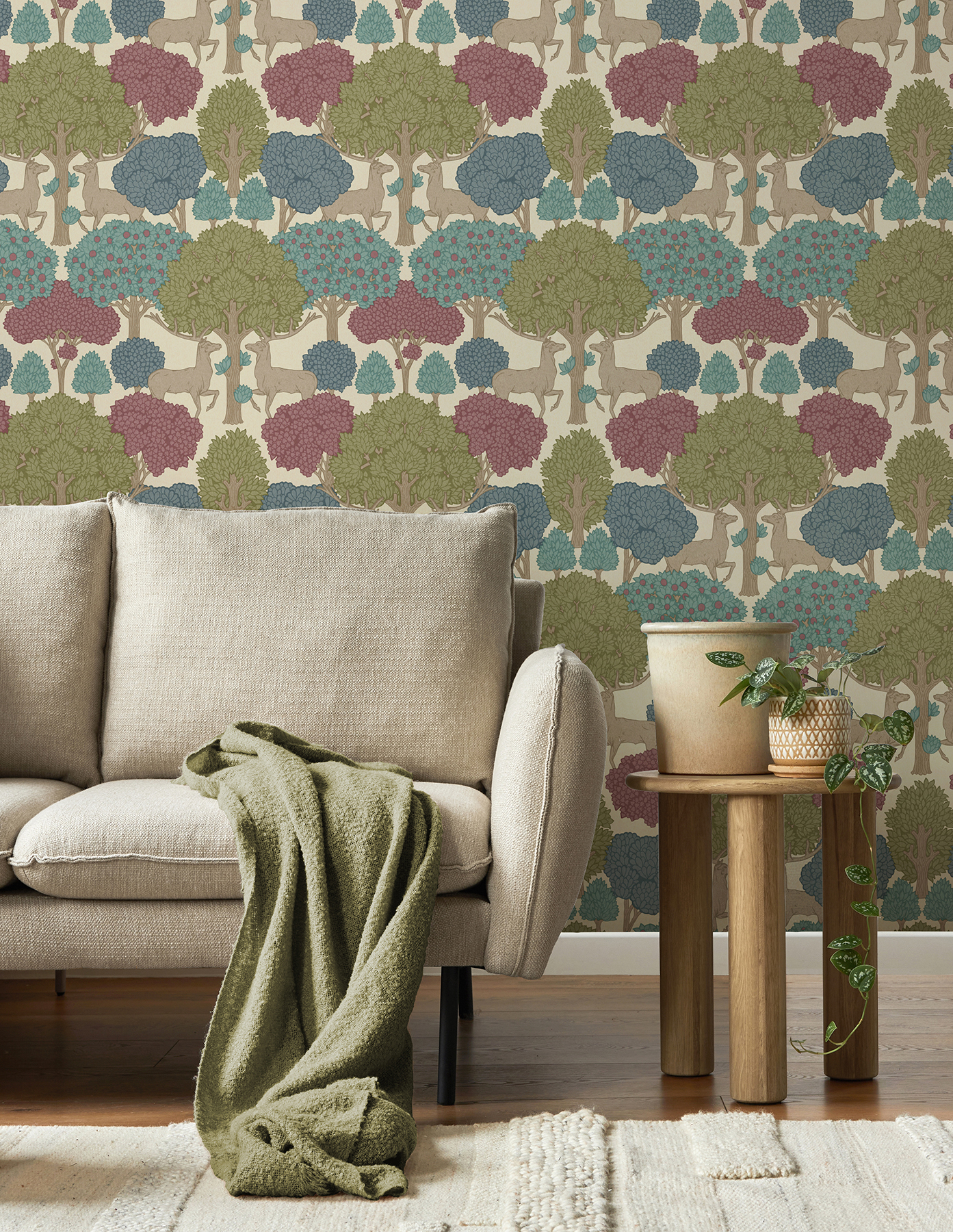 | Dynamic Description | Proud stags march through a woodland forest in this gorgeous wallpaper print. The bucks are inked in pale brown, while the trees sport merlot, teal, blue, and green foliage that's offset against a creamy taupe backdrop. Forest of Arden is an unpasted, non woven wallpaper measuring 20.5 inches wide by 33 feet long, covering approximately About 56.4 square feet square feet per roll. |