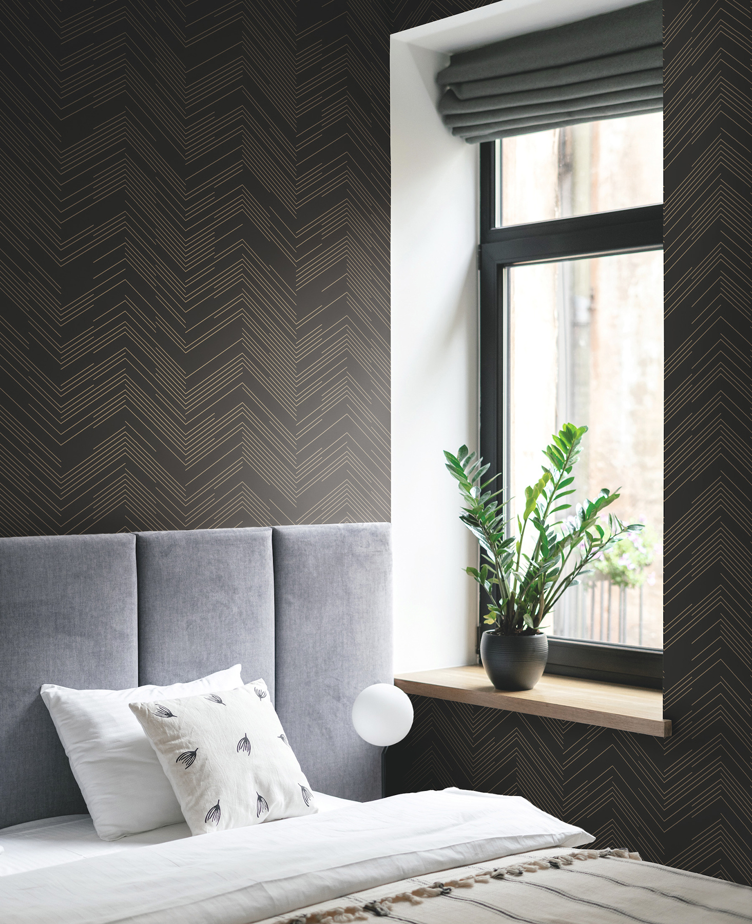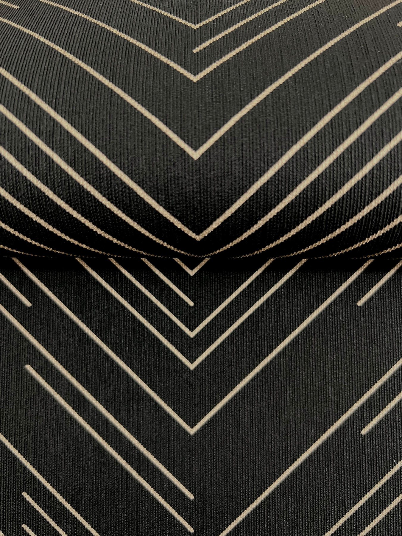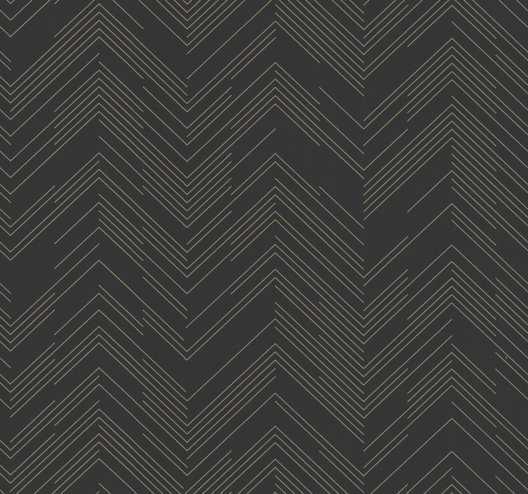 | Dynamic Description | This contemporary take on chevron features an asymmetrical distribution of lines counterbalanced by negative space. Featured here with golden taupe lines against rich black. Kian is an unpasted, non woven backed vinyl wallpaper measuring 54 inches wide by 90 feet long, covering approximately About 405 square feet square feet per roll. |