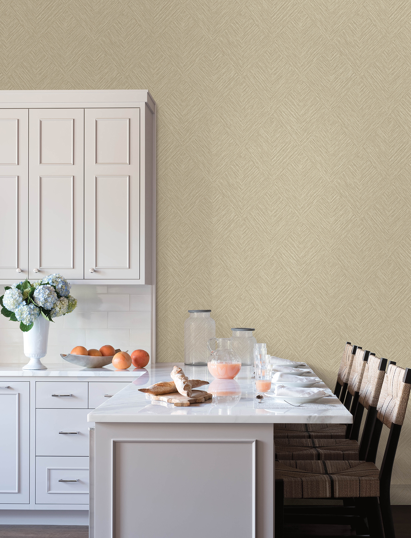 | Description + Bullets | Reminiscent of parquet flooring, this textured design features diamonds shaped by herringbone inlays. Seen here in pale brown and cream. Hollis is an unpasted, vinyl on nonwoven wallpaper measuring 20.9 inches wide by 33 feet long, covering approximately 57.5 per roll. Unpasted vinyl on non woven material; Endless repeat, straight match; Scrubbable and strippable; 20.9-in by 33-ft long roll; Covers about 57.5 square feet |