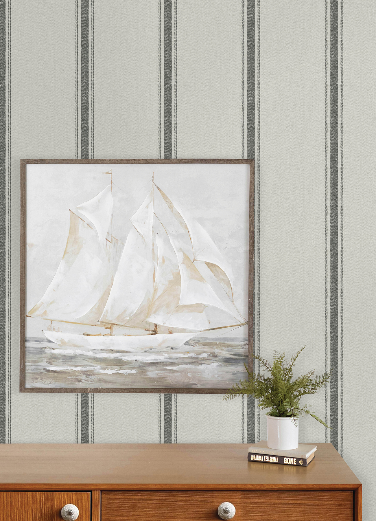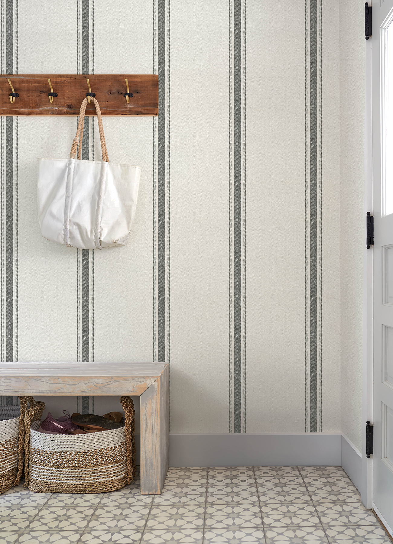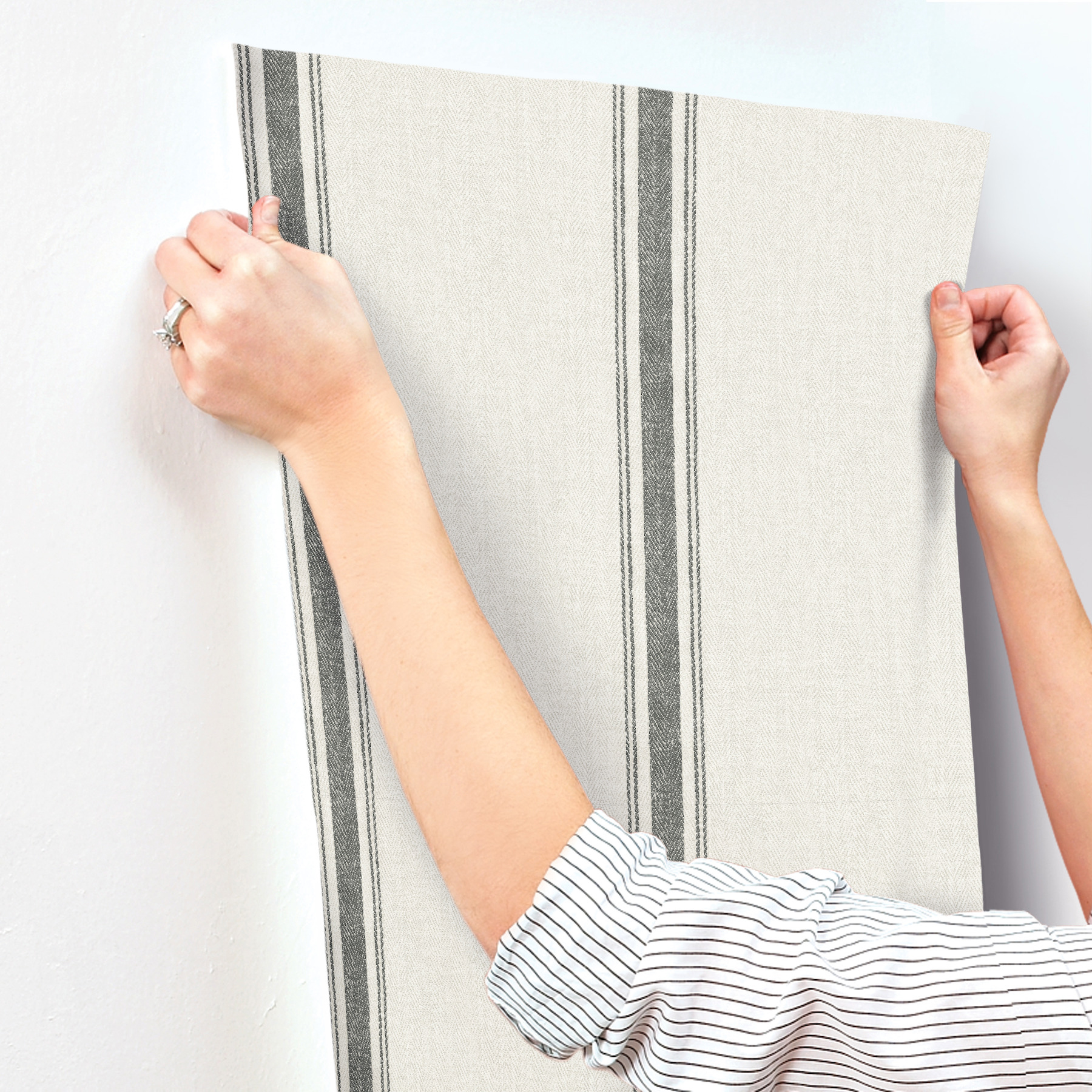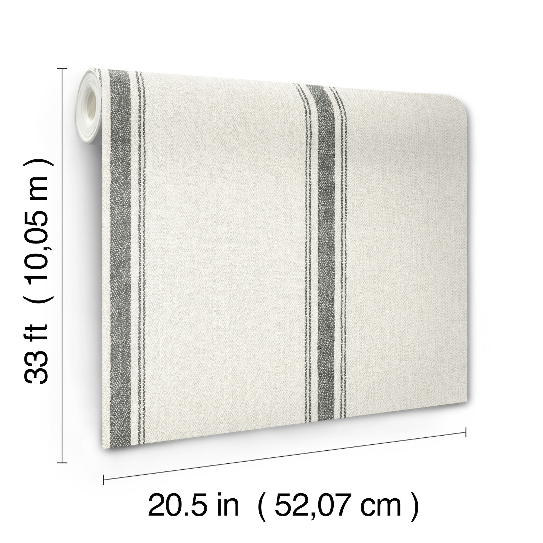 | Description + Bullets | This classic and comforting stripe design features a central column embellished with a pair of pinstripes on each side, the backdrop imbued with a chevron weave reminiscent of sturdy linen. Seen here with worn black accents against palest grey. Linette is a prepasted, easy walls wallpaper measuring 20.5 inches wide by 33 feet long, covering approximately 56.4 per roll. Prepasted easy walls material; 20.5-in repeat, straight match; Washable and strippable; 20.5-in by 33-ft long roll; Covers about 56.4 square feet |