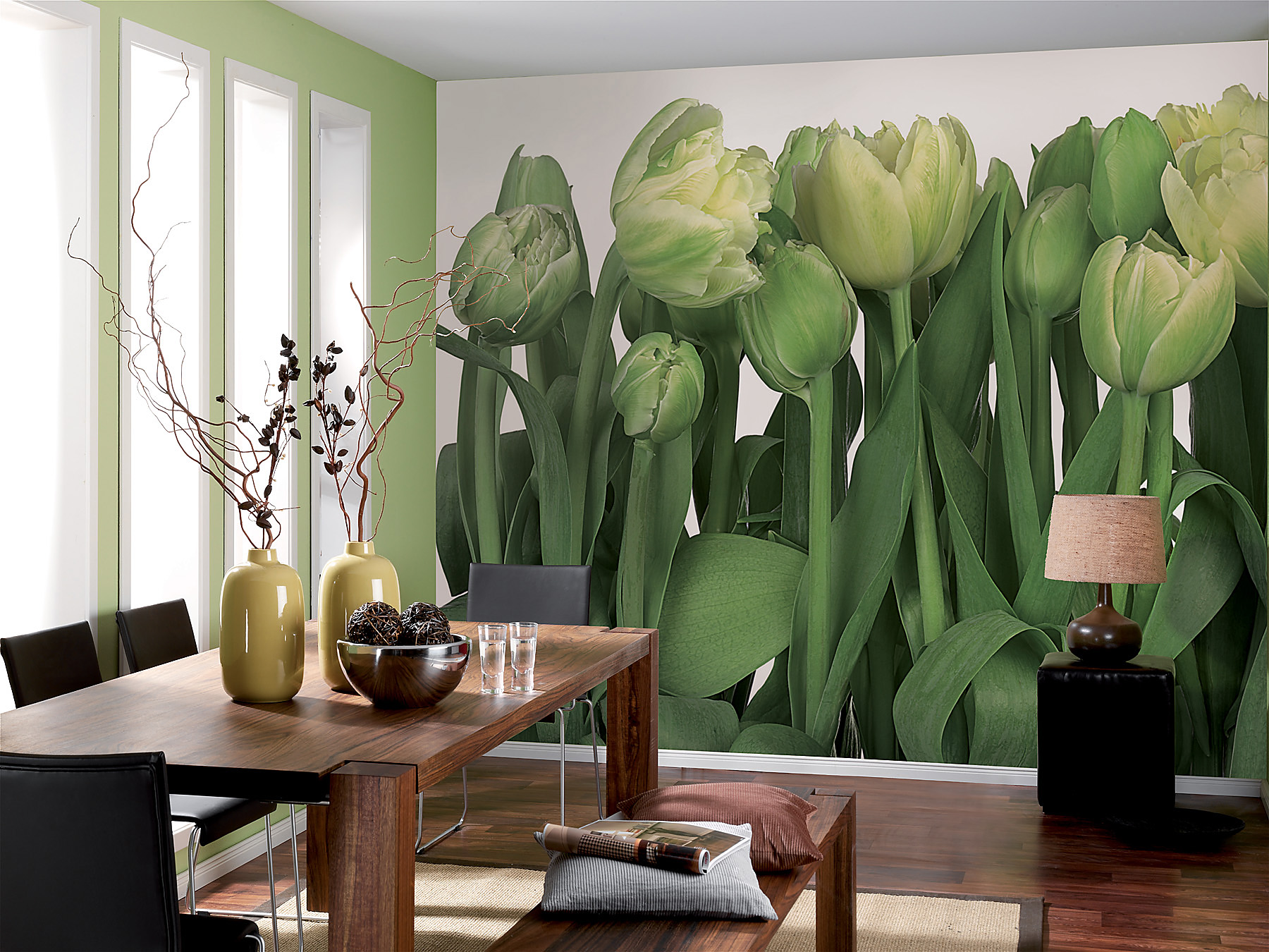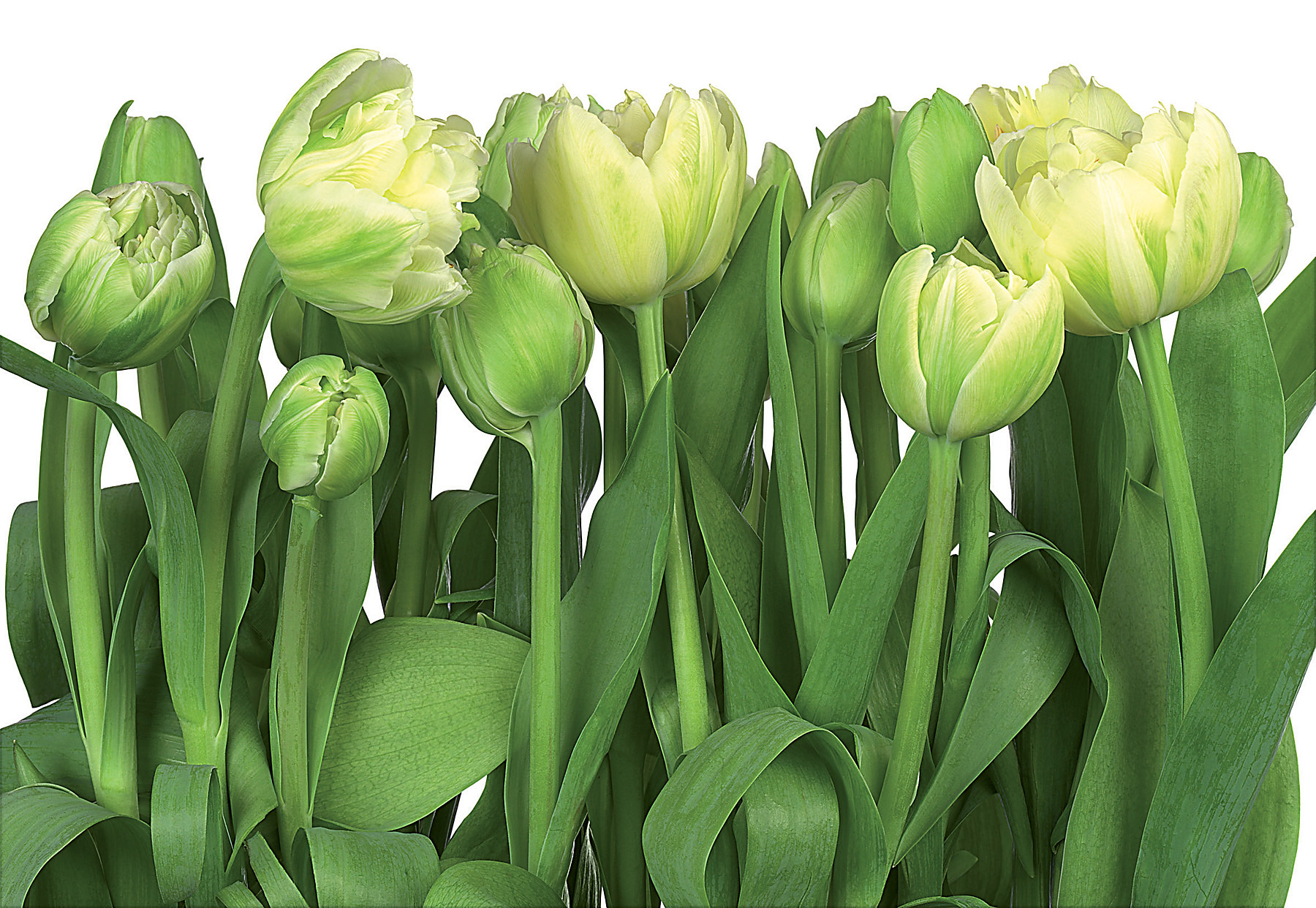 | Dynamic Description | A gorgeous, photorealistic image of verdant tulips on a clean white background. This flower mural has a sophisticated composition. |