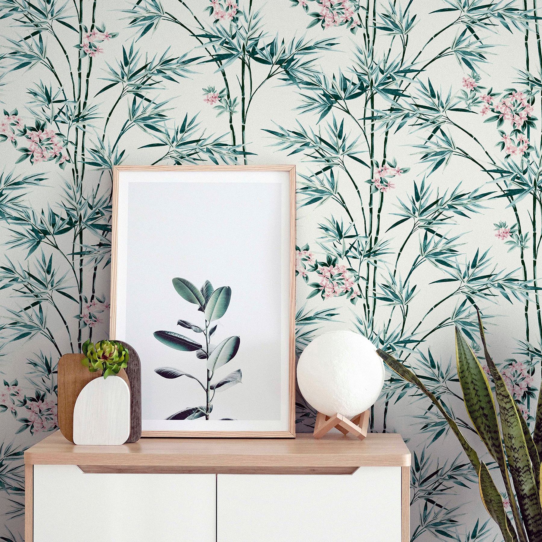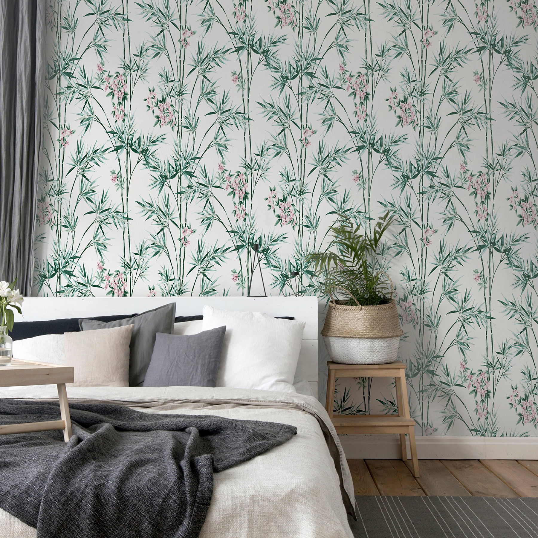 | Dynamic Description | This delicate and feminine botanical wallpaper features tall and willowy bamboo brightened with small clusters of floral blooms and glitter. The stalks are painted in rich greens, the flowers in warm pinks, and the background a crisp white. Ayumi is an unpasted, paper wallpaper measuring 20.9 inches wide by 33 feet long, covering approximately 57.5 square feet per roll. |