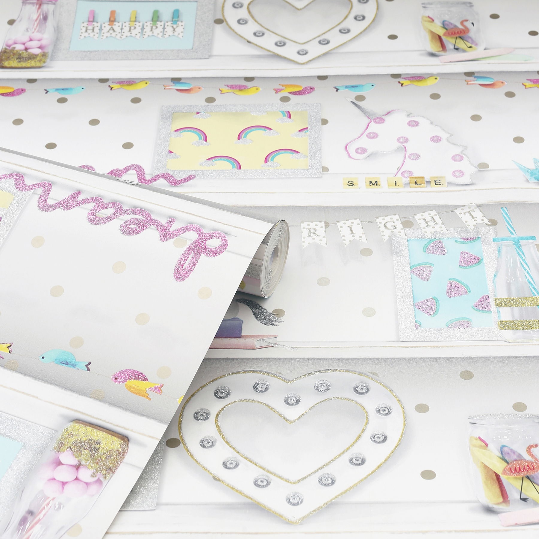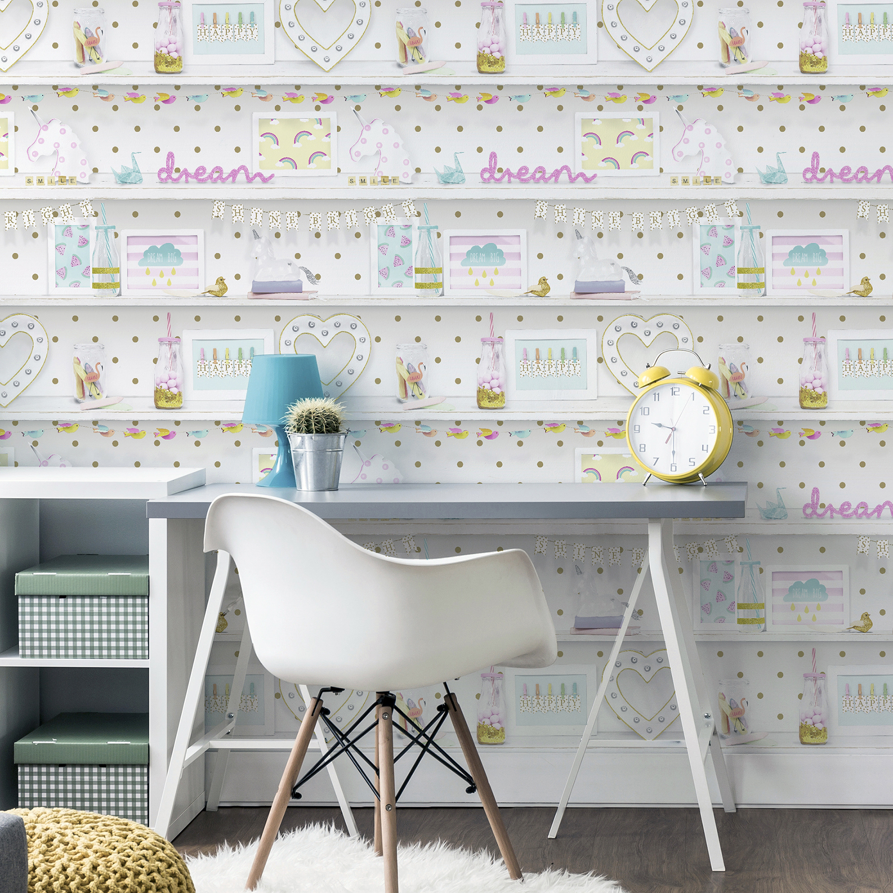 | Dynamic Description (French) | Ajoutez une touche de bonheur et d'optimisme à n'importe quelle salle de jeux ou chambre à coucher avec ce papier peint éclectique. Conçu pour ressembler à des étagères, il présente une série de bibelots joyeux et de phrases inspirantes. Imprimé dans des tons pastel sur fond blanc et rehaussé de paillettes. Bonnie est un papier peint non encollé, mesurant 53 cm de large sur 10 mètres de long, couvrant environ 5,3 m² par rouleau. |