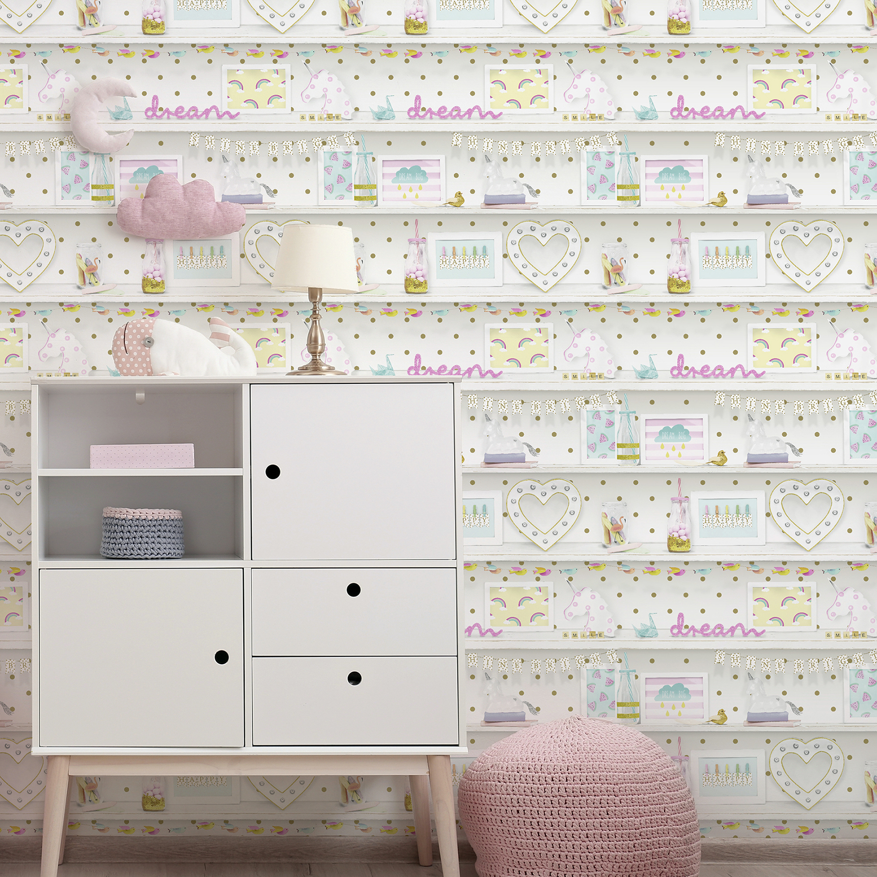 | Dynamic Description | Add a dose of happiness and optimism to any playroom or bedroom with this eclectic wallpaper. Designed to look like shelves, it features an array of cheerful tchotchkes and inspirational phrases. Inked in pastel hues against white and accented with glitter. Bonnie is an unpasted, paper wallpaper measuring 20.9 inches wide by 33 feet long, covering approximately 57.5 square feet per roll. |