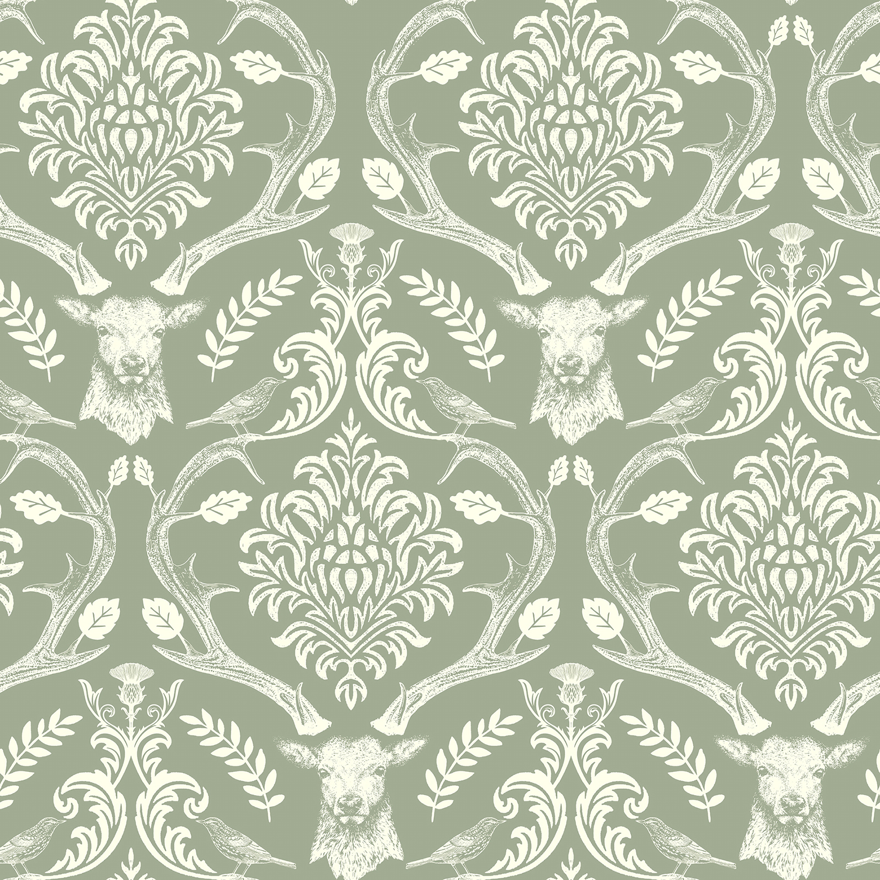 | Dynamic Description | Damask stylings meet woodland motifs in this delightful deer wallpaper. A stag and his impressive antlers, embellished with visiting birds and botanical accents, are the unconventional foundation of this timeless pattern. Seen here inked in white against sage. Wickham is an unpasted, paper wallpaper measuring 20.9 inches wide by 33 feet long, covering approximately 57.5 square feet per roll. |