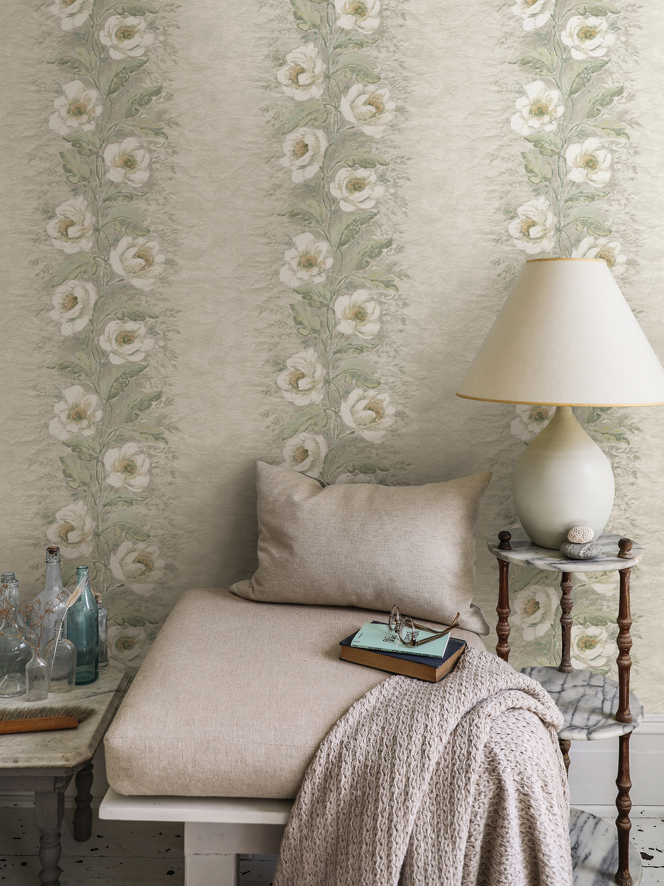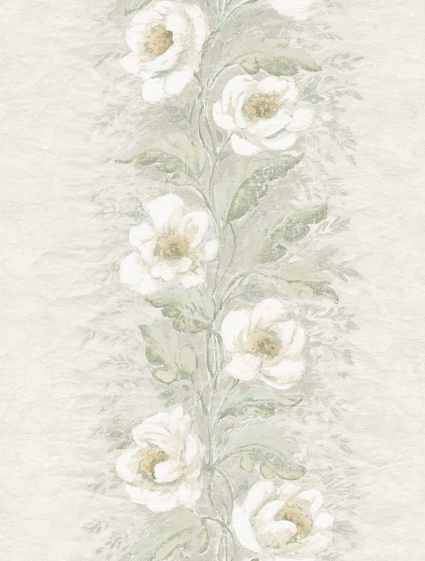 | Dynamic Description | The vintage florals of this wallpaper will infuse your home with timeless elegance. Plush white flowers twine together in tall columns against a soft gray background, subtle distressing and artistic touches giving the impression of an antique canvas painting. Dutch Garland Timeless is an unpasted, non woven wallpaper. |