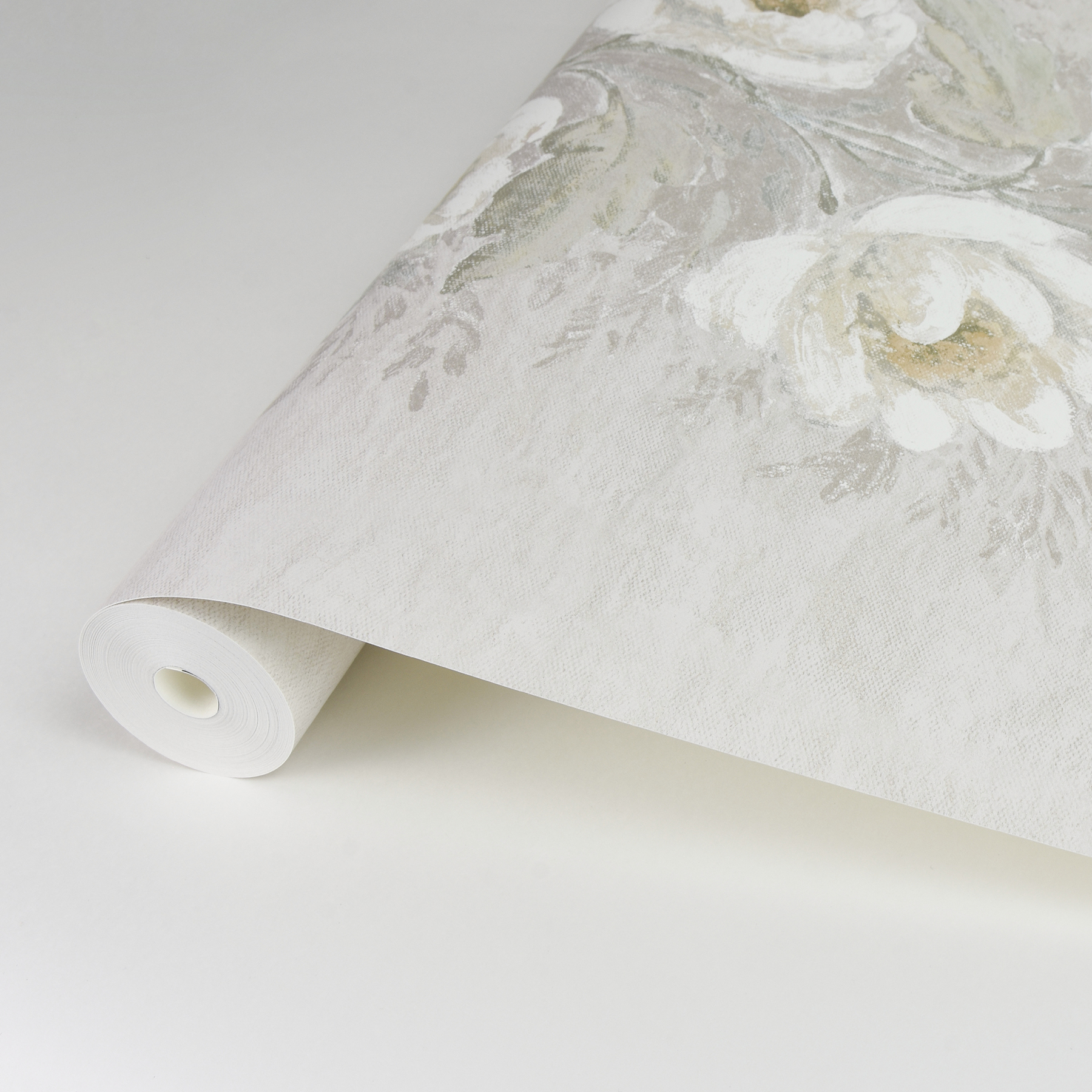 | Description + Bullets | The vintage florals of this wallpaper will infuse your home with timeless elegance. Plush white flowers twine together in tall columns against a soft gray background, subtle distressing and artistic touches giving the impression of an antique canvas painting. Dutch Garland Timeless is an unpasted, non woven wallpaper. Unpasted non woven material; 27.5-in repeat, half drop match; Washable and strippable; 20.5-in by 33-ft long roll; Covers about 56.4 square feet |