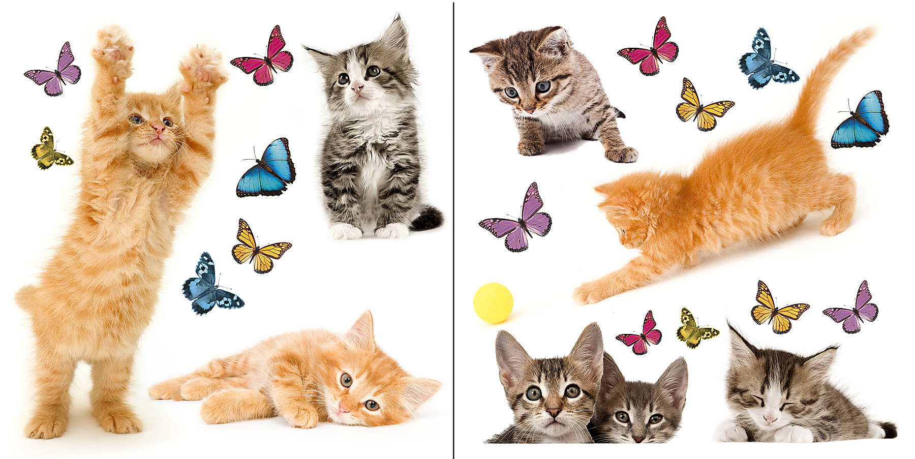 | Dynamic Description | Adorable kittens AND beautiful butterflies! These playful kitty window stickers with beautiful butterfly decals make an irresistible scenic on any glass surface. Add a darling razzle dazzle to a window, or dress up a glass cabinet, mirror , or shower door with these removable stickers. |
