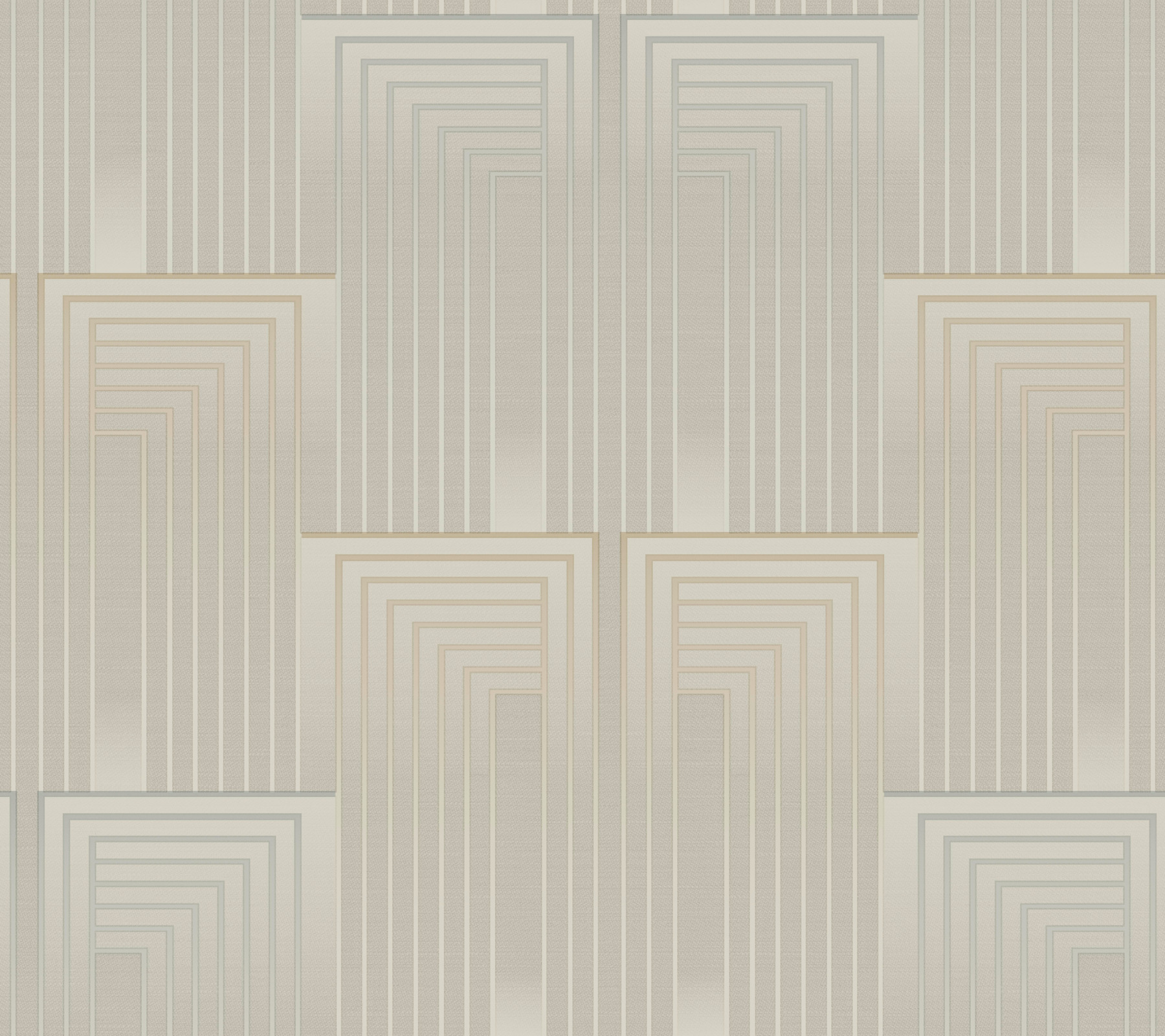 | Dynamic Description | Art Deco linear rectangles glow with a metallic sheen that inspires the name of pattern Vanishing. This Vanishing Wallpaper measures approximately 27 inches wide by 27 feet long, covering About 60.8 square feet per roll. Durable and easy to remove from primed walls, this friendly-to-hang, unpasted, non-woven wallpaper is created with a special blend of synthetic fibers, making it both easy to hang and tear resistant. |