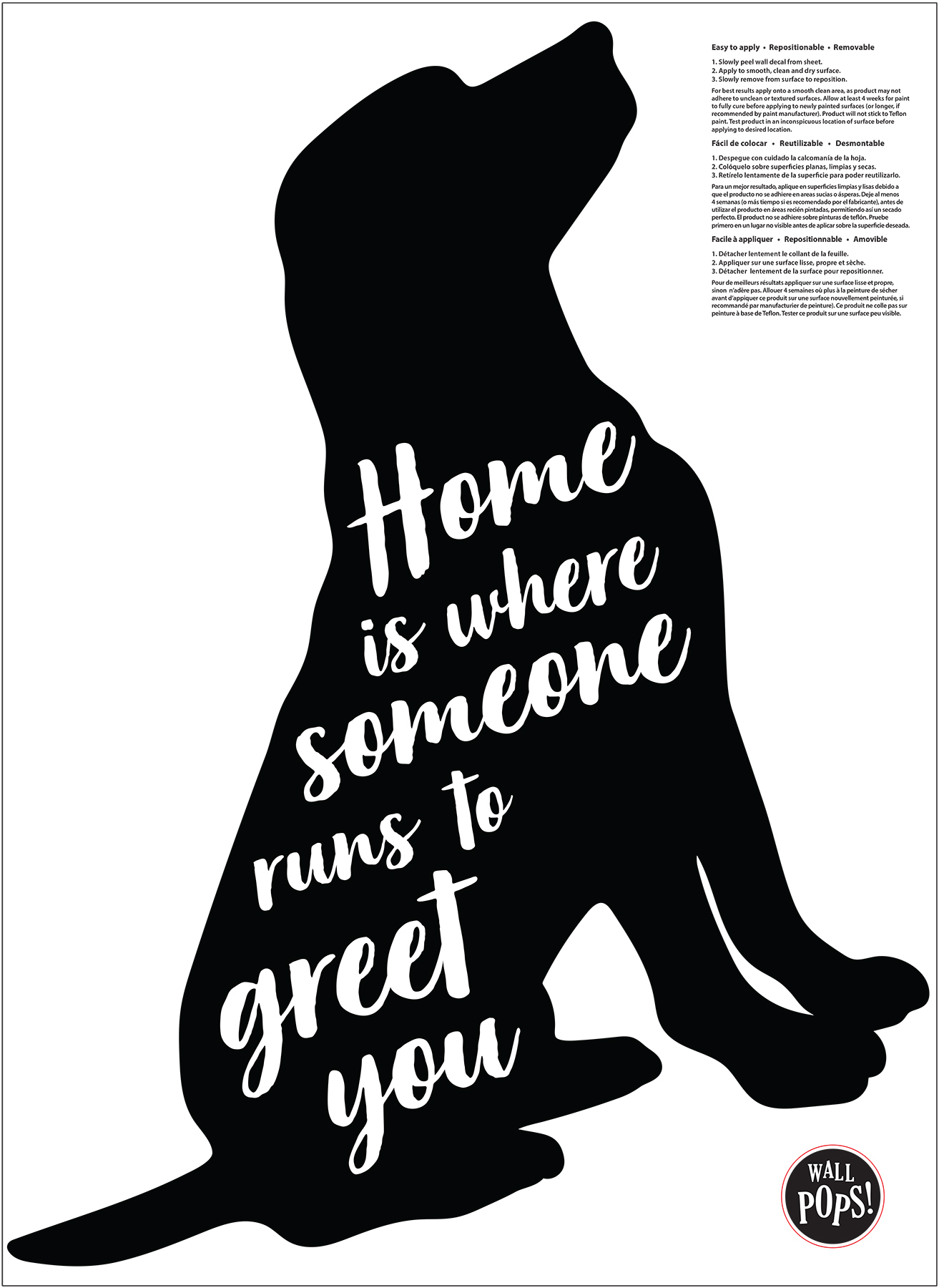 | Description + Bullets | What's better than coming home to your four-legged friend? With the quote, "Home is where someone runs to greet you," and a black dog silhouette, this wall decal is perfect for all dog lovers. Home is Where Someone Wall Quote Decals contain 1 piece on 1 sheet that measures 17.5 x 24 inches. Peel and stick, repositionable; Safe for walls: always removable and leaves no sticky residue; Sticks to most smooth, flat surfaces; Contains 1 piece; Comes on one 17.5-in x 24-in sheet; Perfect for dog lovers |