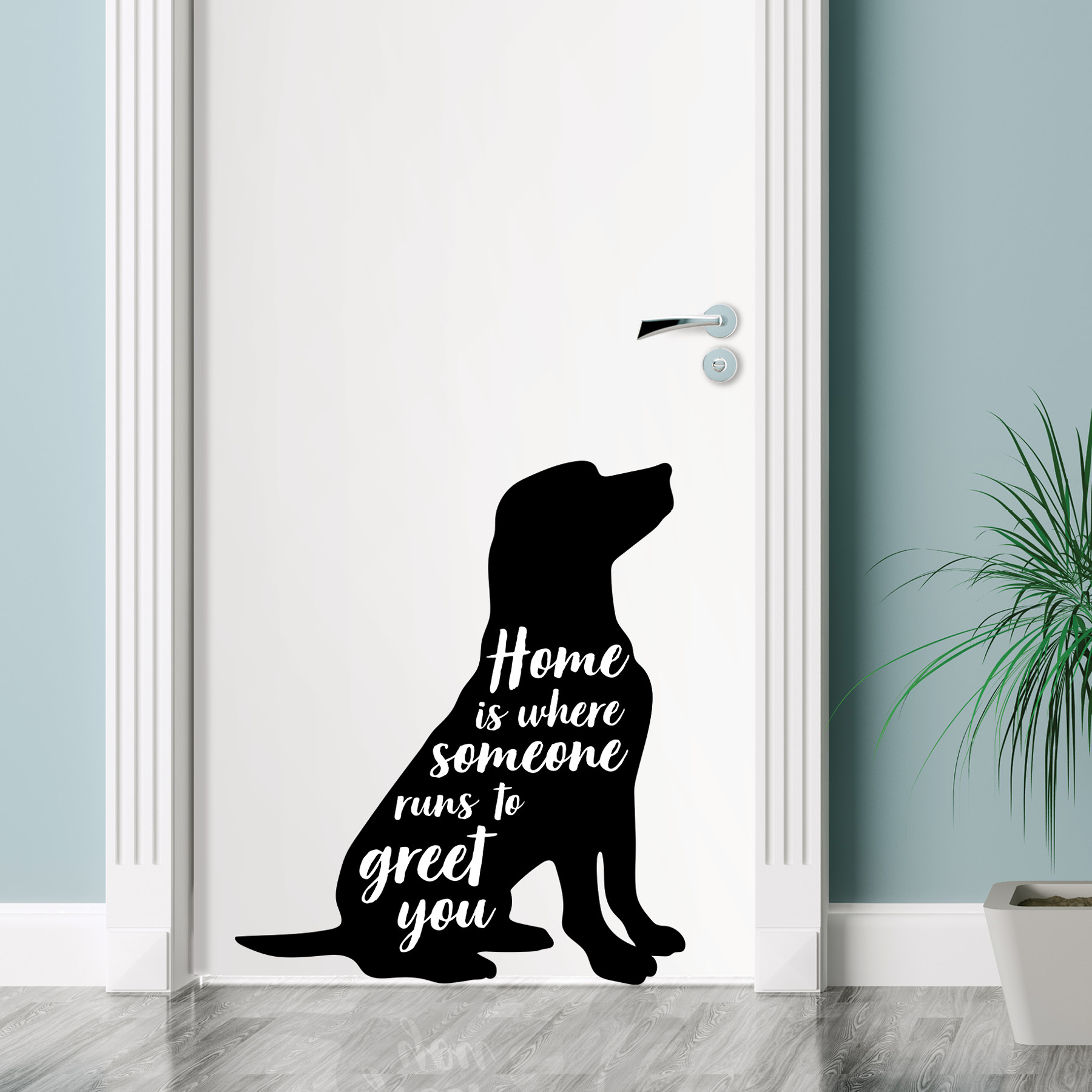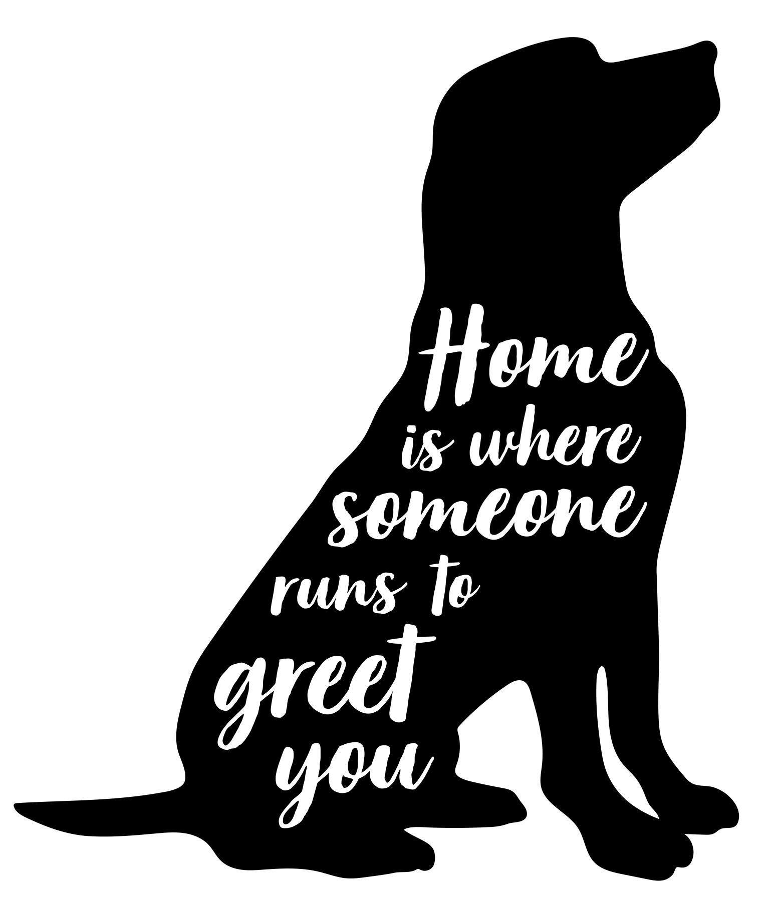 | Dynamic Description | What's better than coming home to your four-legged friend? With the quote, "Home is where someone runs to greet you," and a black dog silhouette, this wall decal is perfect for all dog lovers. Home is Where Someone Wall Quote Decals contain 1 piece on 1 sheet that measures 17.5 x 24 inches. |
