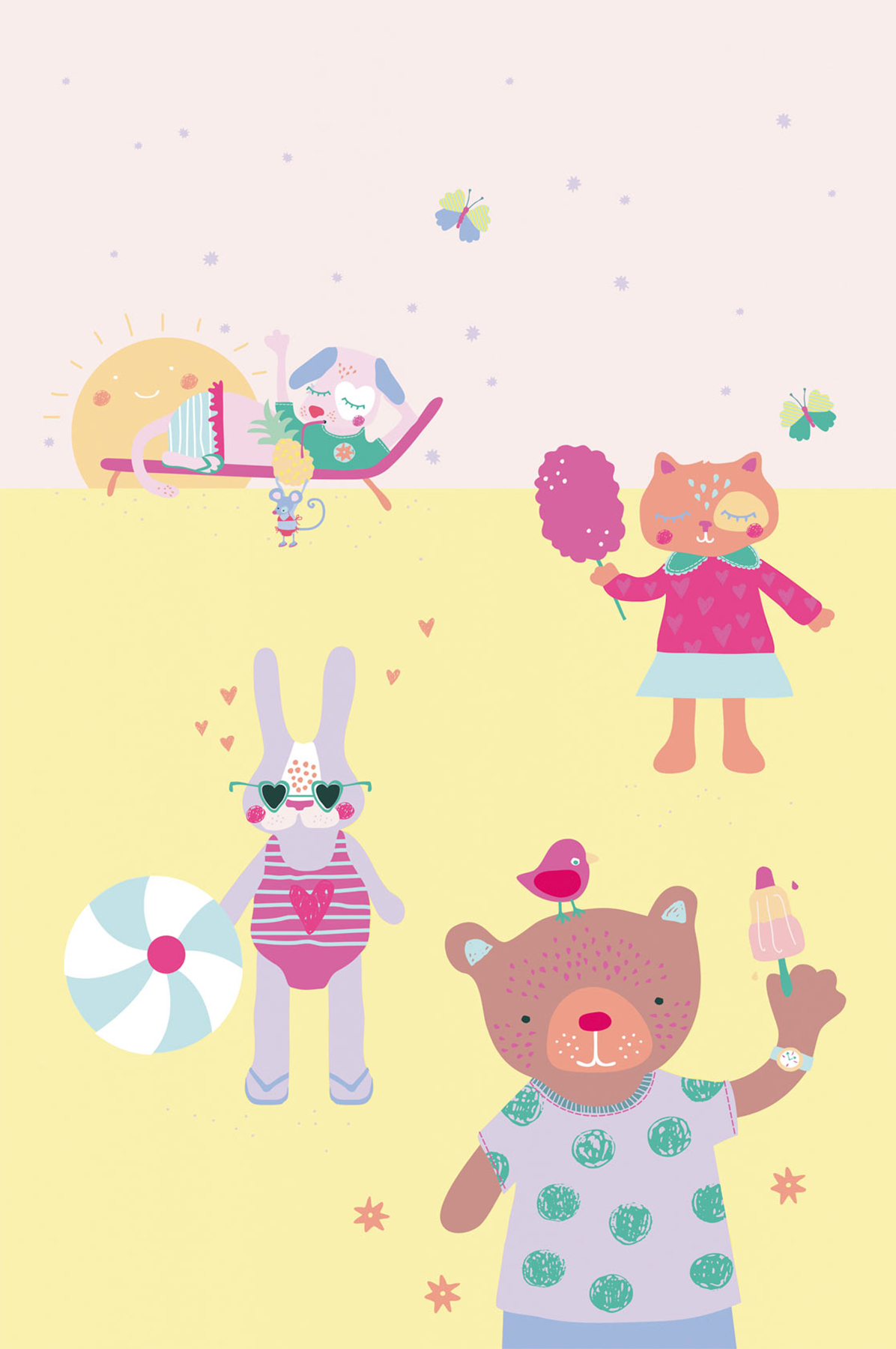 | Dynamic Description | Kick back and relax with this vacation-themed mural. Cartoon creatures enjoy the pastel yellow sand under a pink sky. Comes in 4 panels that measure 9 feet 2 inches tall x 6 feet 1 inch wide when assembled. |