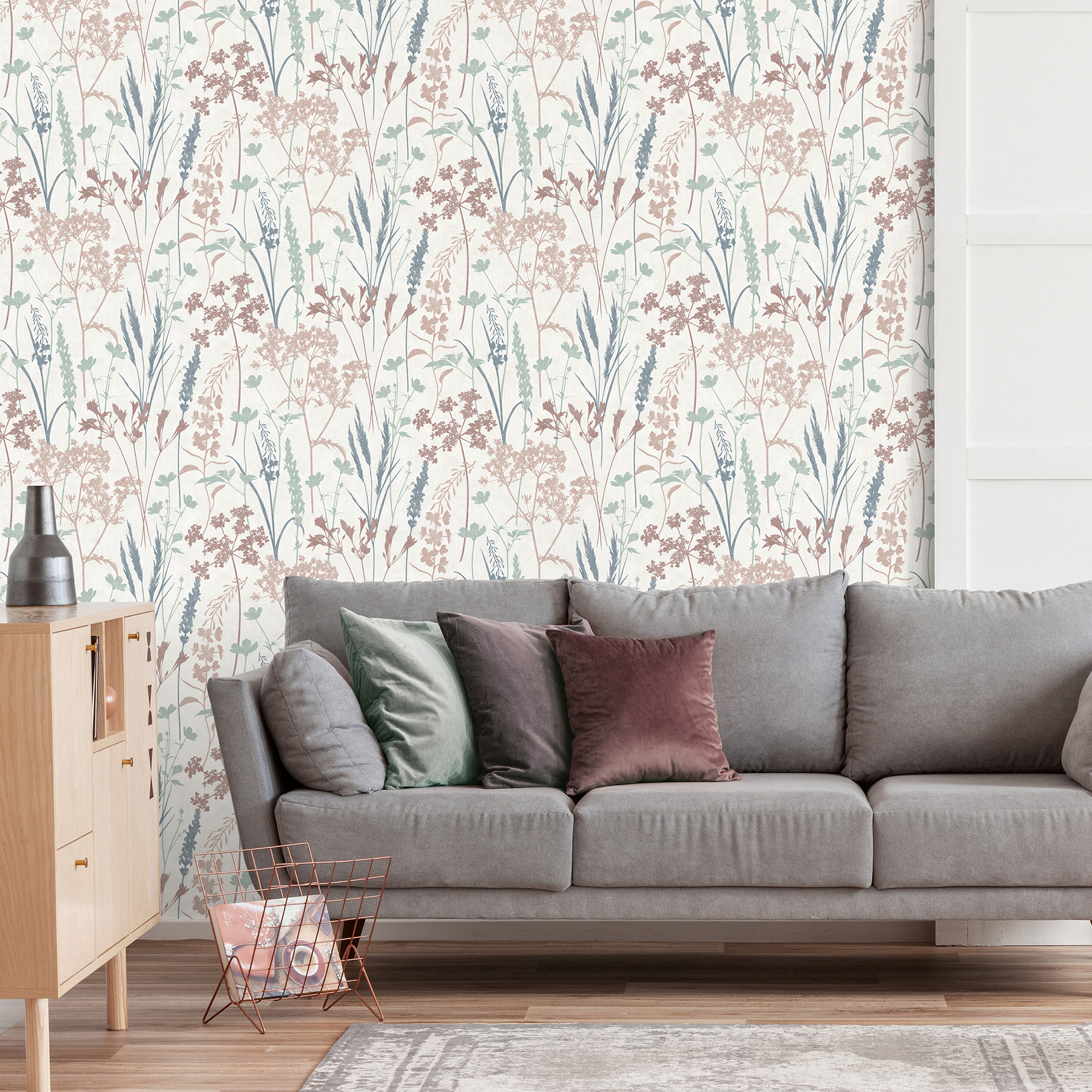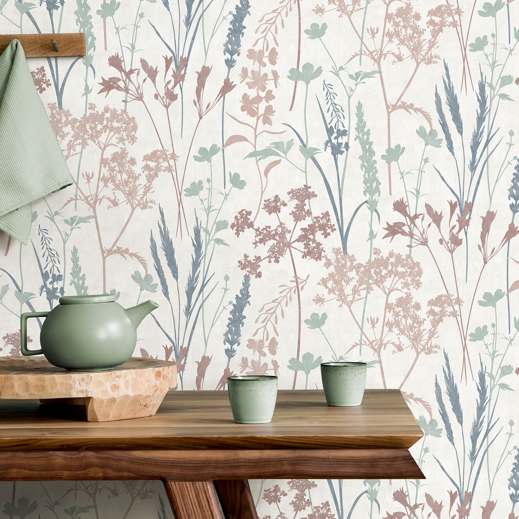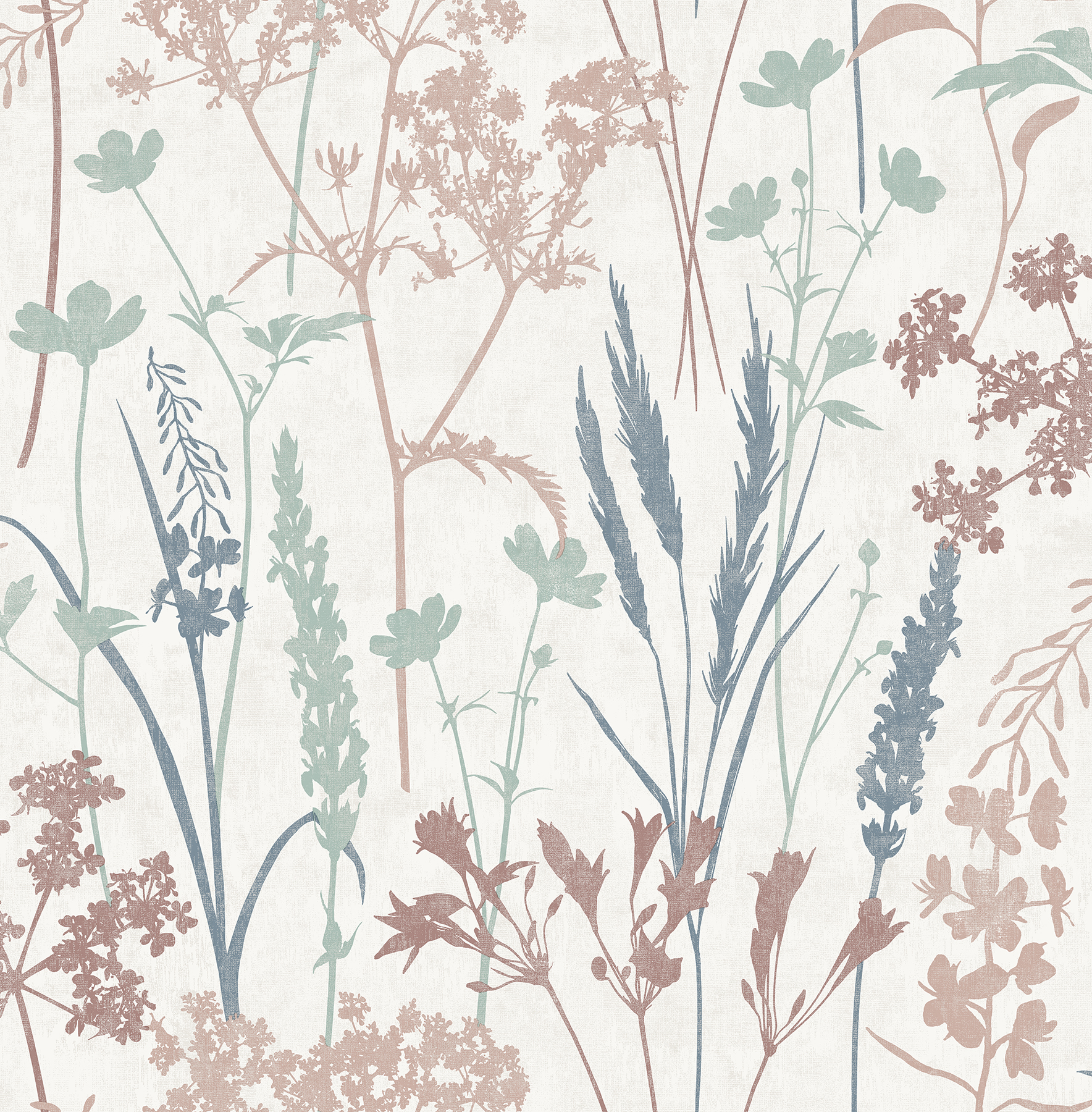 | Dynamic Description | Simple silhouettes of wildflowers and grasses bring natural elegance to your home. Seen here in denim blue, sage, blush, and faded raspberry against crisp white. Nanette is an unpasted, paper wallpaper measuring 20.5 inches wide by 33 feet long, covering approximately 56.4 square feet per roll. |