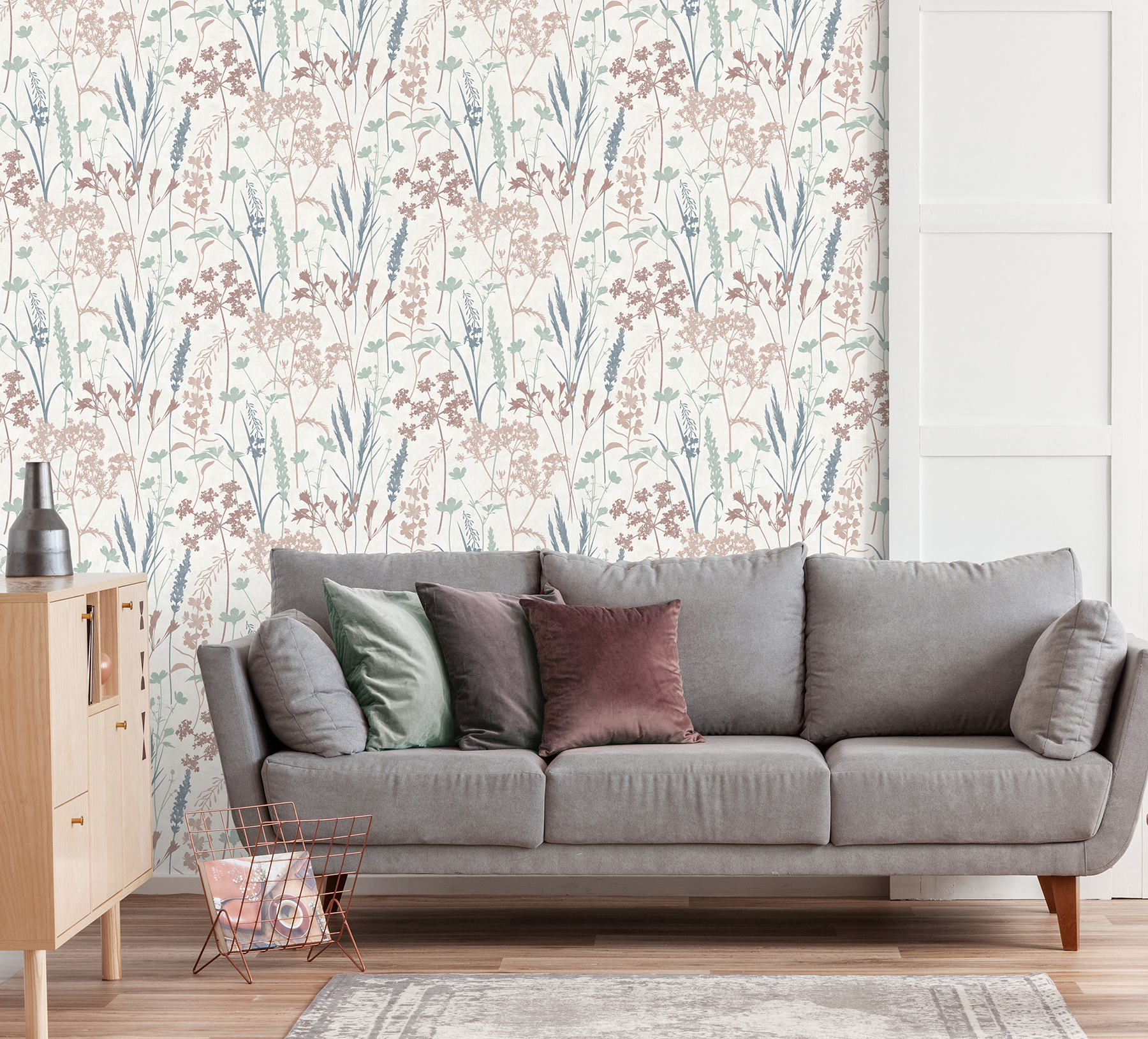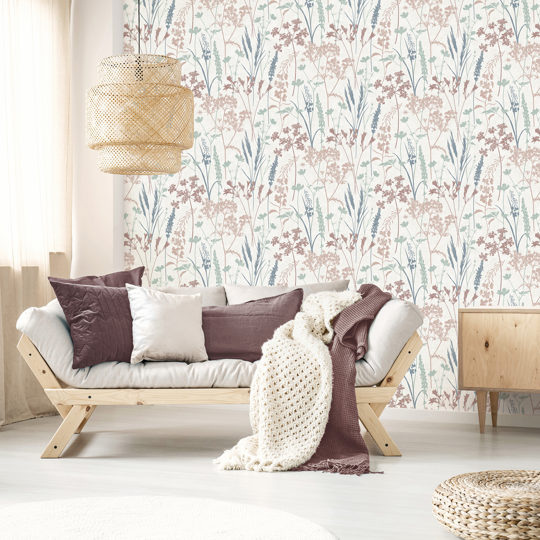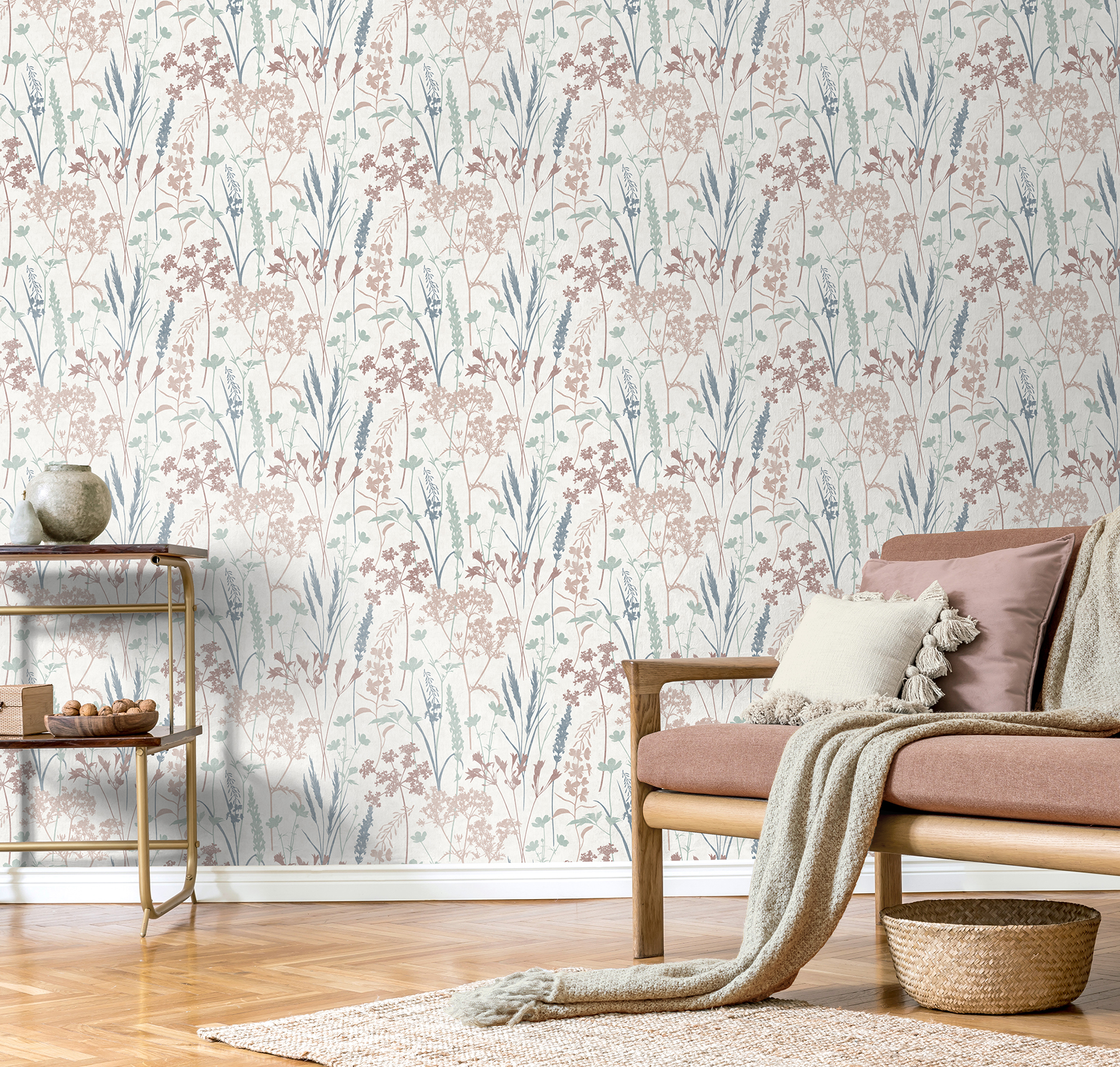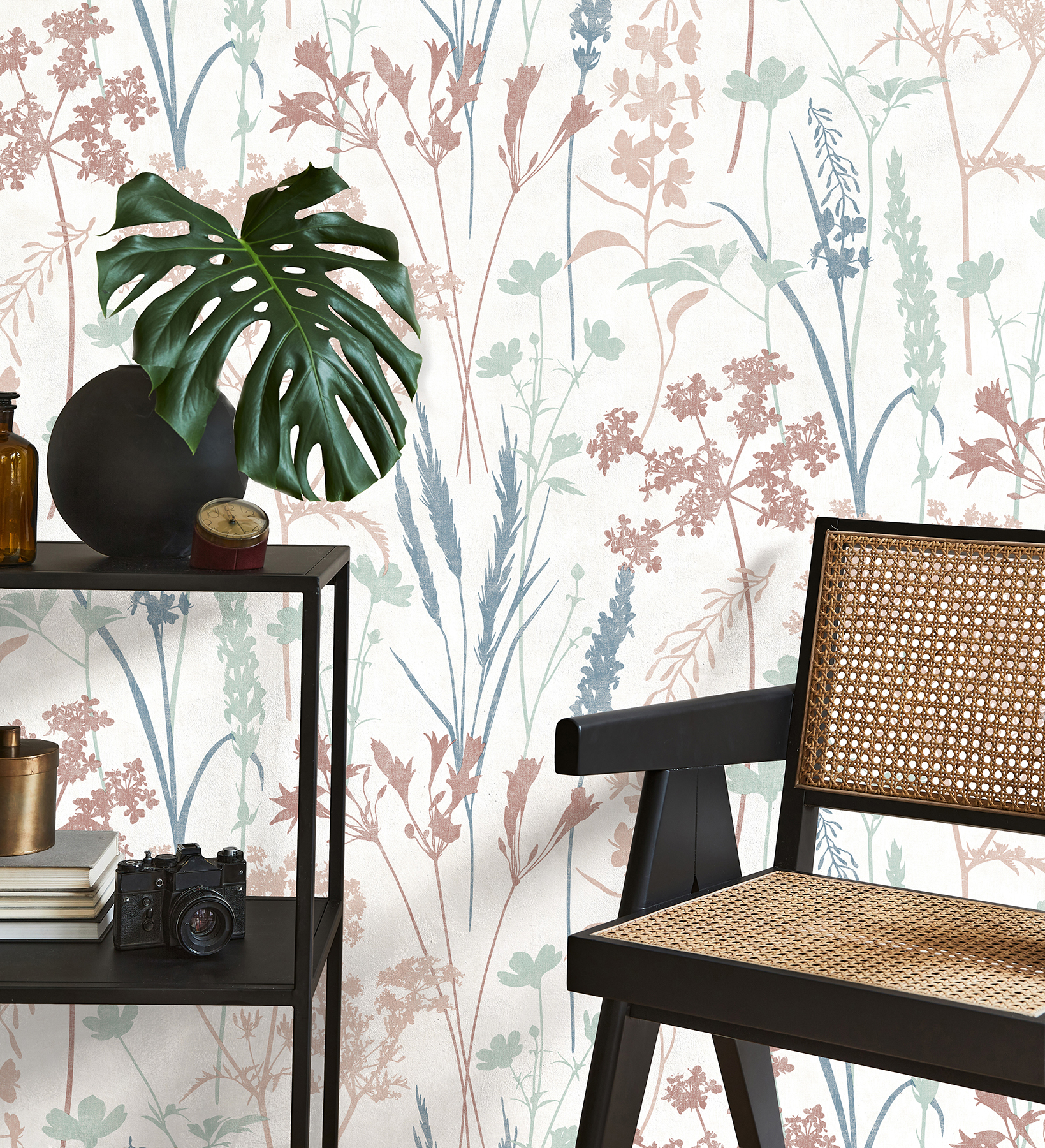| Dynamic Description (French) | Les silhouettes simples de fleurs sauvages et d'herbes apportent une élégance naturelle à votre intérieur. Ici, en bleu denim, sauge, rose pâle et framboise délavé sur fond blanc éclatant. Nanette est un papier peint non encollé, mesurant 52 cm de large sur 10 m de long, couvrant environ 5,2 m² par rouleau. |