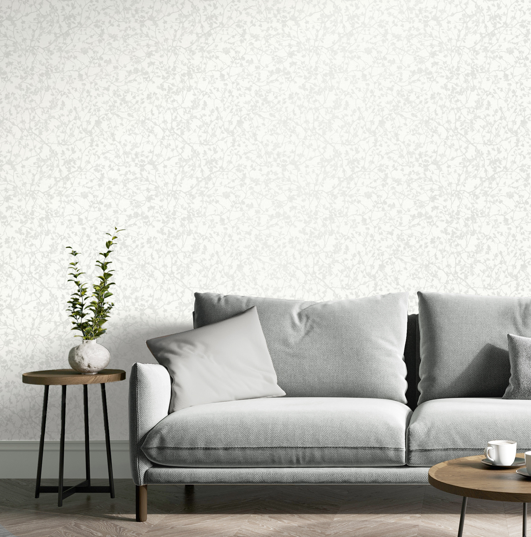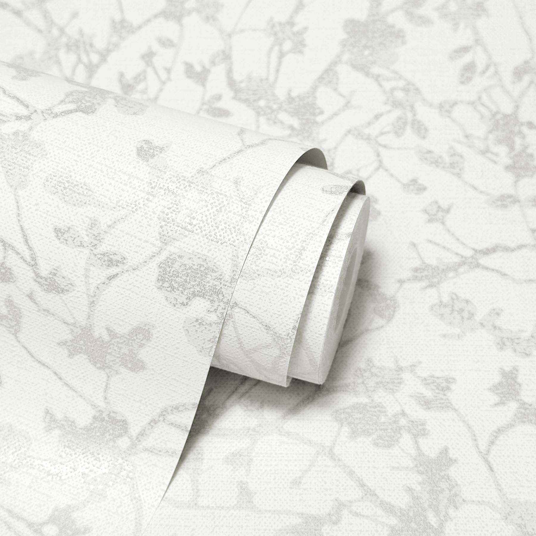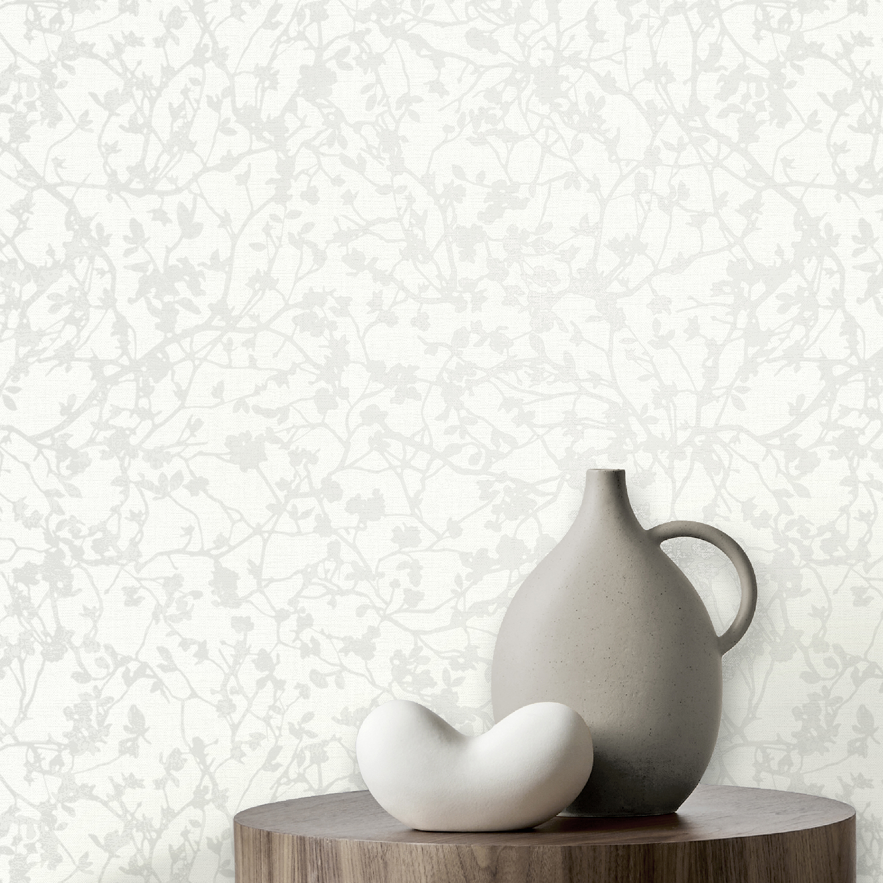 | Dynamic Description | Silhouettes of branches are naturally embellished with the first delicate buds of spring. Featured here in pale grey against white. Jaya is an unpasted, non woven wallpaper measuring 20.5 inches wide by 33 feet long, covering approximately 56.4 square feet per roll. |