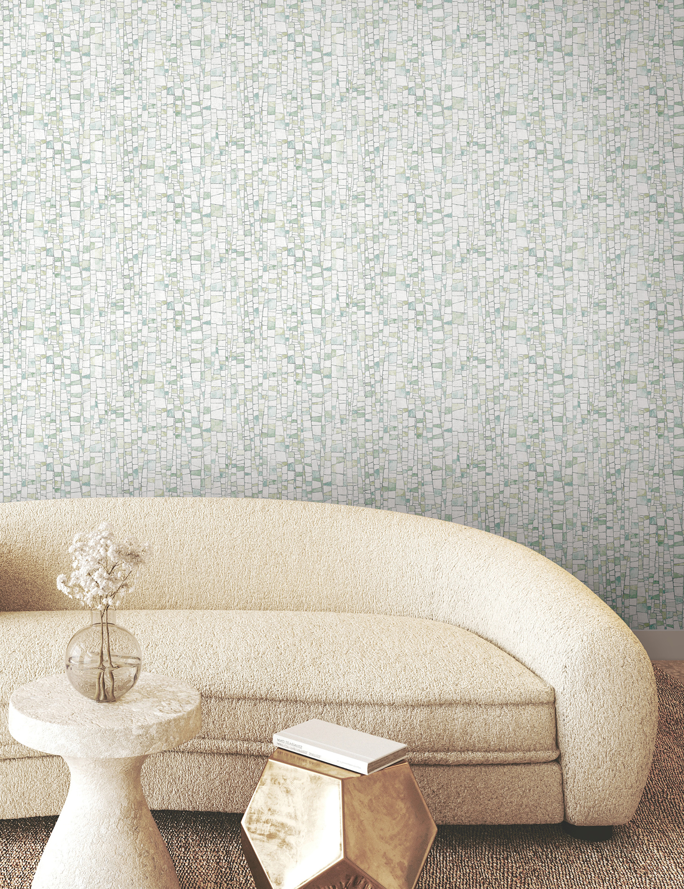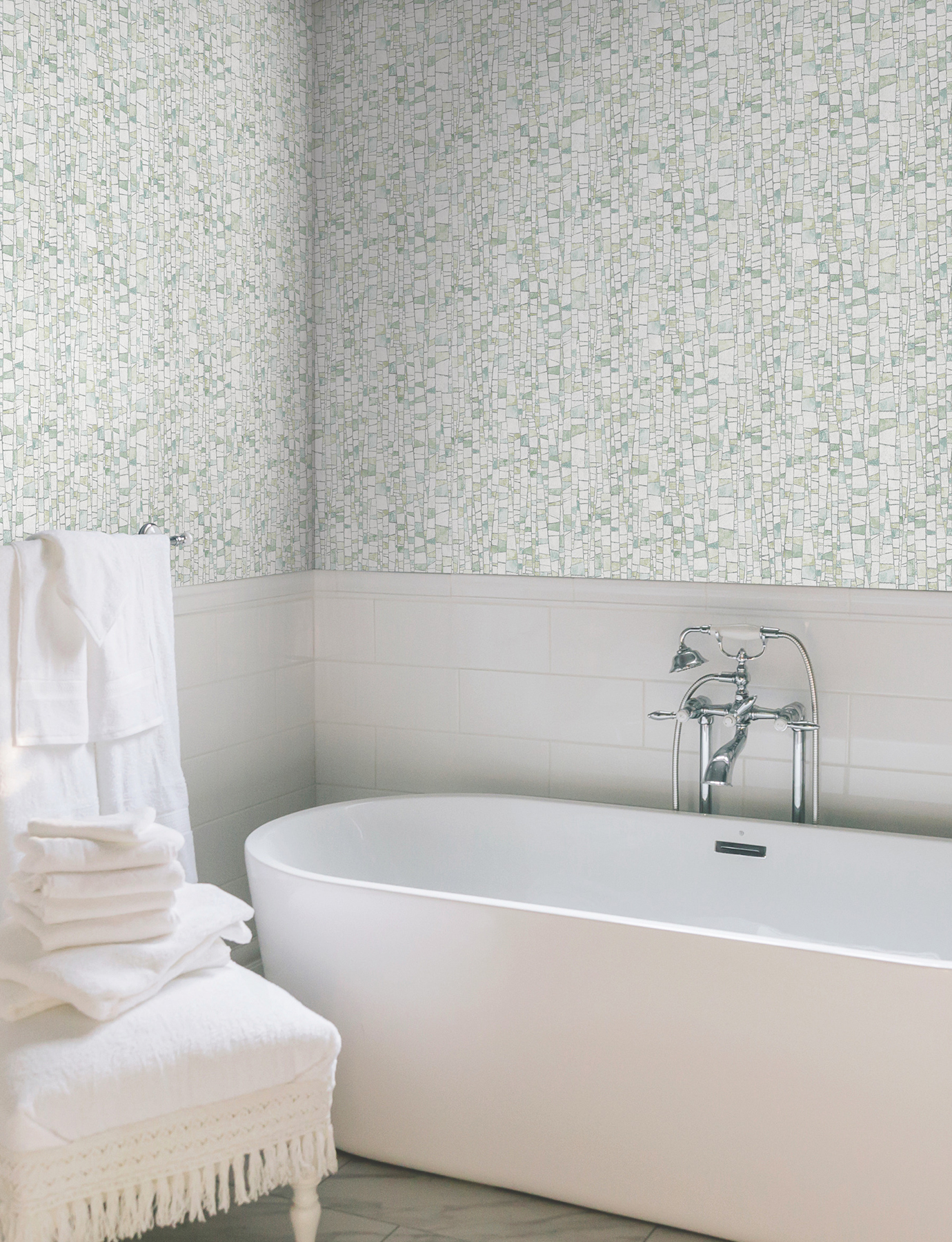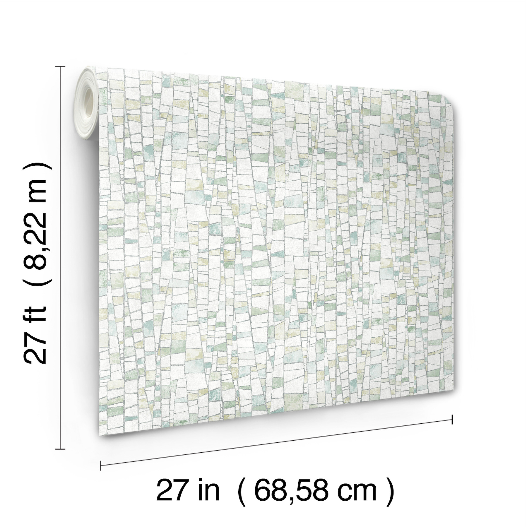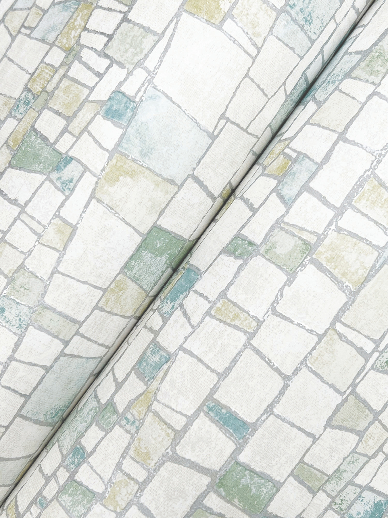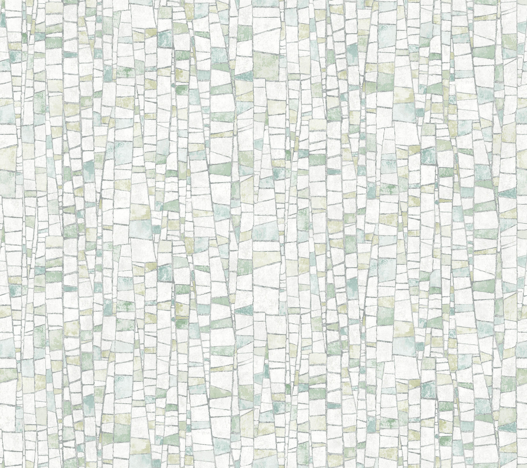 | Dynamic Description | The mosaic-like tiling of design Kaleidoscopic strikes the perfect balance of rustic and refined, featuring a variety of spring greens, creamy white, and grey accented by metallic silver highlights. This Kaleidoscopic Wallpaper measures approximately 27 inches wide by 27 feet long, measuring approximately 60.8 square feet per roll. Textural, organic forms grounded in earthly inspiration. |