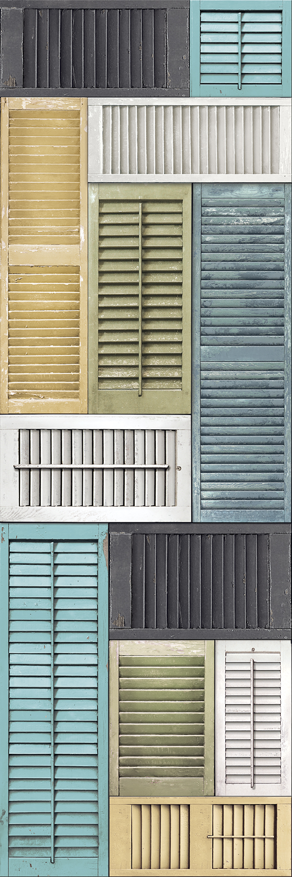 | Dynamic Description | This stunning wall mural gives the look of a wall full of vintage shutters. Blues, greens, yellows, and whites make for a modern color palette that nods to the past. Peeling paint and worn edges add character to this unique design. |
