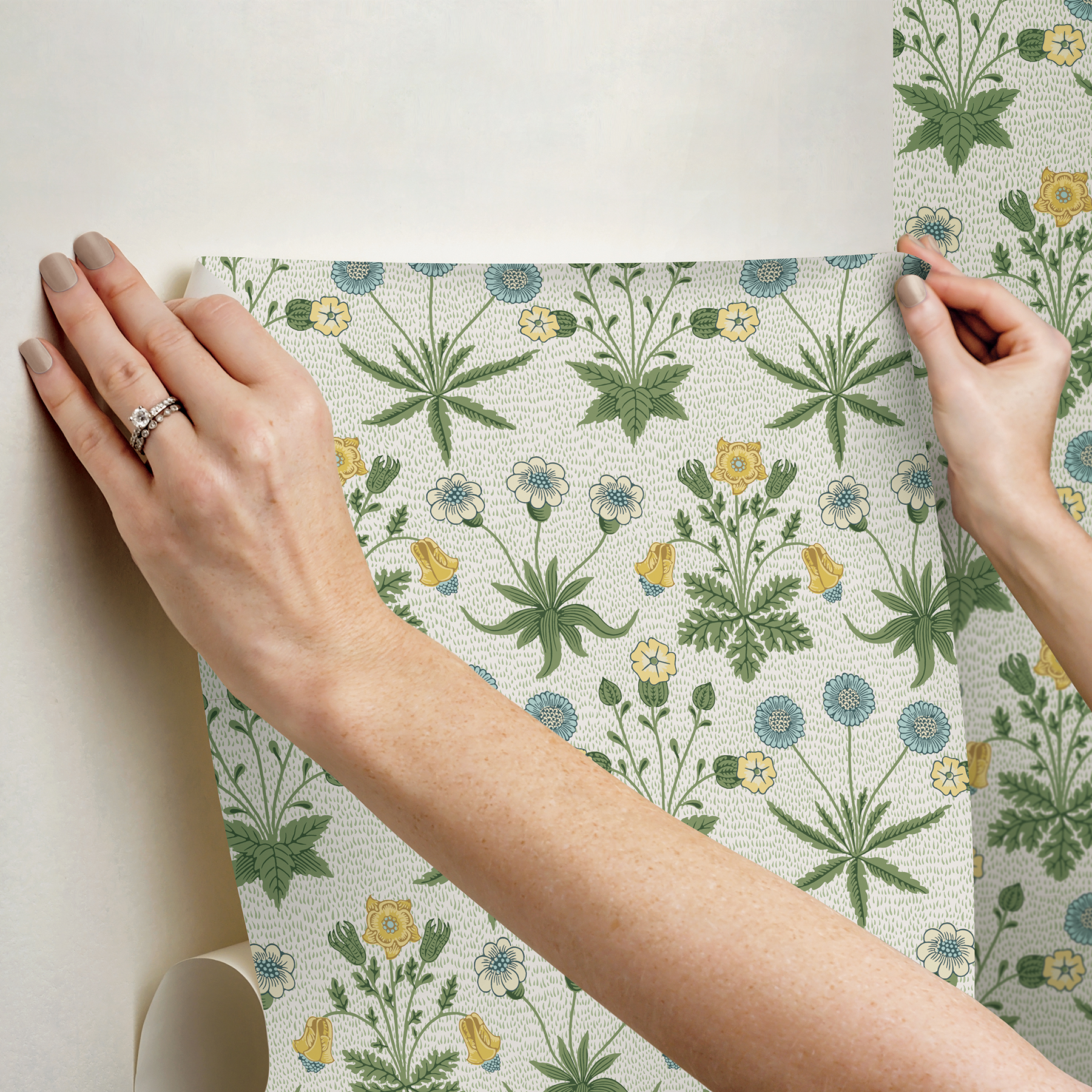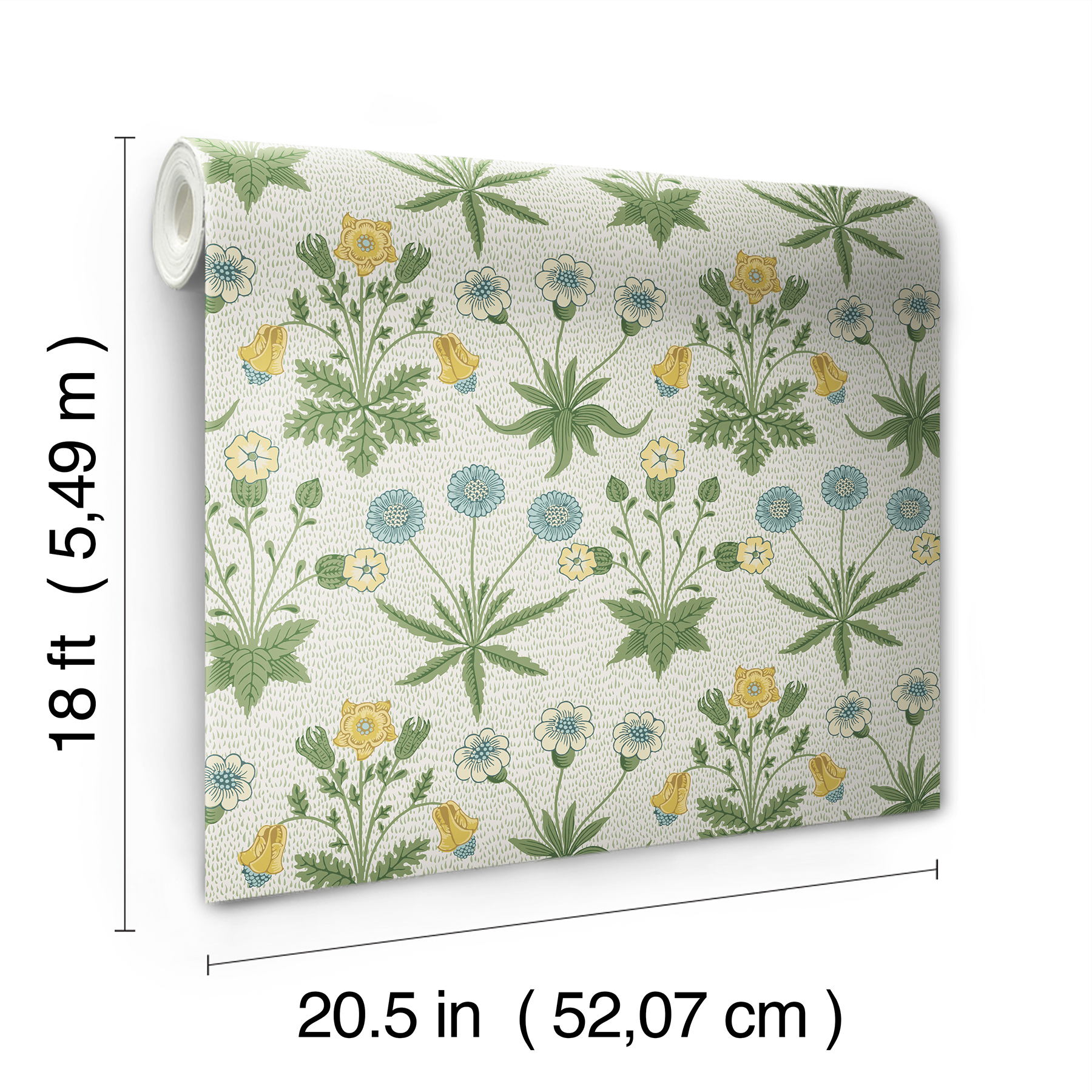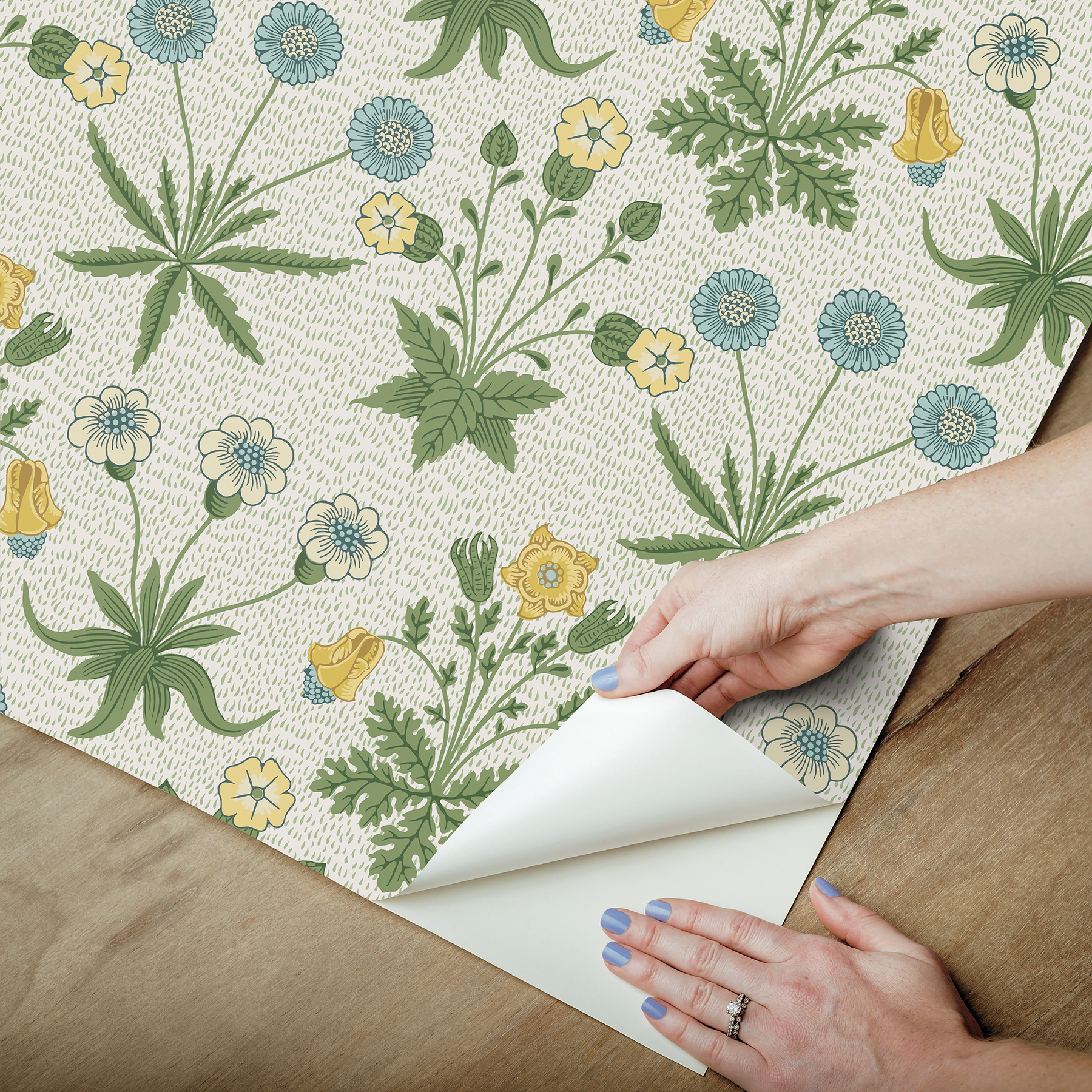 | Dynamic Description | Daisy features clusters of blooms and slender stems arranged with classic Morris & Co. precision. The result is a light, lyrical print that feels both nostalgic and fresh in any space. Daisy Saffron and Thyme Peel and Stick Wallpaper comes on one roll that measures 20.5 inches wide by 18 feet long. |