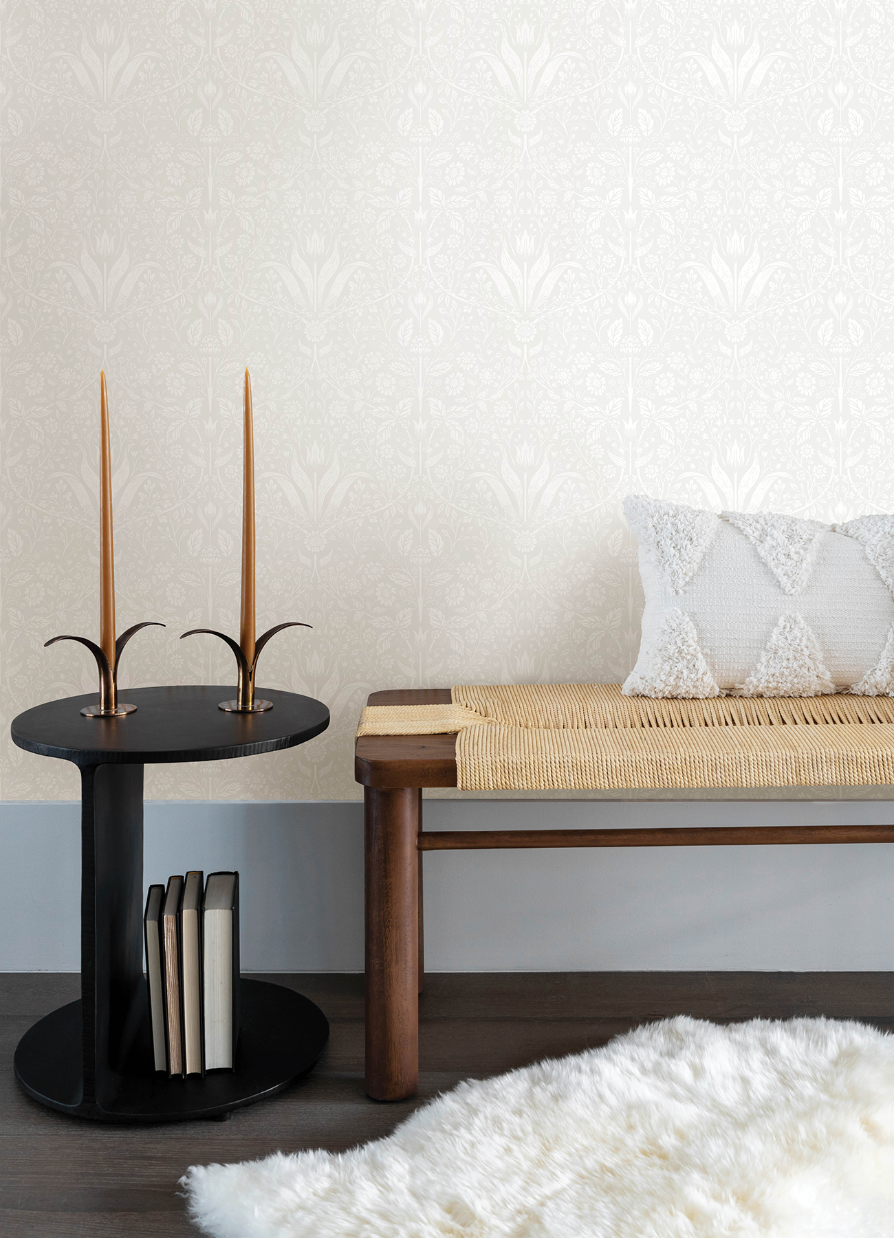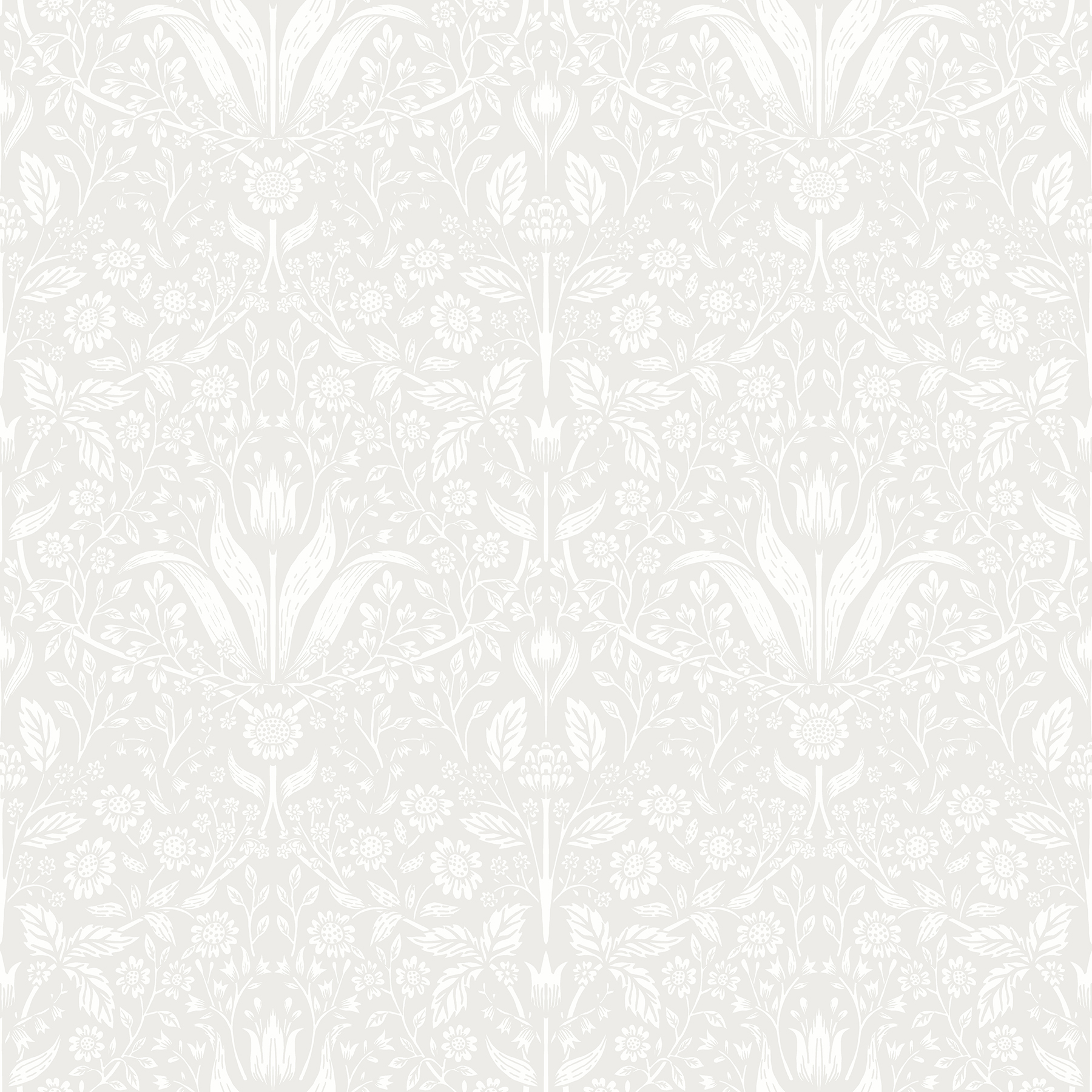 | Description + Bullets | The first blooms of spring take center stage in this charming ogee wallpaper. Tulips, daises, and other first-of-the-season flowers are delicately illustrated in white against a light grey backdrop. Mara is an unpasted, non woven wallpaper measuring 20.9 inches wide by 33 feet long, covering approximately 57.5 square feet per roll. Unpasted non woven material; 20.9-in repeat, straight match; Washable and strippable; 20.9-in by 33-ft long roll; Covers about 57.5 square feet |