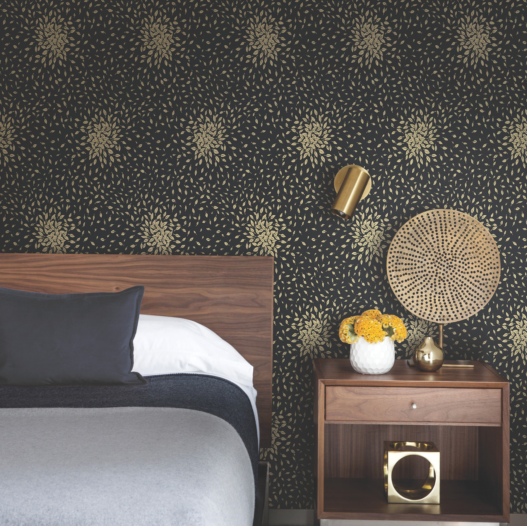 | Description + Bullets | A bluster and flurry of metallic shapes are created by the swirling silhouette pattern of Petite Leaves, shown in jet black and vintage gold metallic. This Petite Leaves Wallpaper measures approximately 27 inches wide by 26.9 feet long, measuring approximately 60.5 square feet per roll. The long awaited follow-up to the popular first release, Modern Metals Second Edition energizes contemporary spaces with charismatic visual artistry defined by the allure of luminous metallic. Unpasted non woven material; 25.2-in repeat, straight match; Washable and strippable; 27-in by 26.9-ft long roll; Covers about 60.5 square feet |