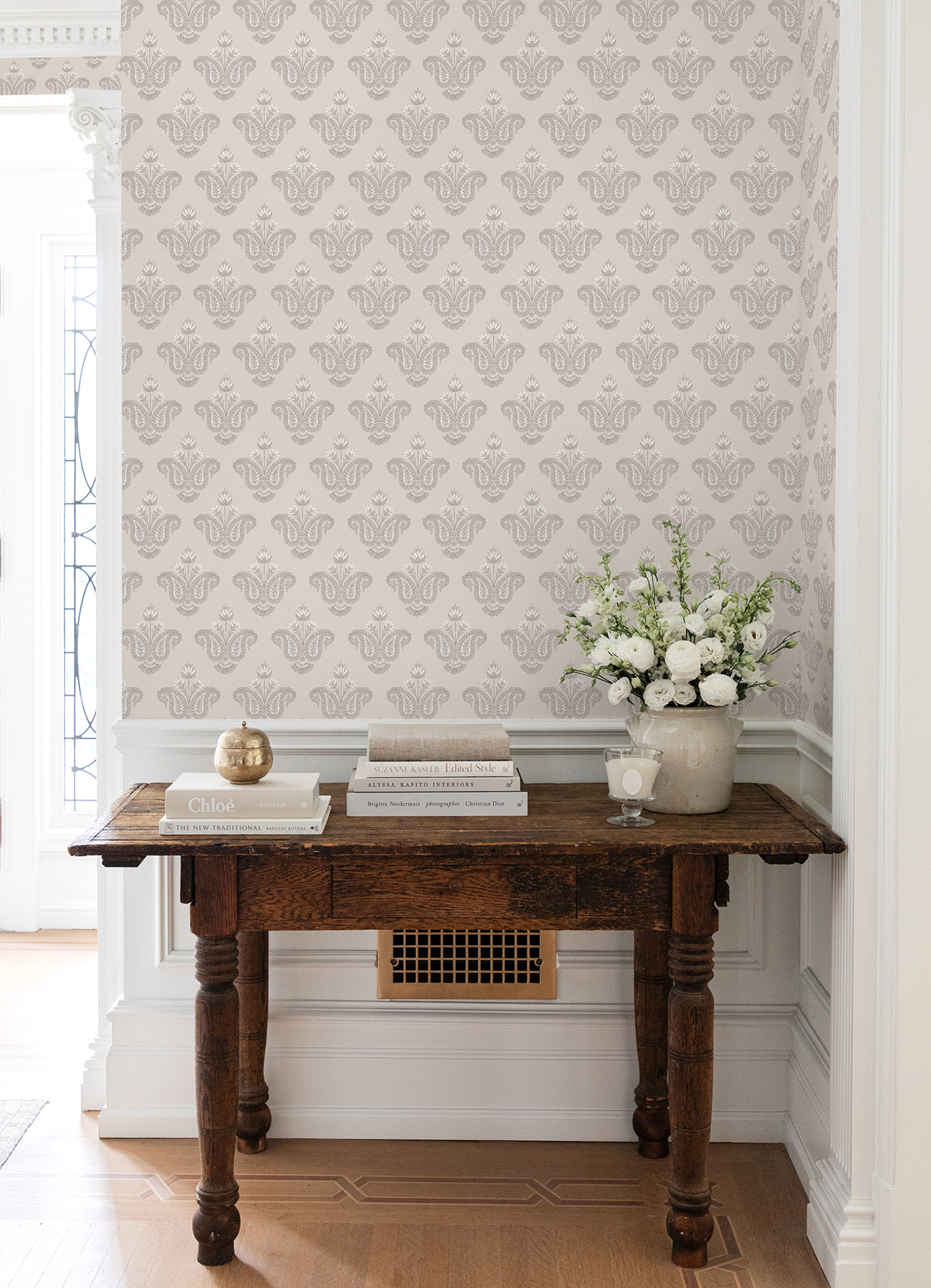 | Bullet Point 1 | Warm brown and taupe floral damask peel and stick wallpaper designed for Nabela Noor Home x WallPops |