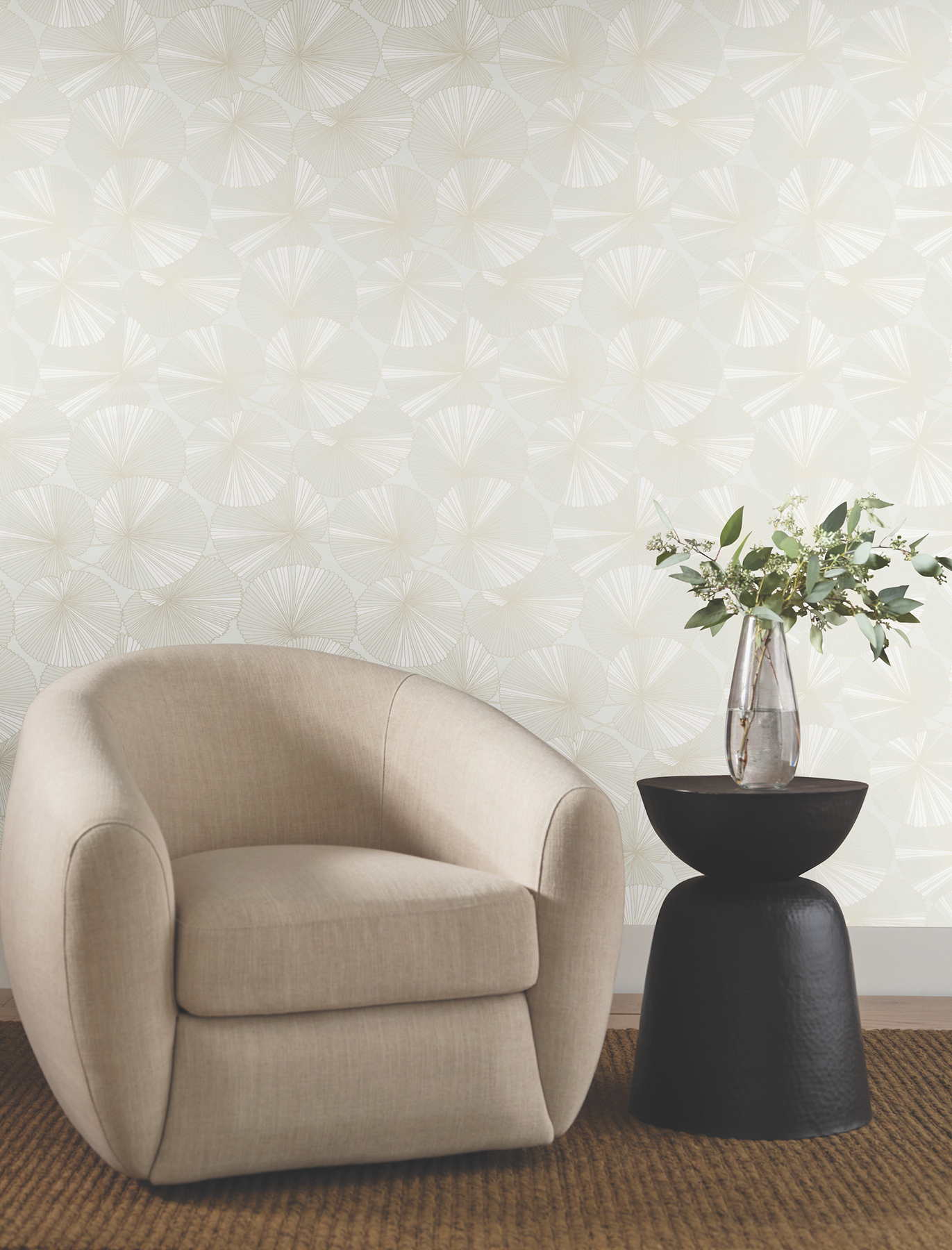 | Description + Bullets | The circular leaves of this flowering aquatic herb emerge and float across the stillness of the water's surface in the pattern Layered Lily Pads, shown in white with champagne gold. This Layered Lily Pads Wallpaper measures approximately 27 inches wide by 27 feet long, measuring approximately 60.8 square feet per roll. Finding beauty in this extraordinary organic world. Unpasted non woven material; 25.25-in repeat, straight match; Washable and strippable; 27-in by 27-ft long roll; Covers about 60.8 square feet |