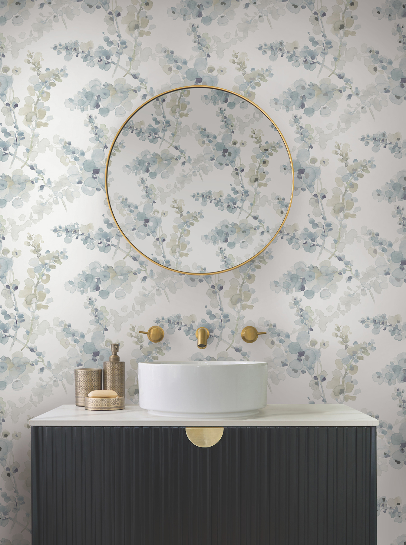 | Description + Bullets | Stems of frothy petals from a watercolor garden portfolio make Blossom Fling a vivacious classic with fresh perspective. Seen here in a palette of blue, moss, and pale grey with metallic silver accents. This Blossom Fling Peel + Stick Wallpaper measures approximately 27 inches wide by 20 feet long, measuring approximately 45 square feet per roll. Candice Olson’s celebrated signature of current yet timeless design inspires these popular additions to her Premium Peel + Stick product offering. This is Simply Candice. Peel & Stick non woven material; 24-in repeat, straight match; Washable and fully removable; 27-in by 20-ft long roll; Covers about 45 square feet |