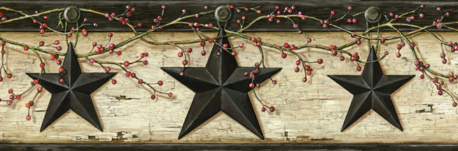 | Description + Bullets | This rustic tin star border with berry sprigs will make you feel like you are surrounded by a country canopy, year-round. Prepasted easy walls material; Frame the room with this lovely border; Washable and strippable; 6-in by 15-ft long roll; Covers about 7.5 square feet |