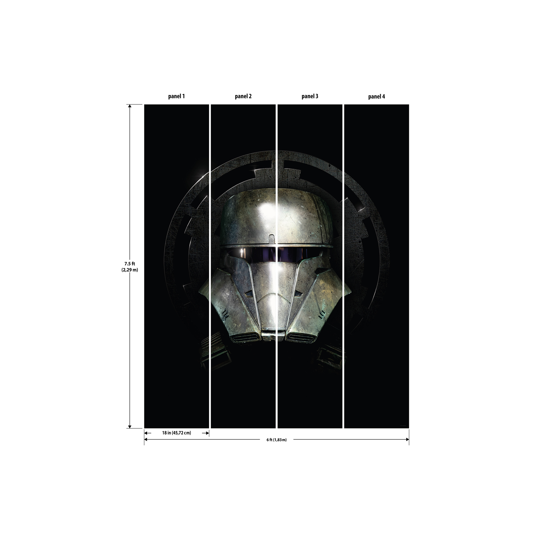 | Dynamic Description | Show your loyalty for the Mandalorian with this officially-licensed Star Wars peel and stick wallpaper mural. Arranged on 4 panels, once assembled, this mural features the Mandalorian helmet from the hit Disney+ series. Installation is as simple as Peel, Stick…Done!™ |