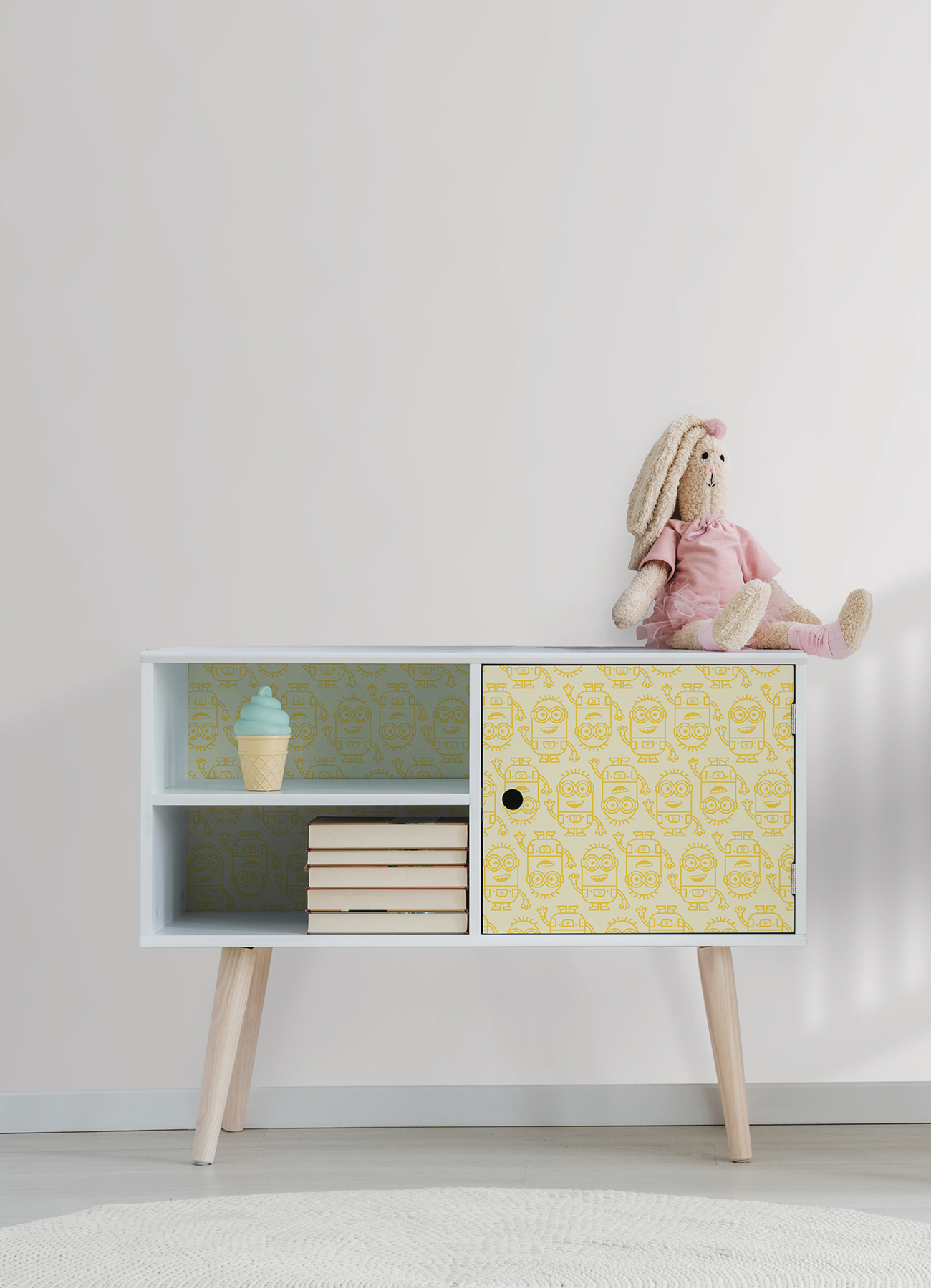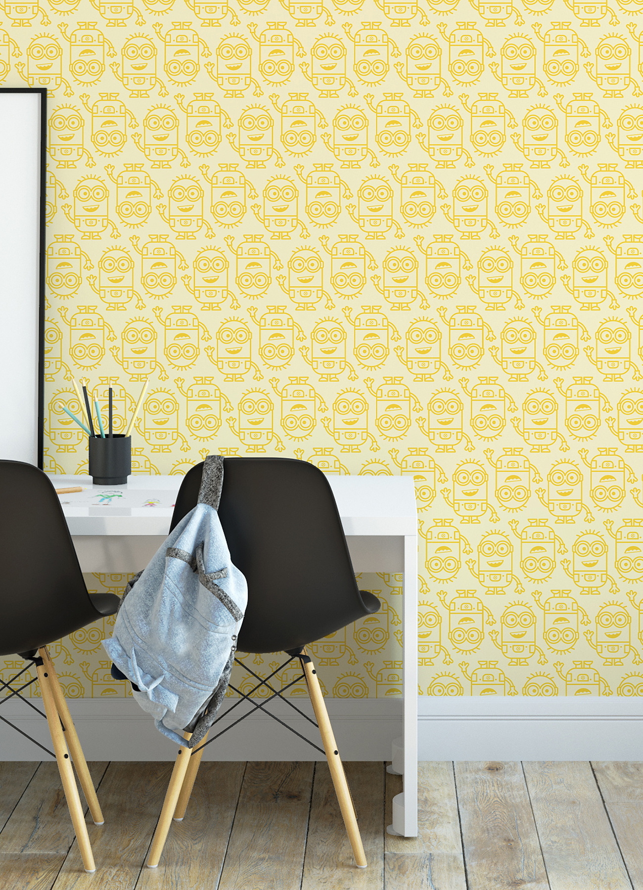 | Bullet Point 1 | Officially-licensed Minions peel and stick wallpaper with yellow linework imagery of the Minions |