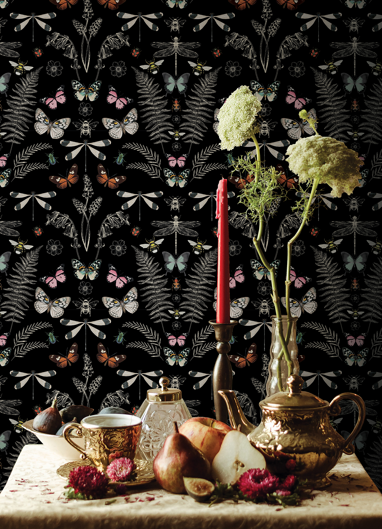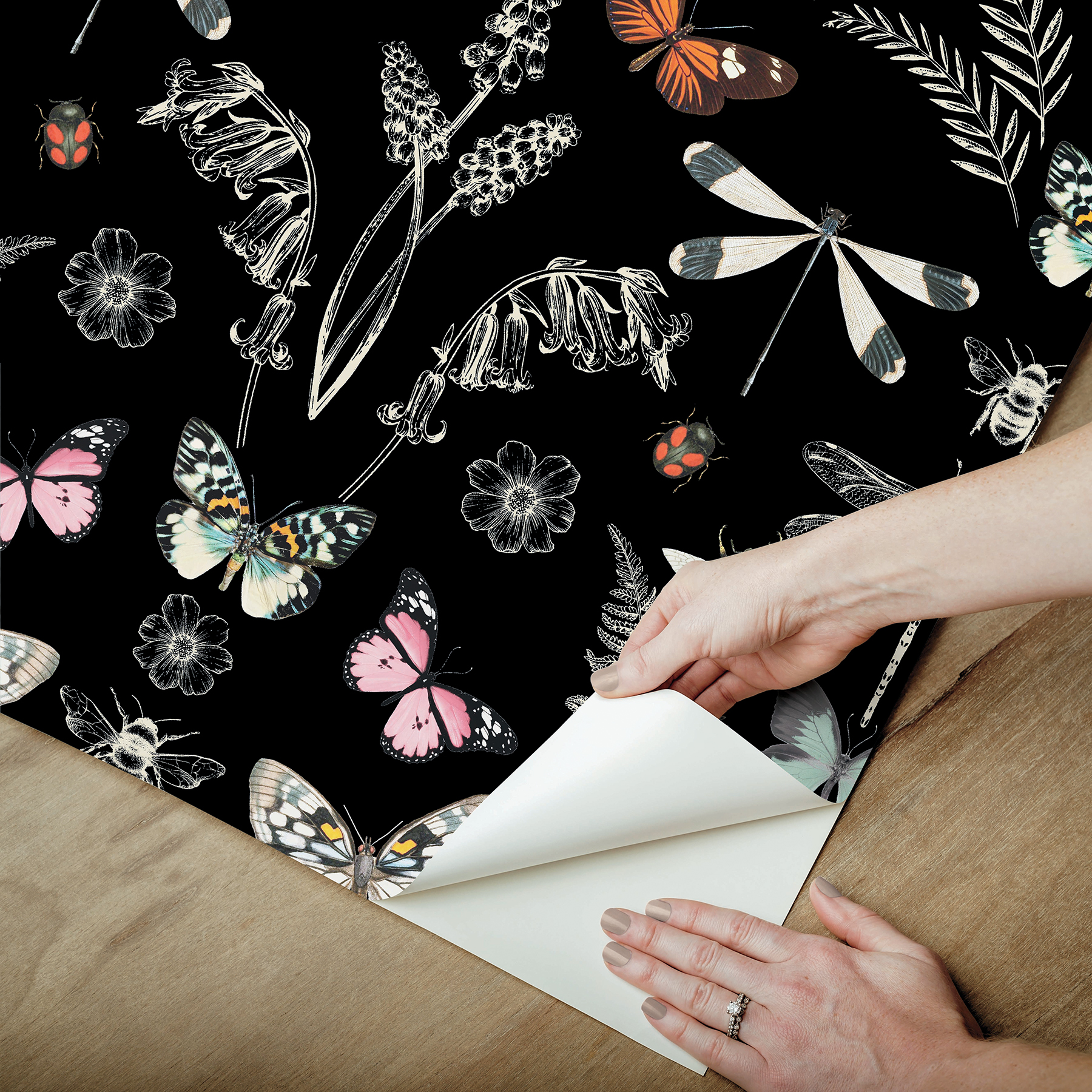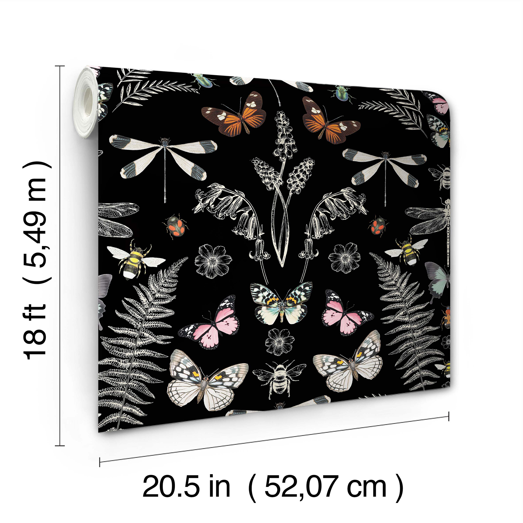 | Dynamic Description | Inspired by the vintage botanical and insect displays full of curiosities and creatures, this peel and stick wallpaper is a great accent for any space in need of some bookish charm. A variety of insects and lush fronds are arranged over a black backdrop. Installation is as simple as Peel, Stick...Done!™ Hidden Treasures Black Peel and Stick Wallpaper comes on one roll that measures 20.5 inches wide by 18 feet long. |