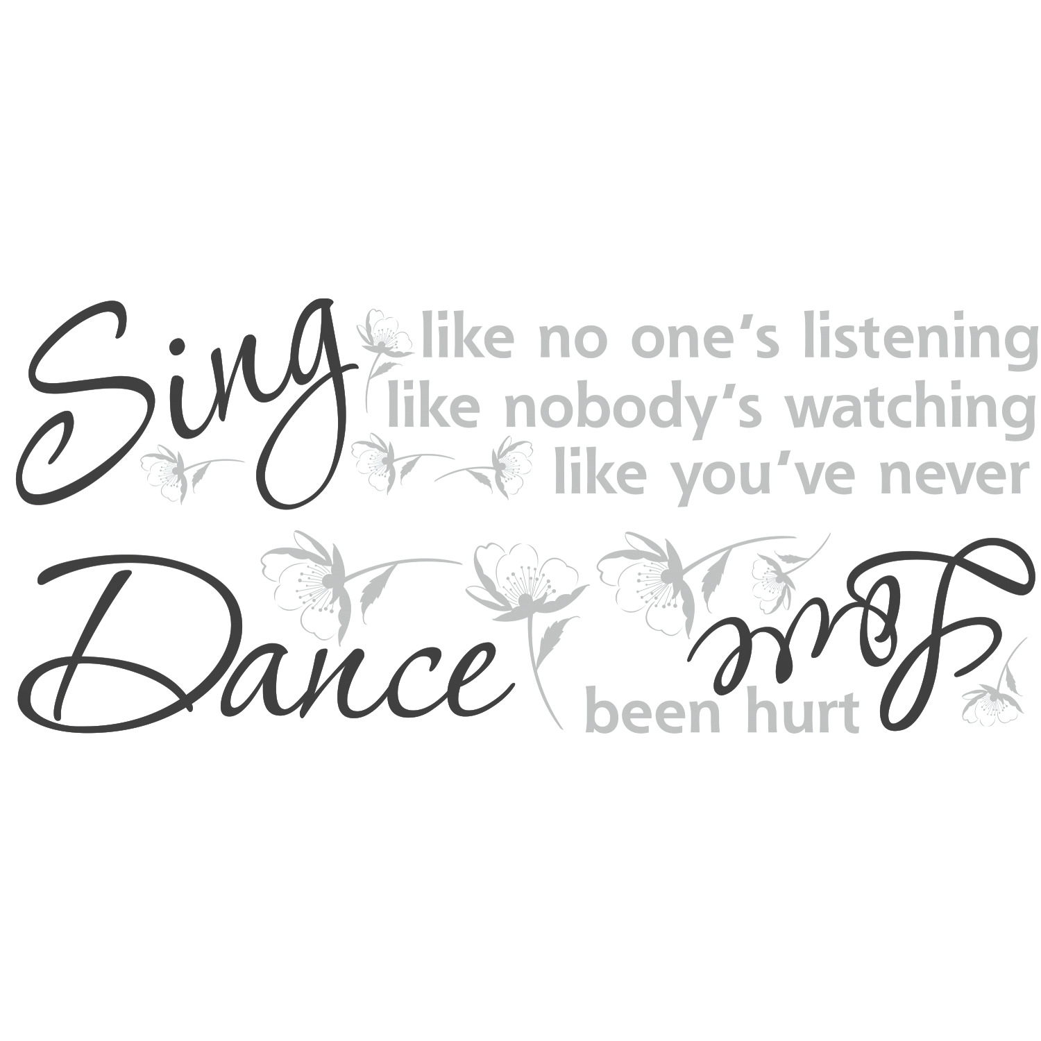 | Dynamic Description | Sing like no one's listening, dance like nobody's watching, and love like you've never been hurt--these are words to live by. Add these beautiful phrases to any wall with this elegant set of stickers. Since each word and accent is individually cut, you can place each piece on walls, furniture, stairs, or any other smooth surface. You can even use the added decorative accents to spruce up other pieces or places in your home! |