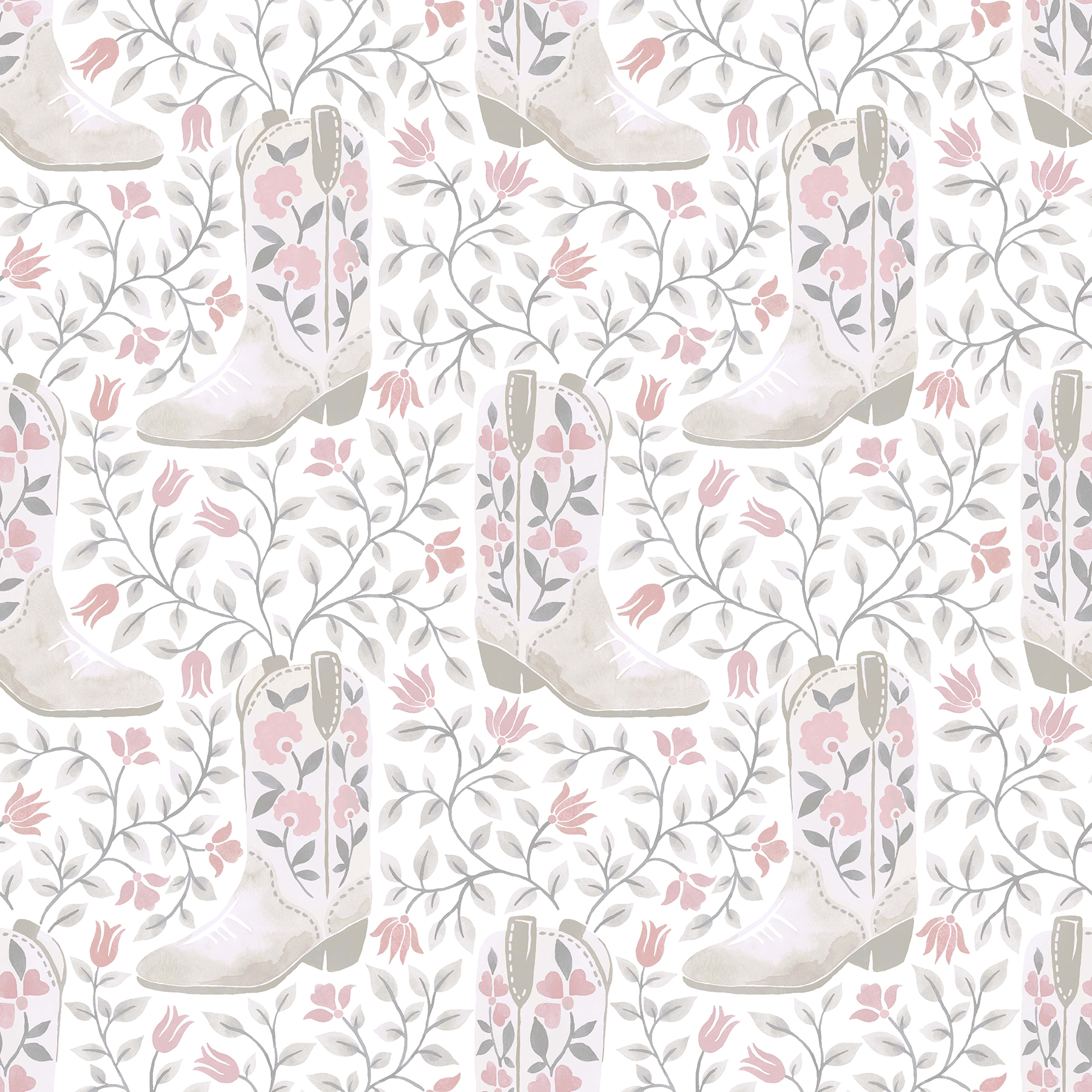 | Description + Bullets | Pink and white floral cowboy boot peel and stick wallpaper print; Peel and stick to apply, pull up to remove; RoomMates is safe for walls and leaves no sticky residue behind; Easily repositionable while installing; RoomMates sticks to any smooth, flat surface - perfect for DIY projects; Ideal for rental or home decorating; Comes on a 20.5-in x 18-ft roll and covers about 30.8 sq. ft; Design repeat of 10.25-in; This product should NOT be applied to textured walls - smooth clean, dry, painted surface only (no Non-Stick paint or soap residue) |