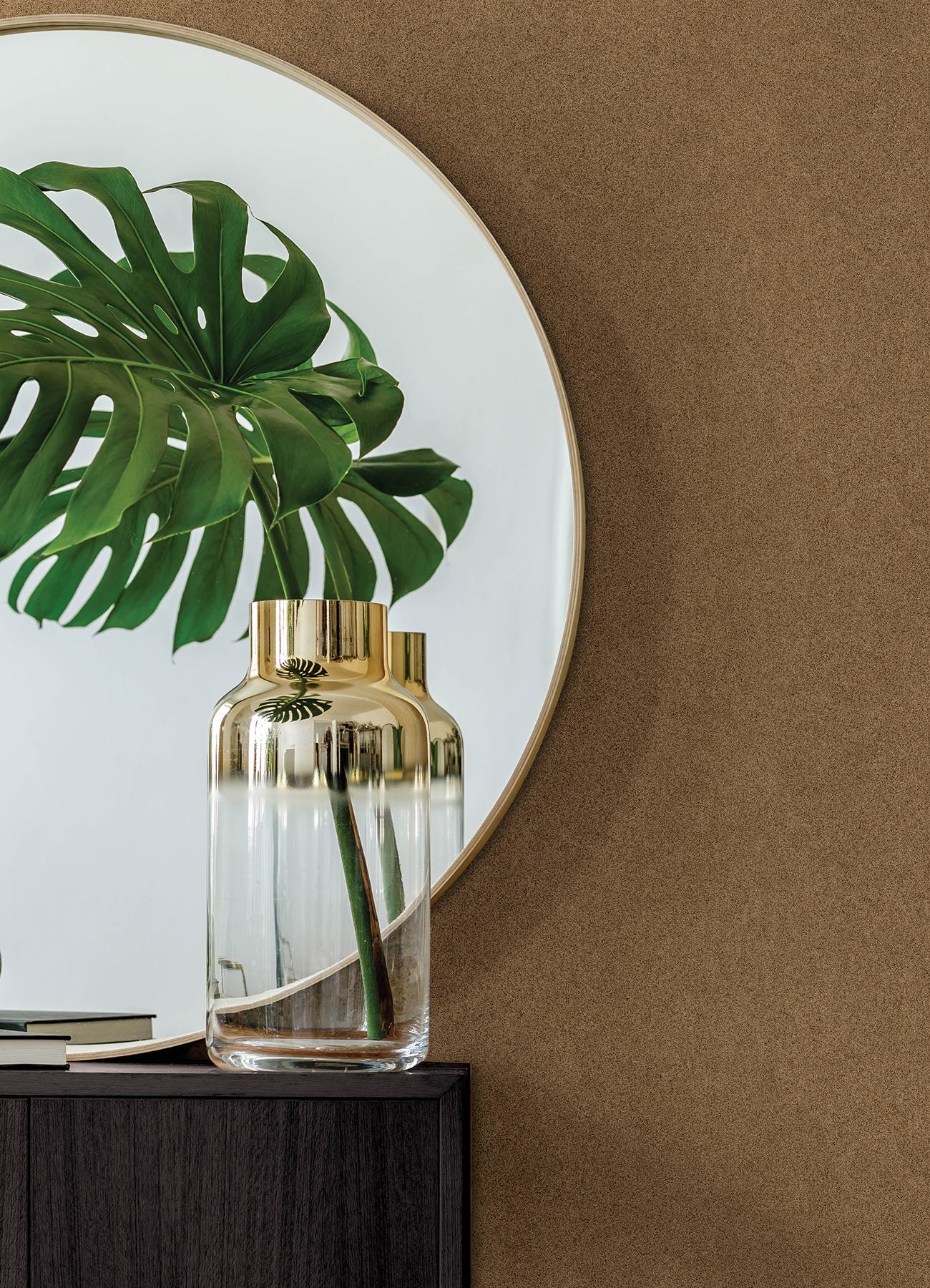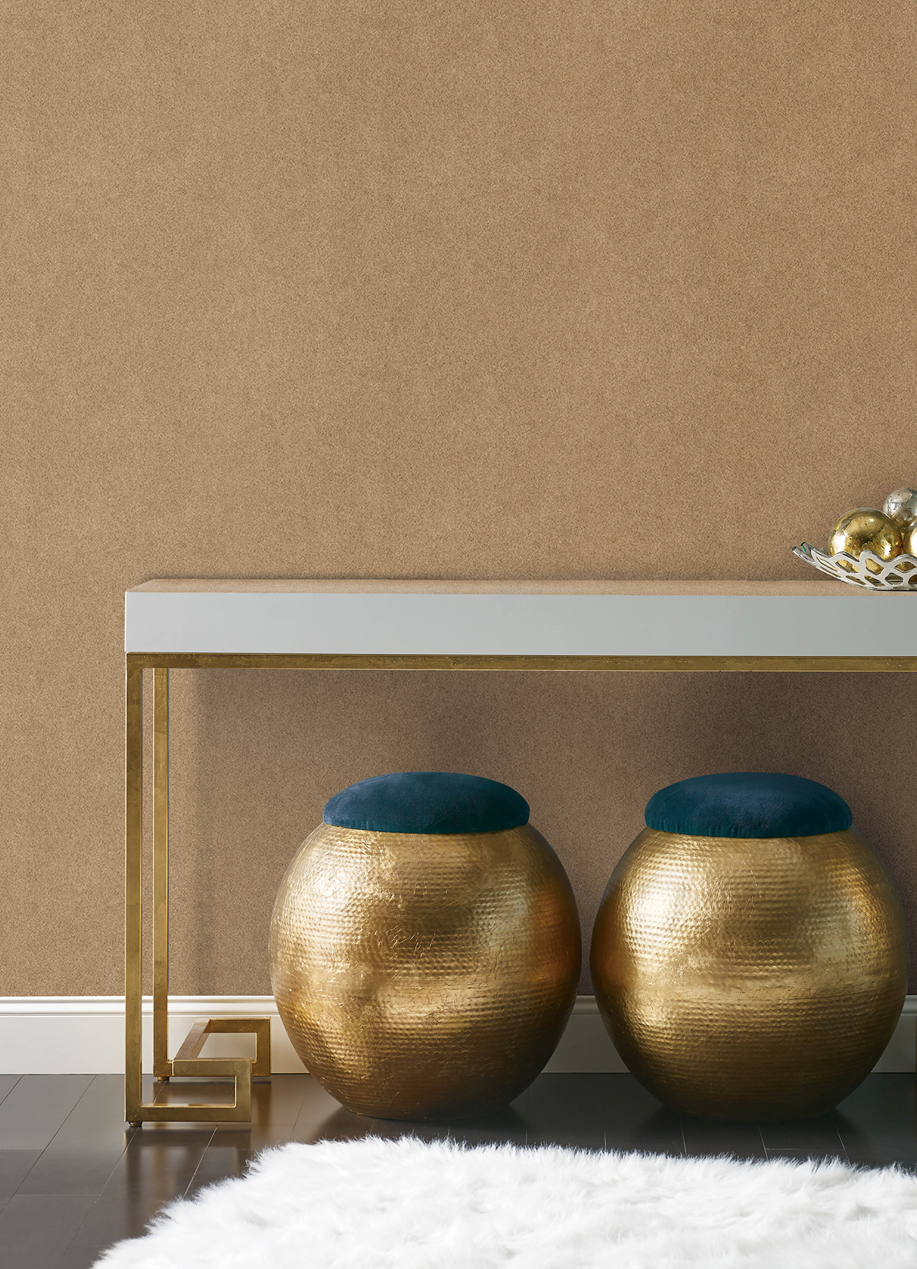 | Bullet Point 1 | Khaki suede-inspired peel and stick NuWallpaper designed for the RuPaul x WallPops collection |