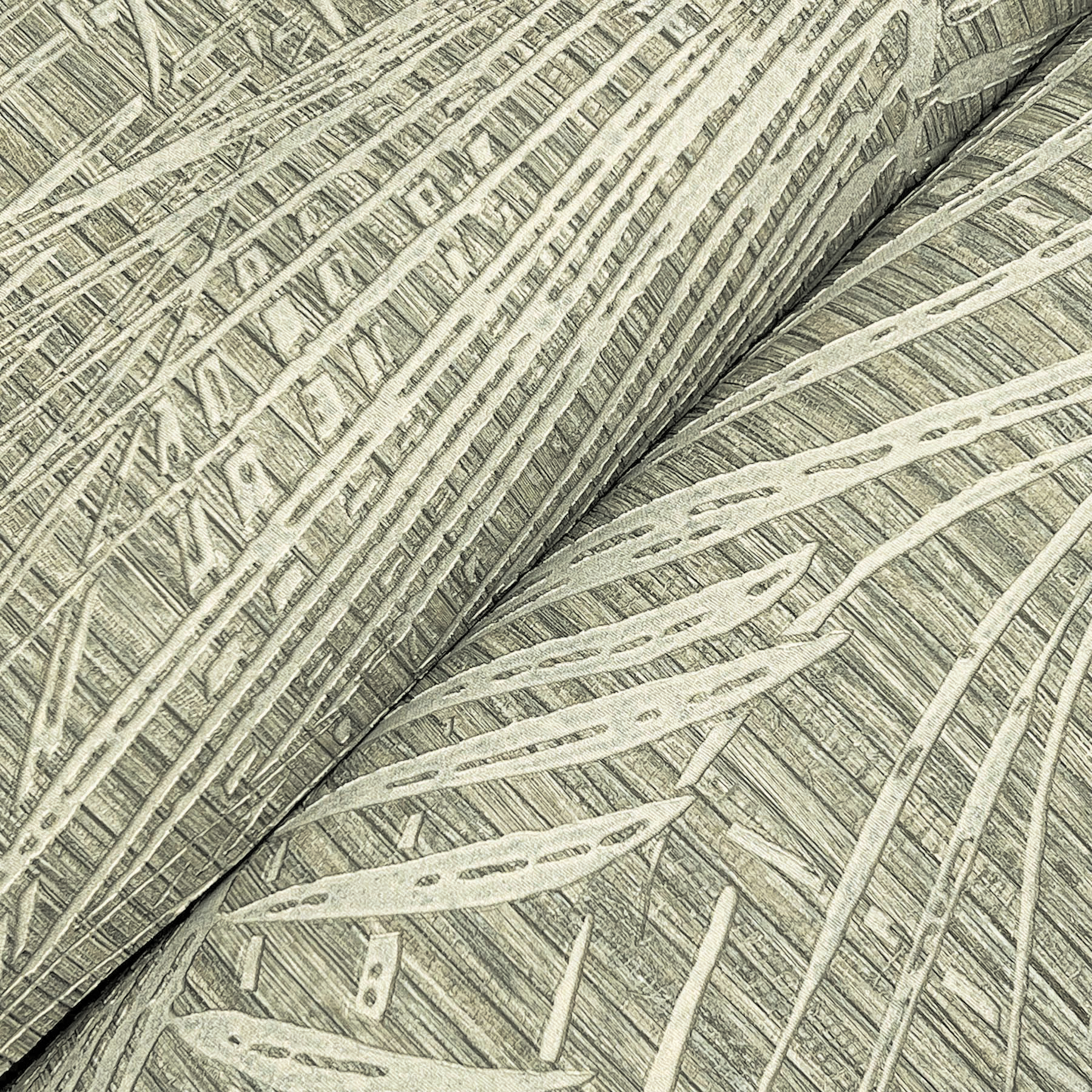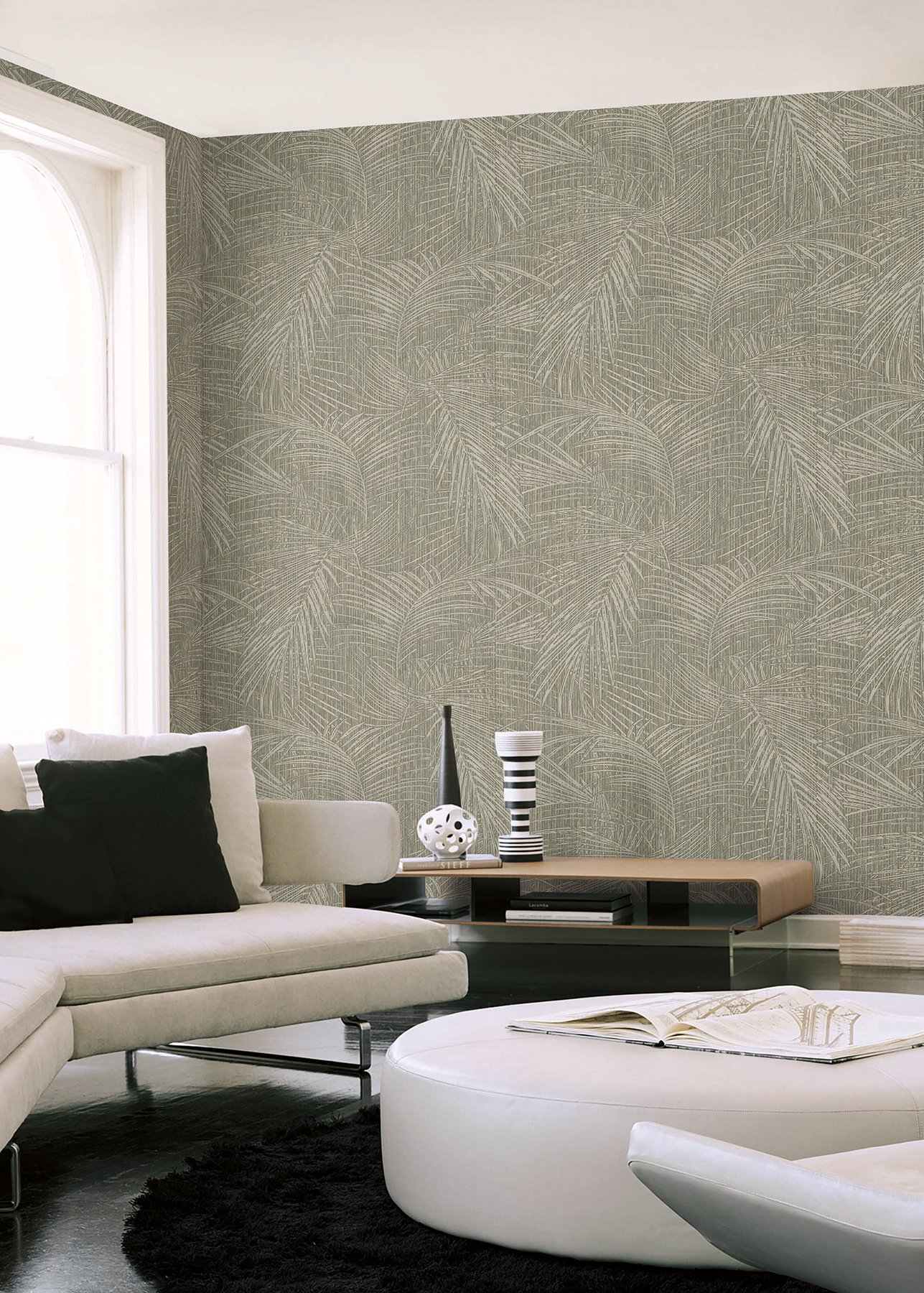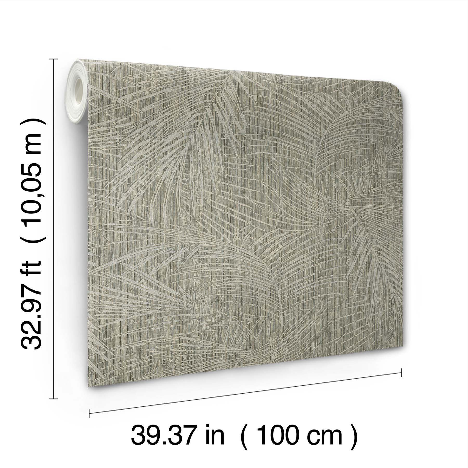 | Description + Bullets | The deeply etched fronds of Della Palm transform into a lush, contemporary canopy of leaves celebrating a luxury resort lifestyle. Featured here in dark taupe and gray. Unpasted vinyl material; 37.4-in repeat, straight match; Scrubbable and strippable; 39.4-in by 33-ft long roll; Covers about 108 square feet |