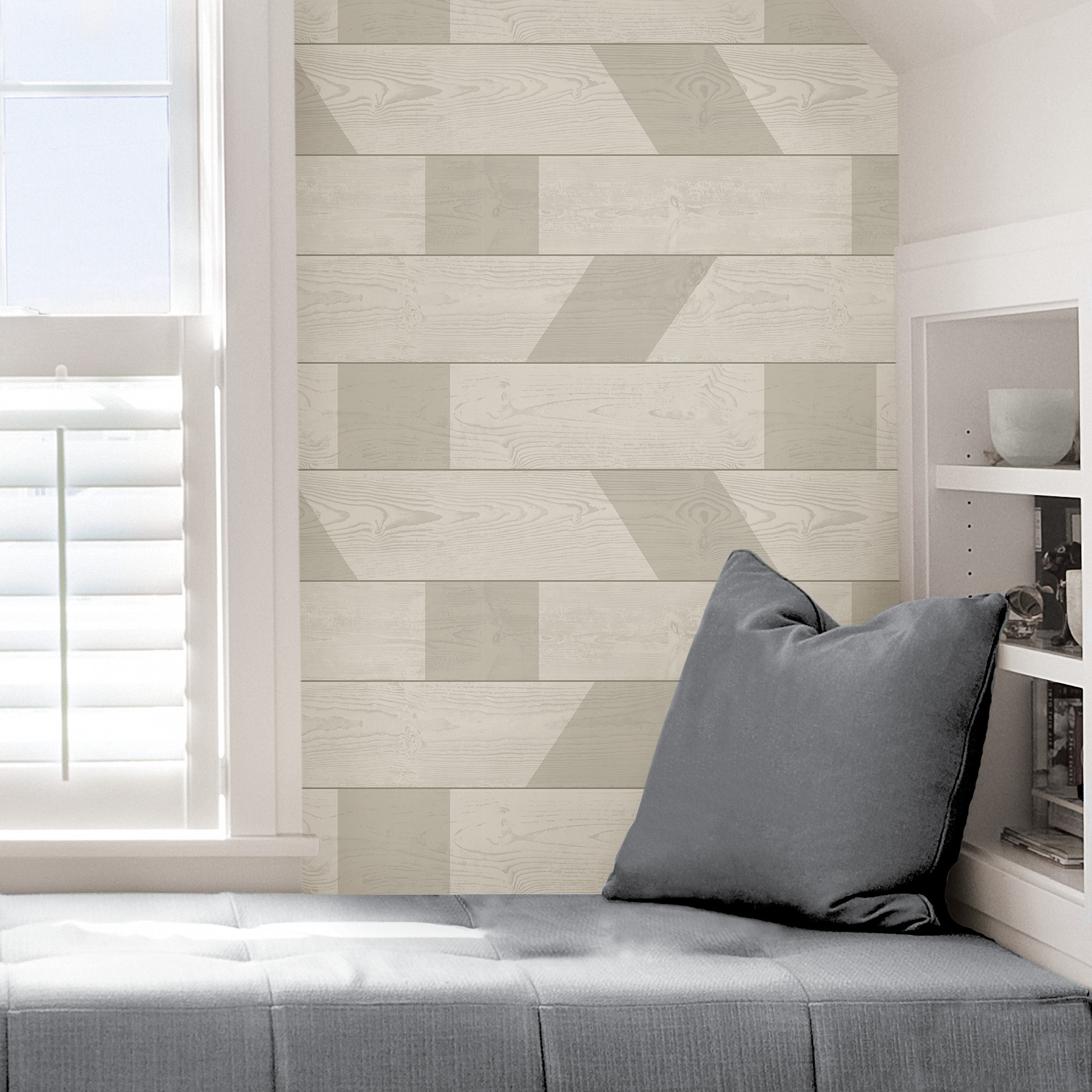 | All Bullets | - A neutral shiplap inspired design from the Scott Living Self Adhesive Wallpaper collection