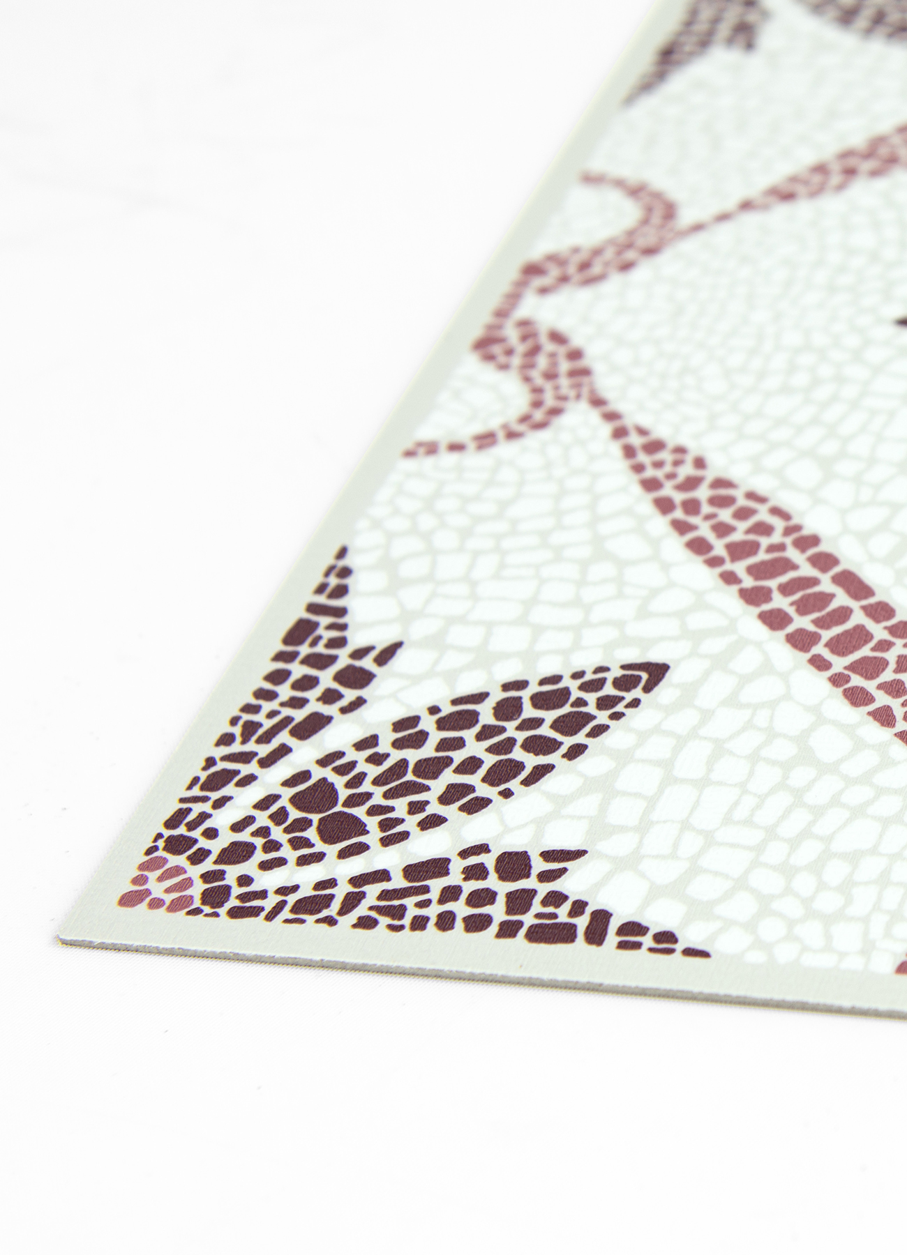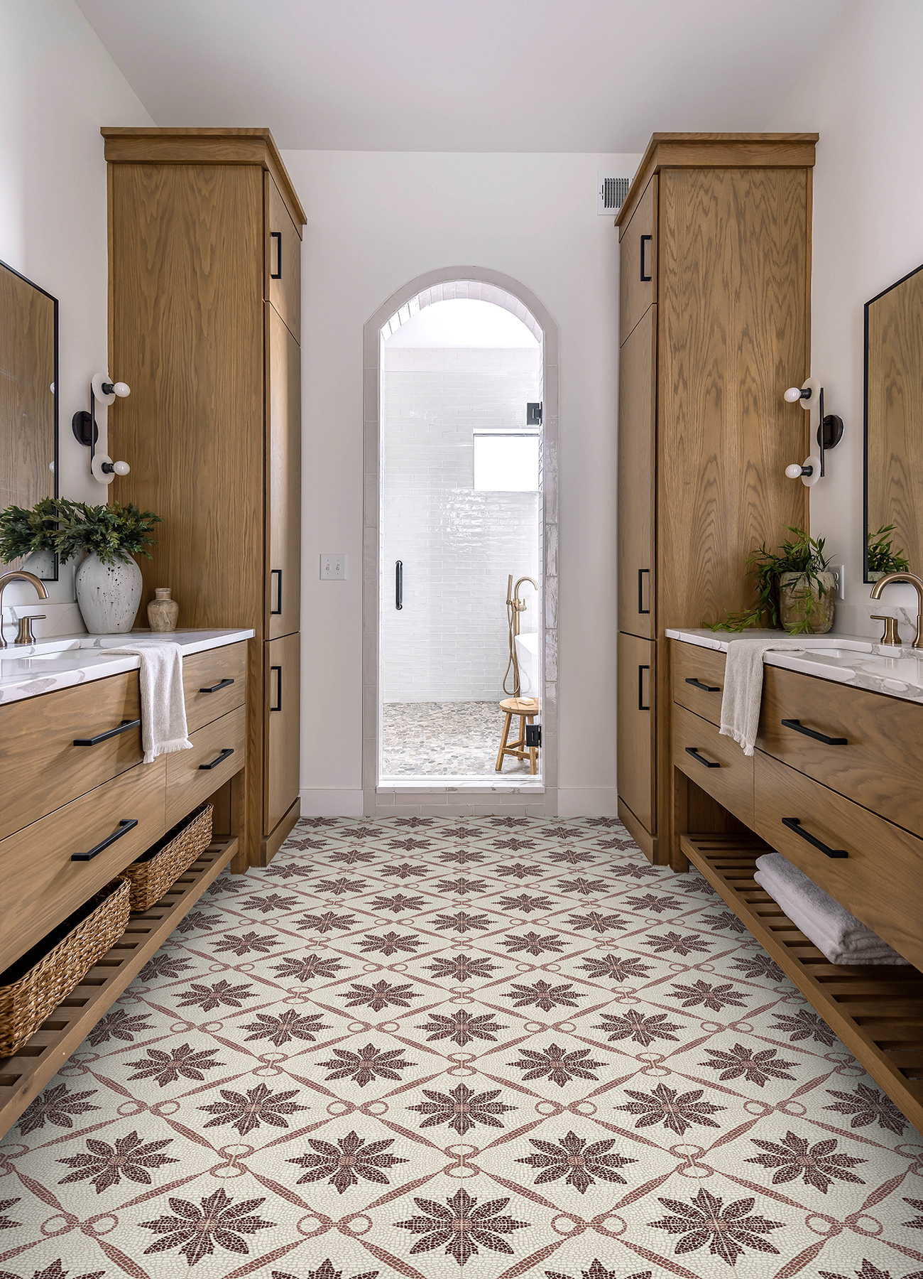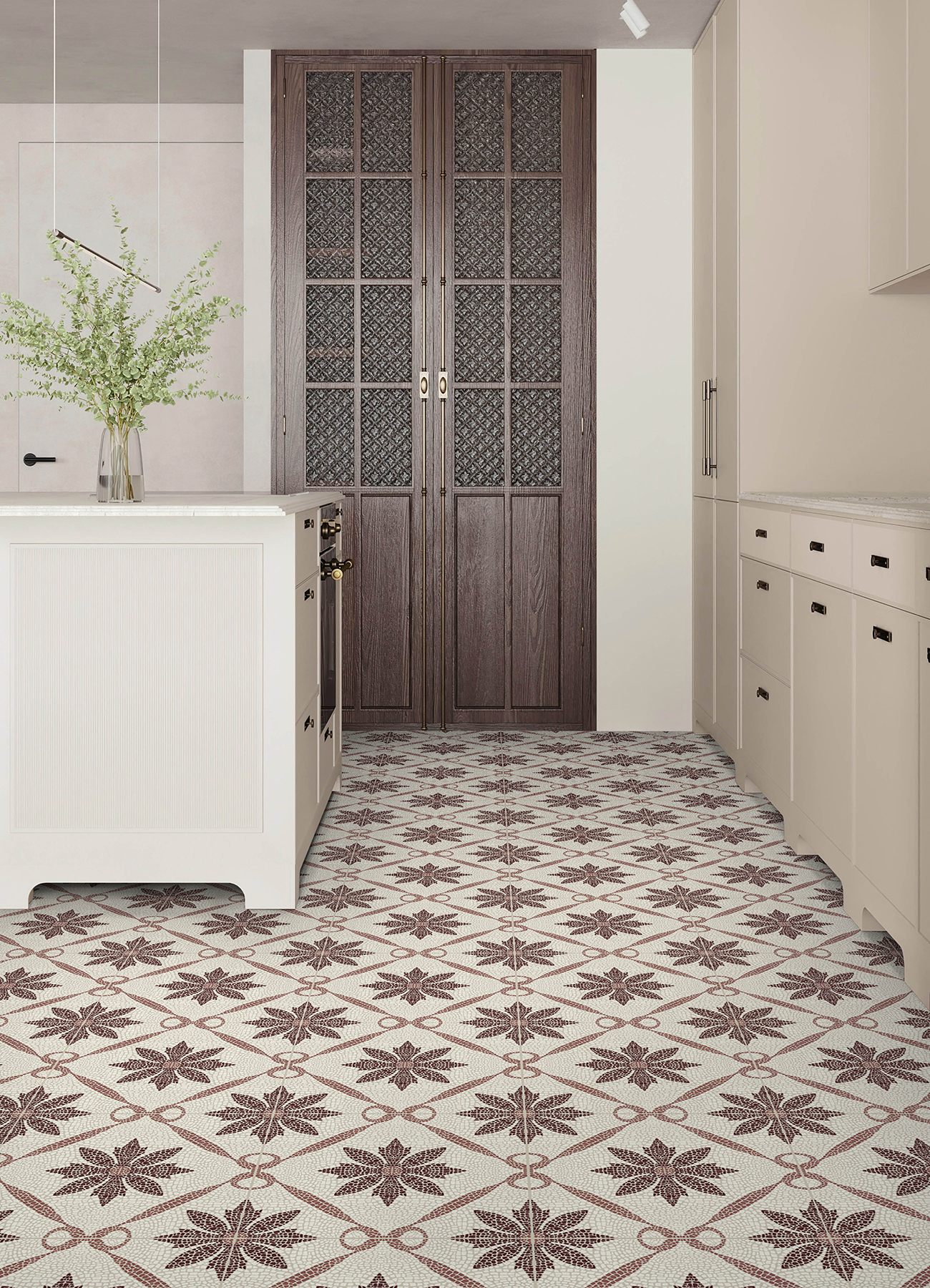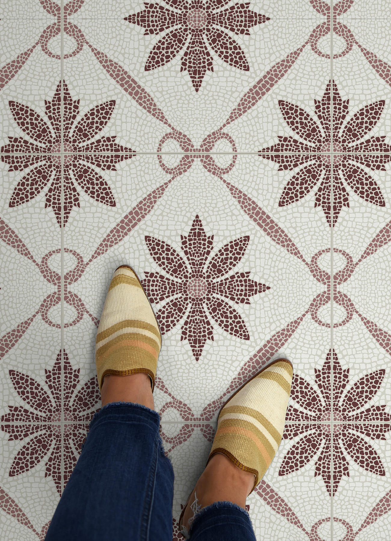 | Bullet Point 1 | Burgundy red and white Old World mosaic-inspired peel and stick floor tiles by FloorPops |
