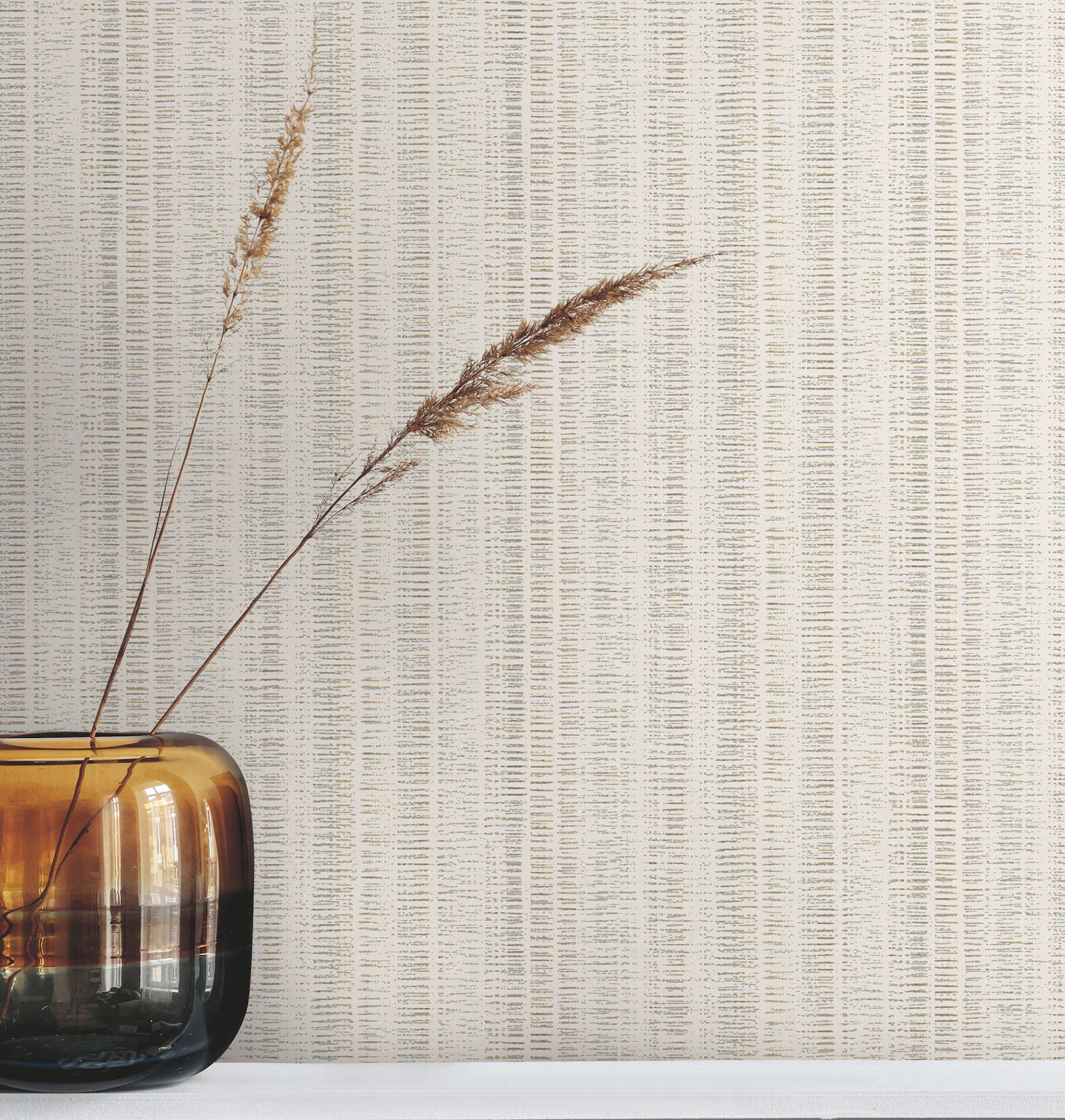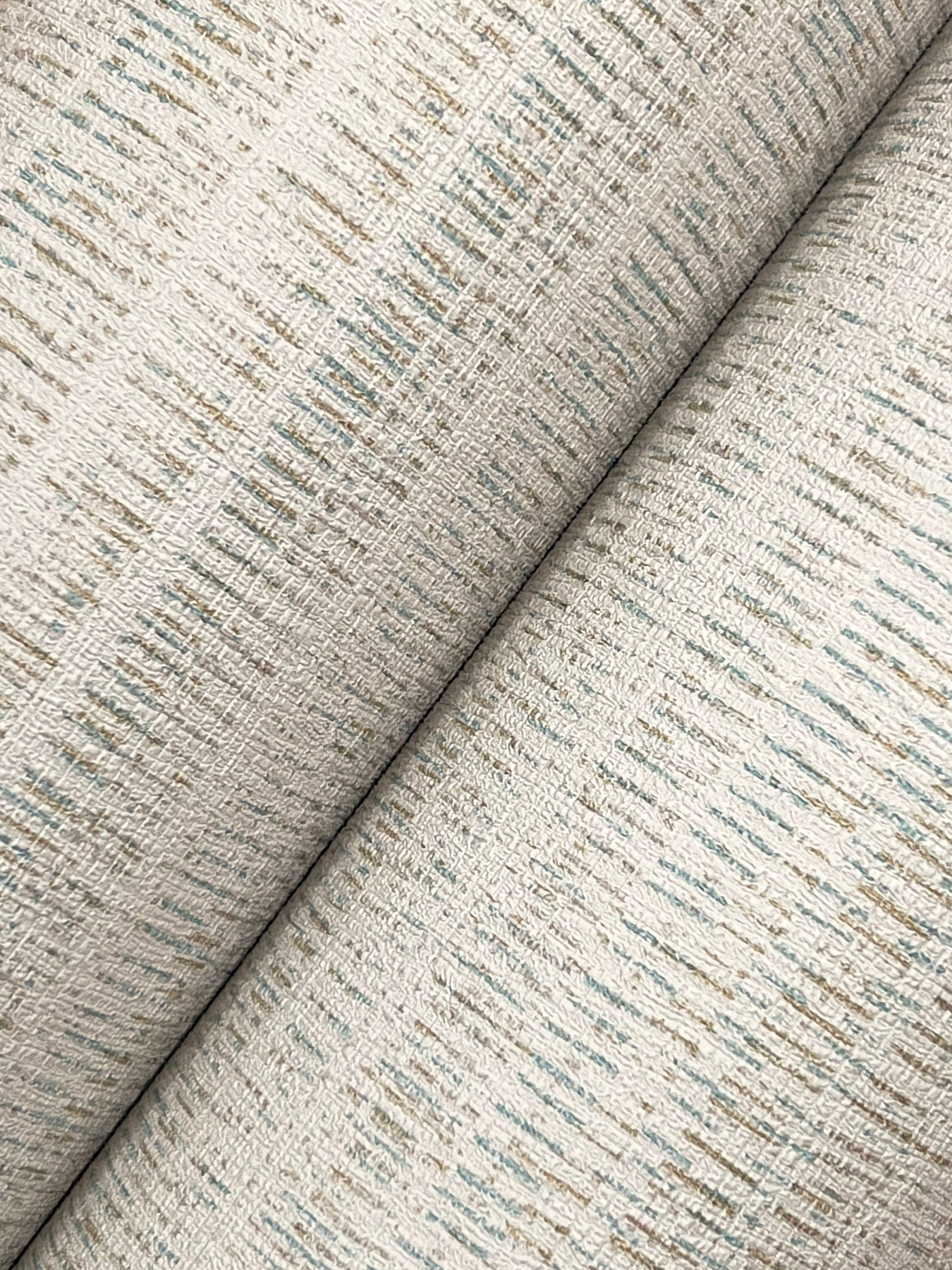 | Dynamic Description | Long, delicate dashes in a subtly shifting ombre form abstracted stripes in pattern Line In The Sand. Seen here with a cream backdrop and details that shift between light brown and aqua. Line In The Sand is a , osnaburg vinyl wallpaper measuring 27 inches wide by 27 feet long, covering approximately About 60.8 square feet square feet per roll. |