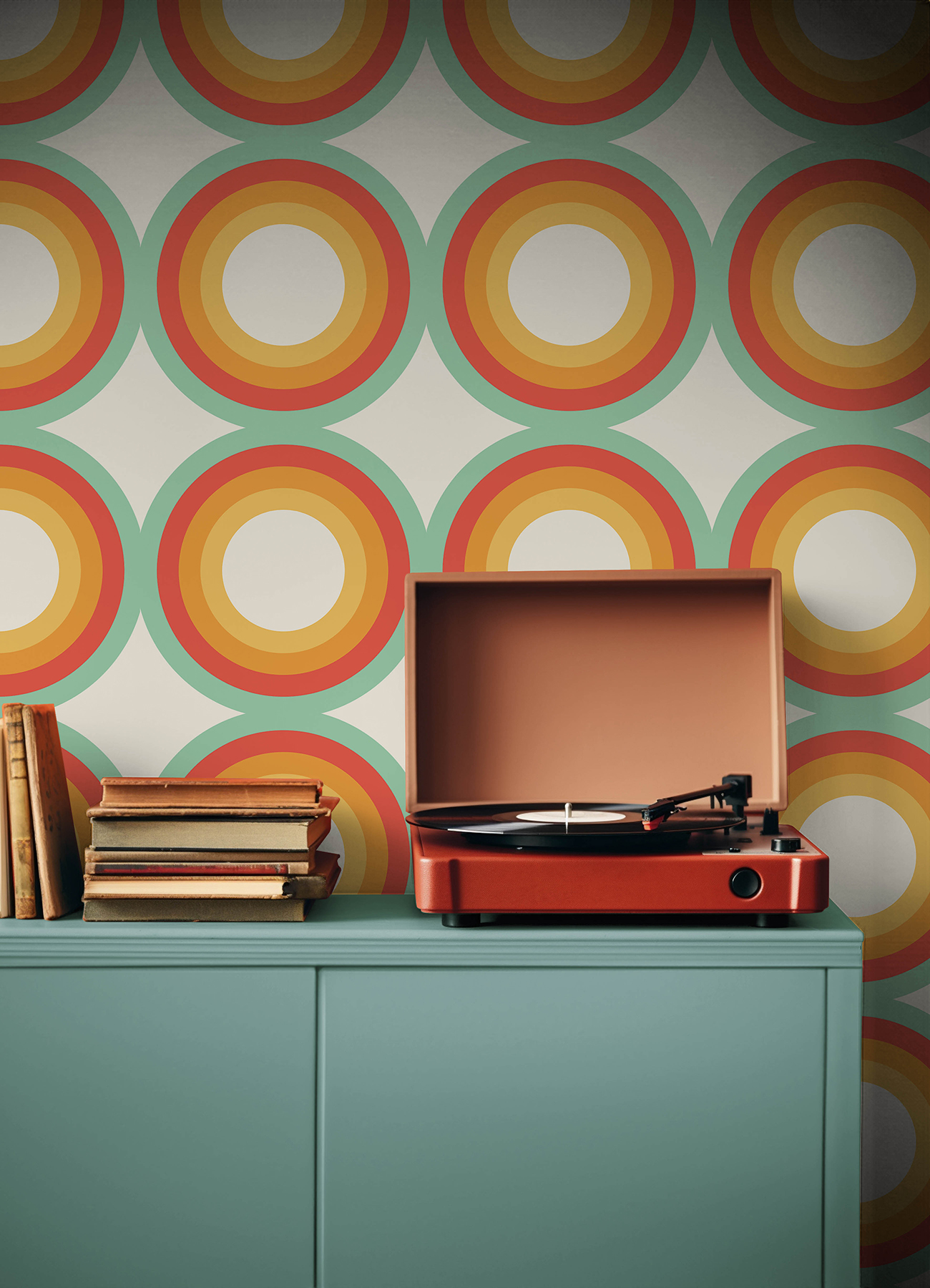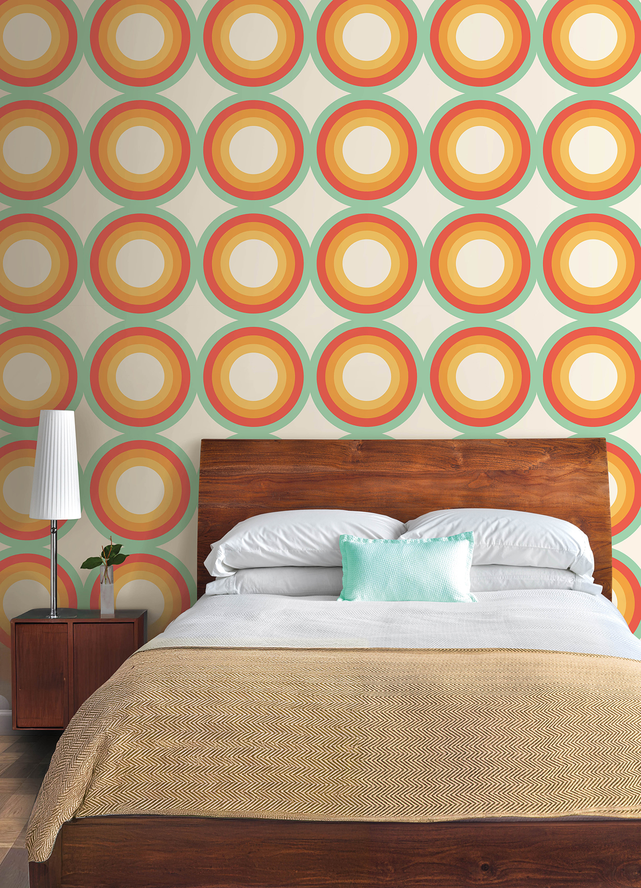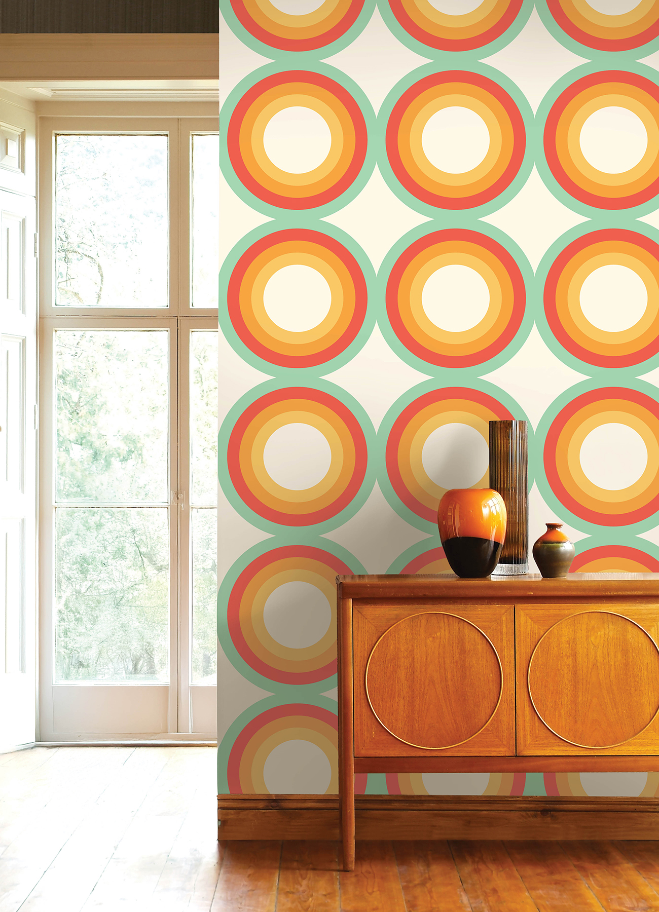 | Bullet Point 1 | Orange and blue retro circle peel and stick wallpaper designed for Very Gay Paint x WallPops |