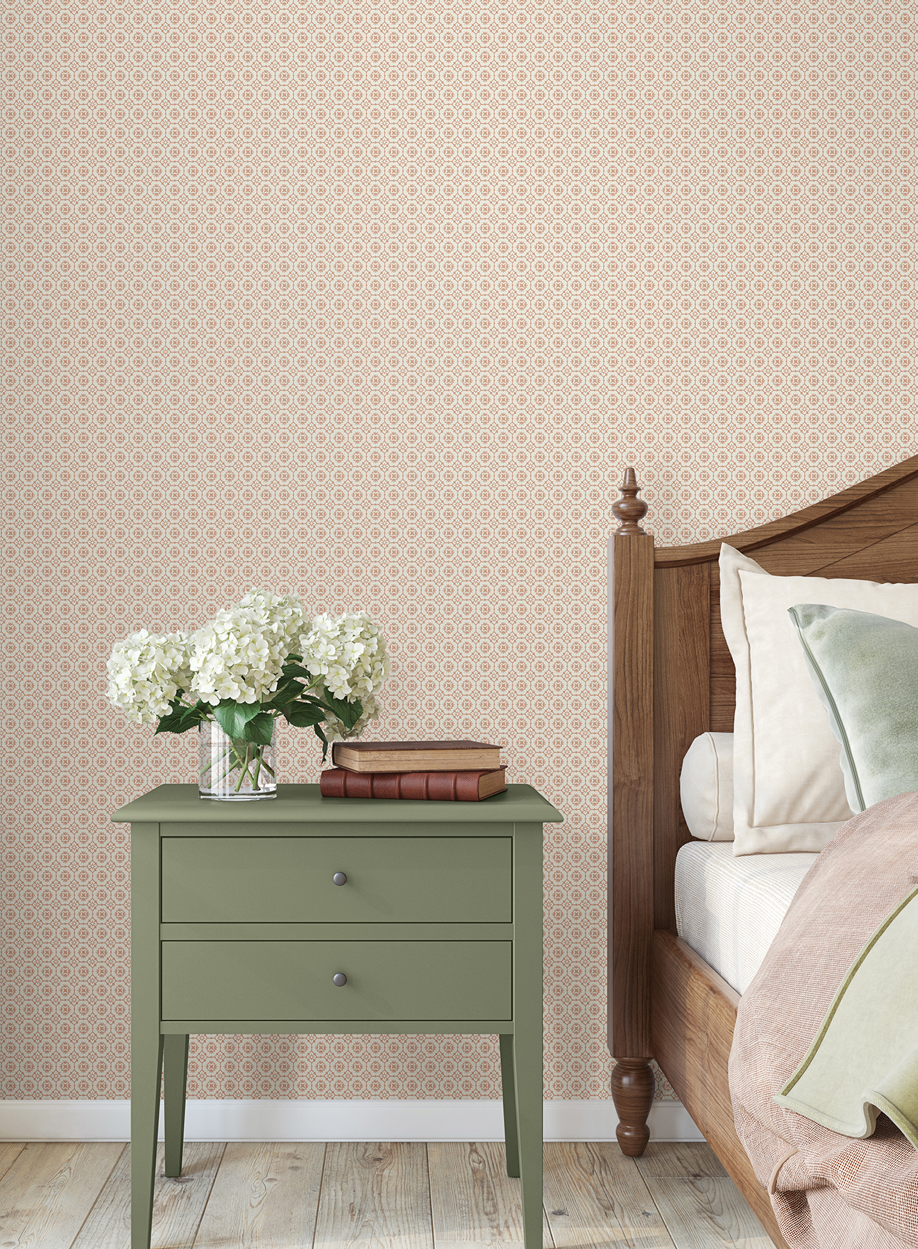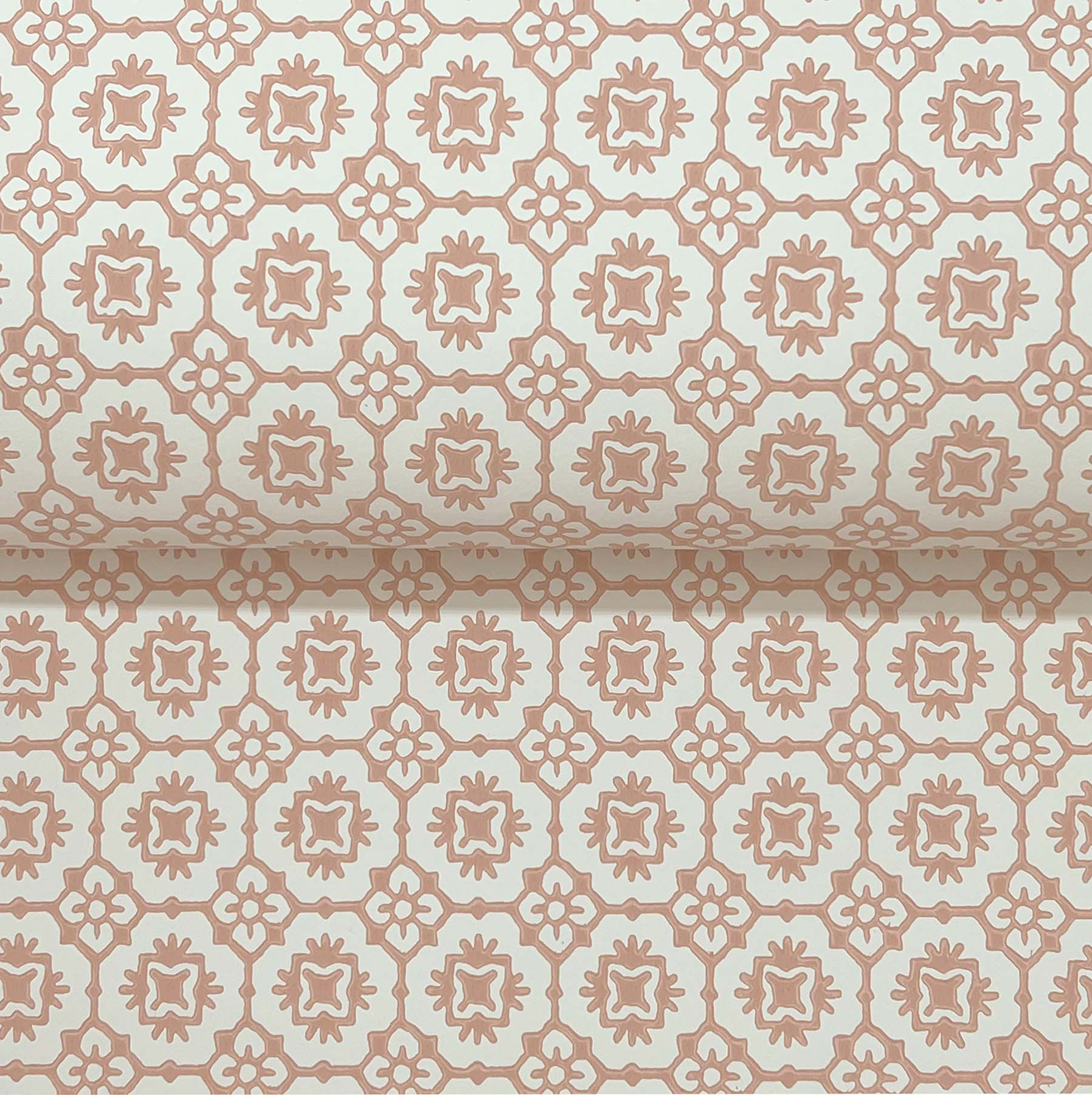 | Dynamic Description | Pattern Priti features an intricate grid of florals composed of larger blooms embellished with petite blossoms at each corner. Seen here in soft pink against white. Priti is an unpasted, non woven wallpaper measuring 27 inches wide by 27 feet long, covering approximately 60.8 square feet per roll. |
