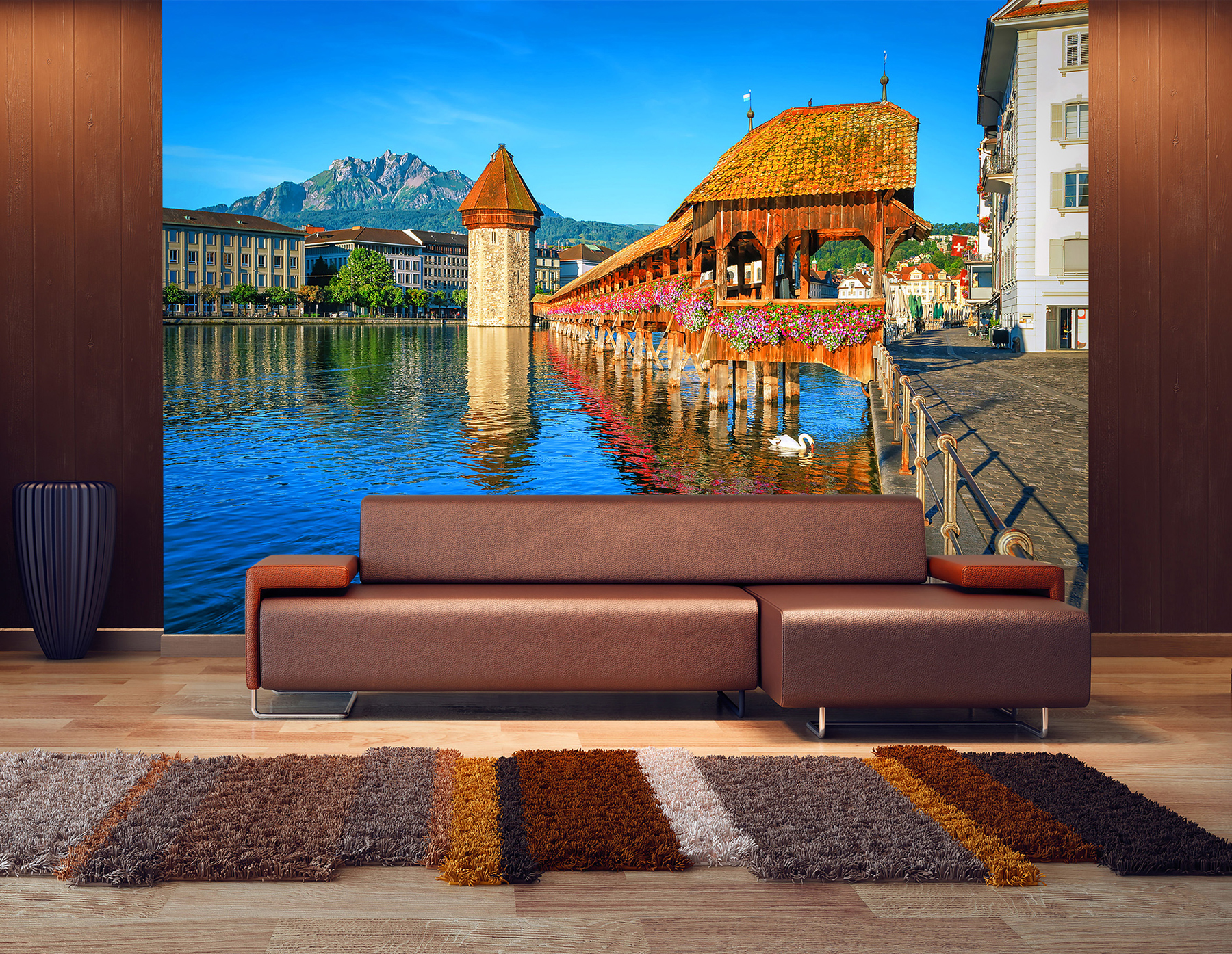 | Dynamic Description | Follow the Kapellbrücke, the fabulous covered footbridge in Lucerne and discover the magic of Switzerland with its snow-capped mountains and colorful architecture. This enchanted wall mural makes a breathtaking view for any sized room big or small. |