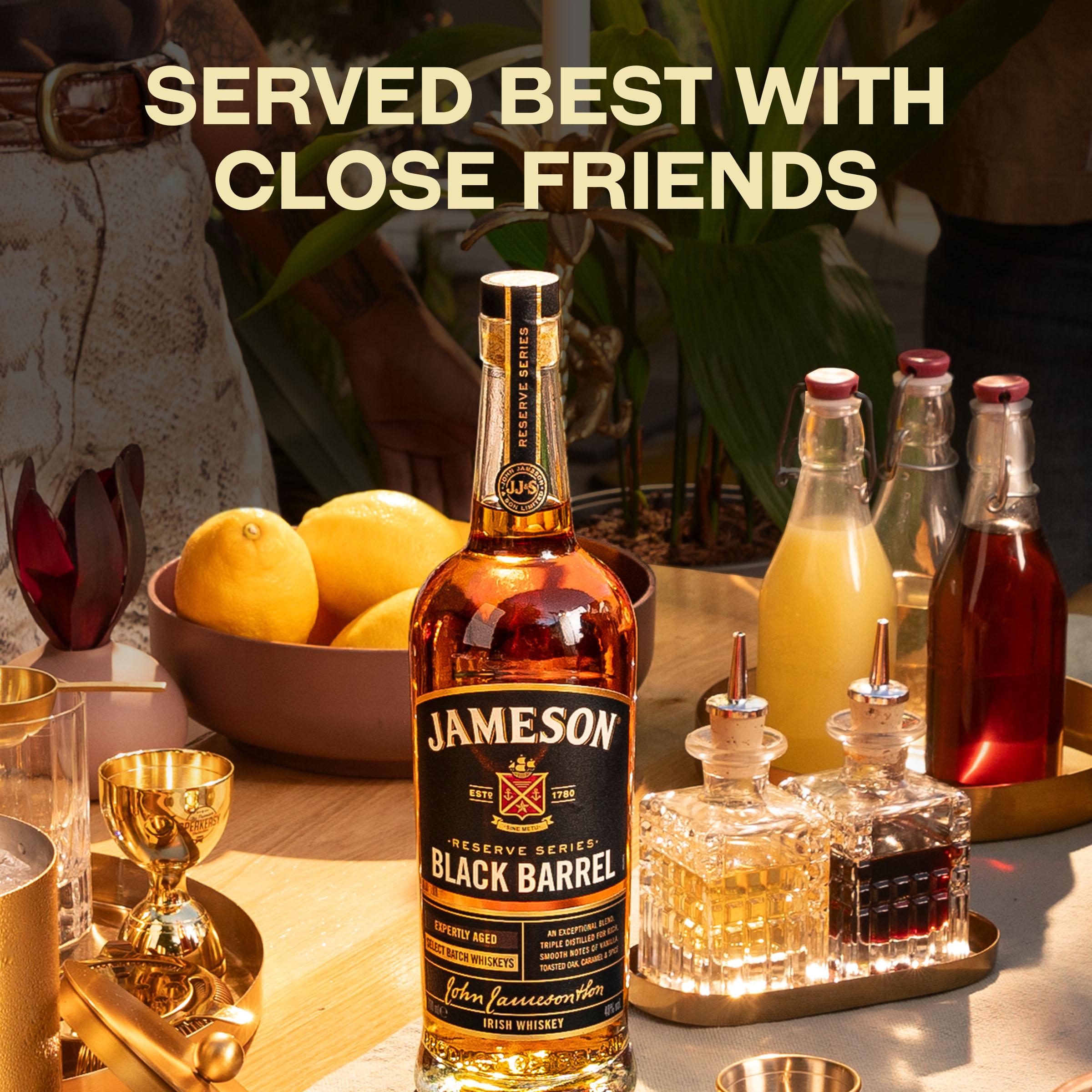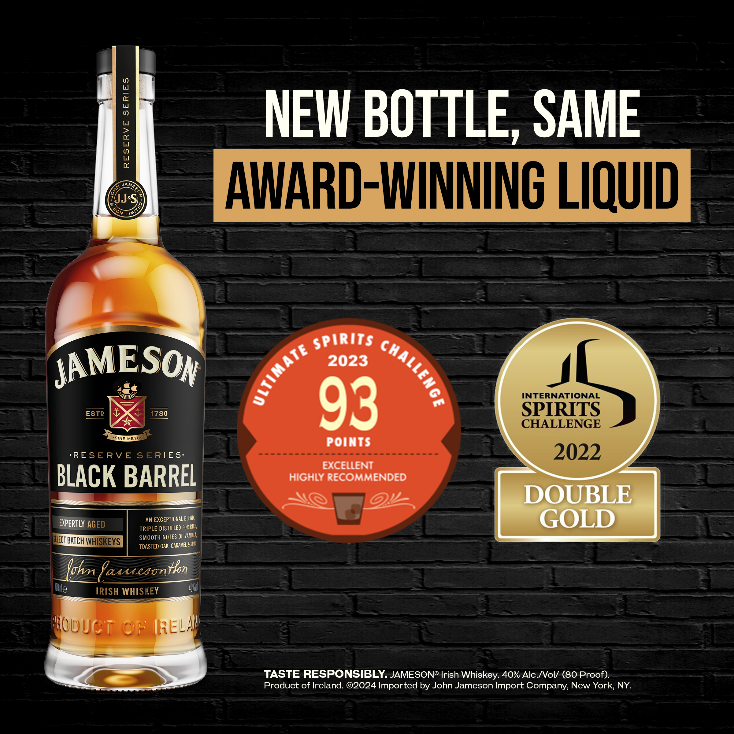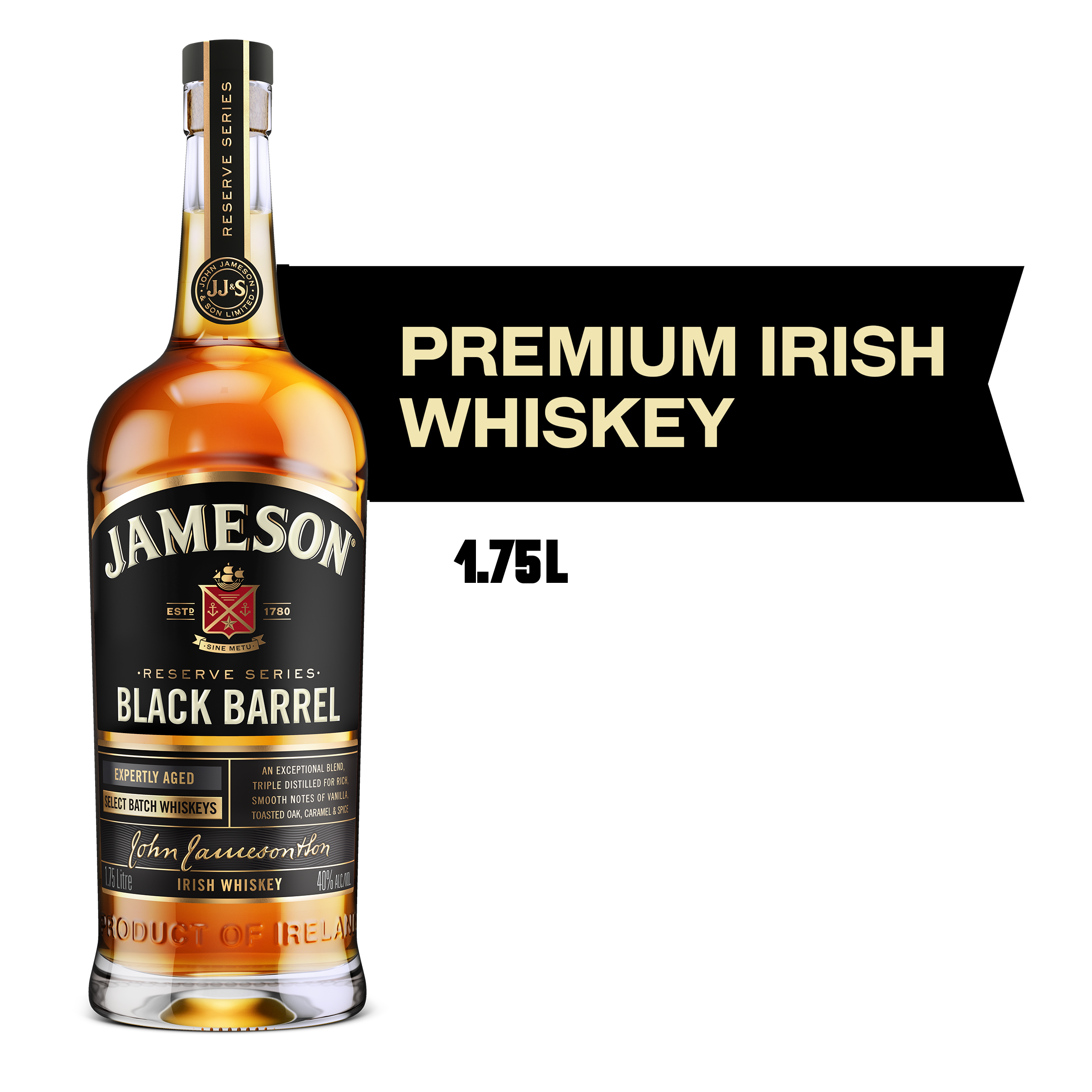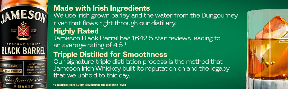 Brand Story John Jameson founded his distillery in Dublin in 1780 to realise his ambition of making the highest quality whiskey possible. Today Jameson is still made in our Single Distillery in Midleton, Co Cork, Ireland following our founder's tradition of using the finest ingredients and triple distillation to achieve our signature smoothness. Product Title - Full (Computed) Jameson Black Barrel Irish Whiskey, 1.75 L Bottle, 80 Proof SKU Name JAMESON BLACK 80P 6/1.75L US Marketing Brand (Computed) Jameson Sub-Brand JAMESON BLACK BARREL SKU 21212007 UPC 840202288055 GTIN 00840202288062 Country Of Origin Ireland Tasting Notes Time spent maturing in these barrels leads to intensified aromas of butterscotch, fudge and creamy toffee. CATEGORY IRISH WHISKEY Product Sub-Category Whiskey Manufacturer Pernod Ricard Short Description Jameson Black Barrel Irish Whiskey is a tribute to our coopers. Time spent maturing in these double-charred barrels lends our whiskey a unique richness, with more intensified notes of vanilla sweetness and caramel, alongside toasted wood, fruit, and warm spice. Long Description Jameson Black Barrel Irish Whiskey delivers the smooth taste of triple-distilled Jameson Irish Whiskey with intense vanilla and caramel flavor notes to your favorite cocktails. Jameson uses carefully selected ingredients like locally sourced barley from Ireland and water from the Dungourney River that flows right through its distillery. To achieve a signature smoothness, it's made with triple distilled Jameson Whiskey. This tradition began in 1780 and we continue this legacy. Next, it's aged in double-charred barrels to achieve a classic Irish whiskey taste with intense aromas of butterscotch, fudge and toffee. This one-of-a-kind Black Barrel whiskey showcases the perfect balance of spicy, nutty and vanilla undertones; a delicate, smooth and full mouthfeel with distinctive spice notes; and a rich and intense finish with toasted wood and vanilla. Enjoy this liquor neat, on the rocks, or in cocktails like a Whiskey Sour or Old Fashioned cocktail. You’ll taste the care and craftsmanship Jameson puts into its whiskeys from grain to glass, so live “without fear” or “Sine Metu,” as it proudly says on the label. Drink responsibly. Feature Bullet 1 BLACK BARREL IRISH WHISKEY: The smooth taste of triple-distilled Jameson Irish Whiskey, perfectly balanced with an intense vanilla flavor Feature Bullet 2 INCLUDES: One 1.75 L bottle of Jameson Black Barrel Irish Whiskey; 80 proof or 40% alcohol by volume; Drink responsibly Feature Bullet 3 SERVE IT YOUR WAY: Enjoy this alcohol neat, on the rocks, or in alcohol drinks like a Whiskey Sour Feature Bullet 4 FLAVOR AND AROMA: Subtly sweet with spicy, nutty, vanilla undertones with a rich toasted wood and vanilla finish, and butterscotch, fudge and toffee aromas Feature Bullet 5 SIGNATURE DISTILLATION PROCESS: This Jameson Whiskey is triple distilled for its signature smoothness Feature Bullet 6 CLASSIC IRISH WHISKEY: Aged in double-charred barrels, giving you a sweet and smooth finish with every bottle of this Jameson Black Barrel Whiskey Feature Bullet 7 ORIGIN: Product of Ireland, Jameson Irish Whiskey continues to grow and keep tradition Awards - 98 Points - Chilled 100, 2022