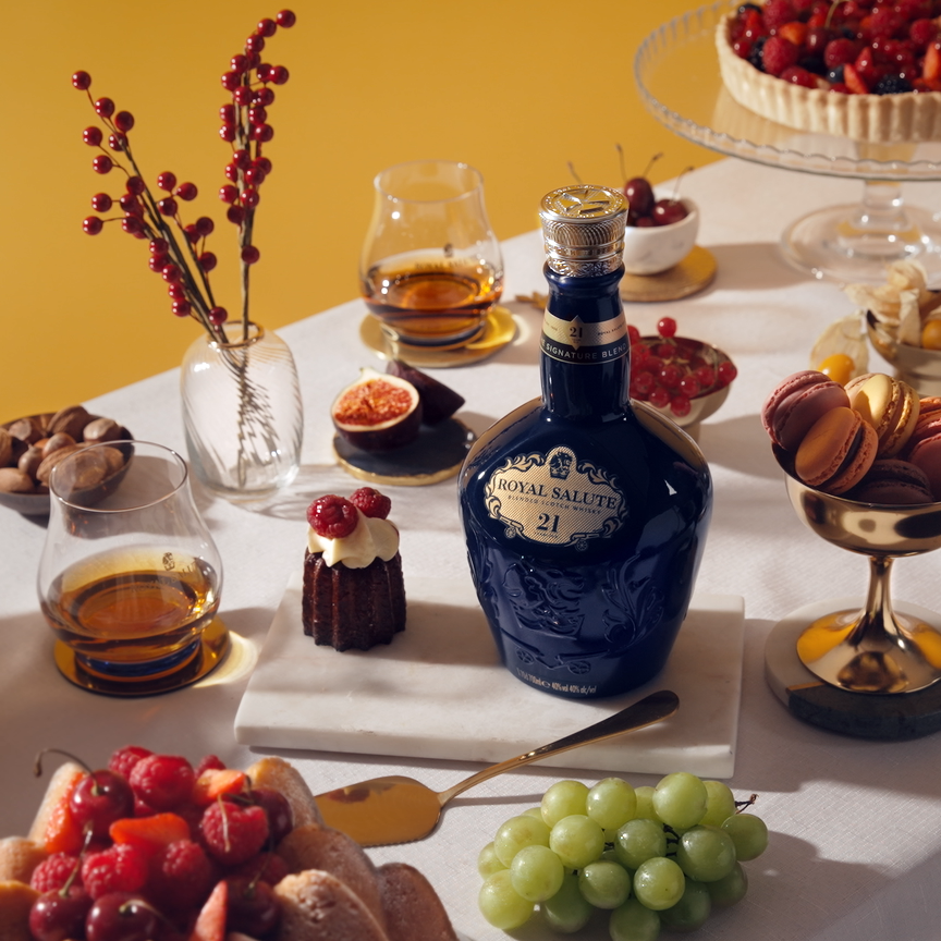 - TASTE: Rich, Full, deep fruity flavours with a subtle smokiness. The first taste of Royal Salute brings the subtleties of the nose to life. Sumptuous sweet orange and marmalade flavours infused with fresh pears burst across the tongue. The second taste brings in a rich medley of spices and a nuttiness of hazelnuts that have a mouth-filling intensity and then the final warmth from hints of masculine smokiness