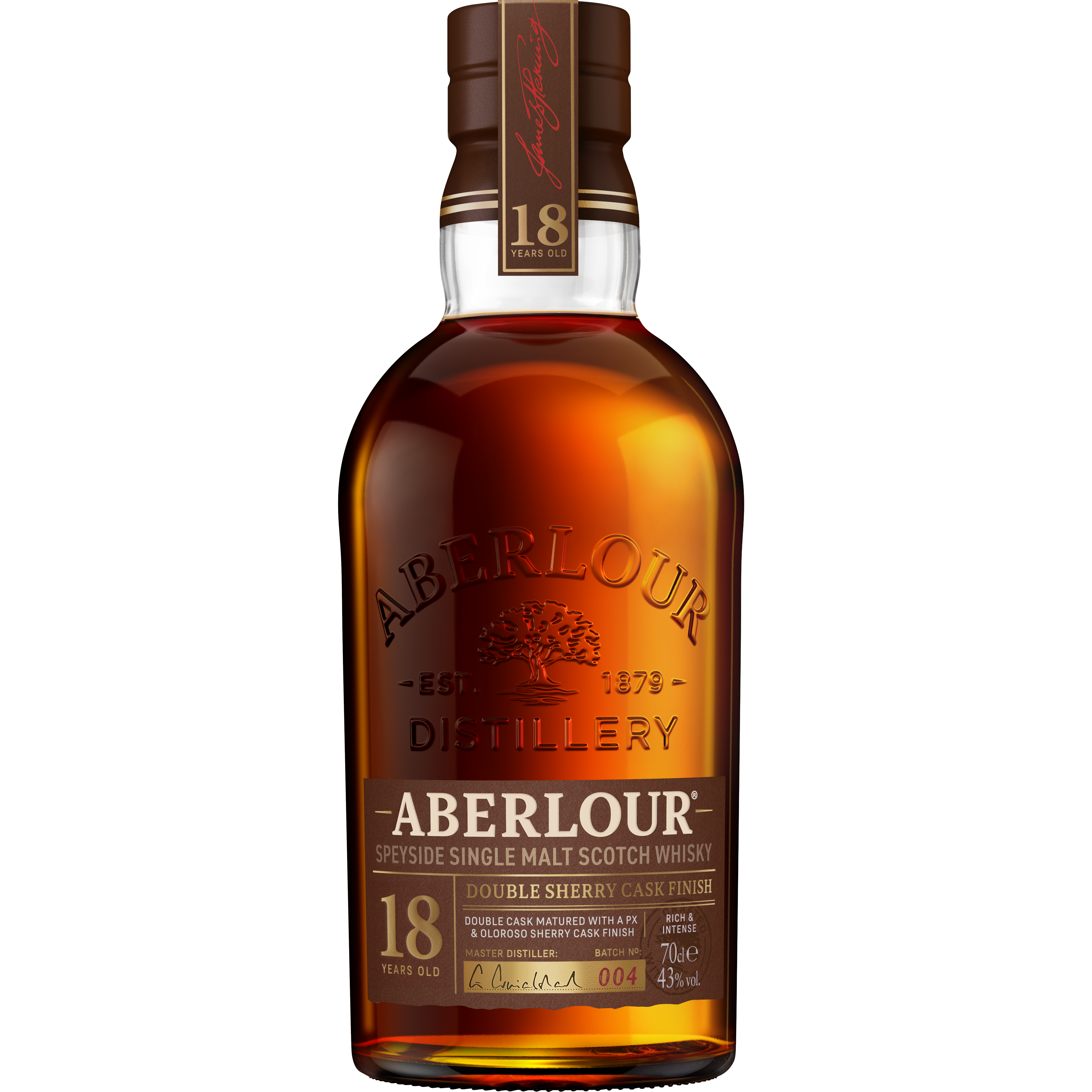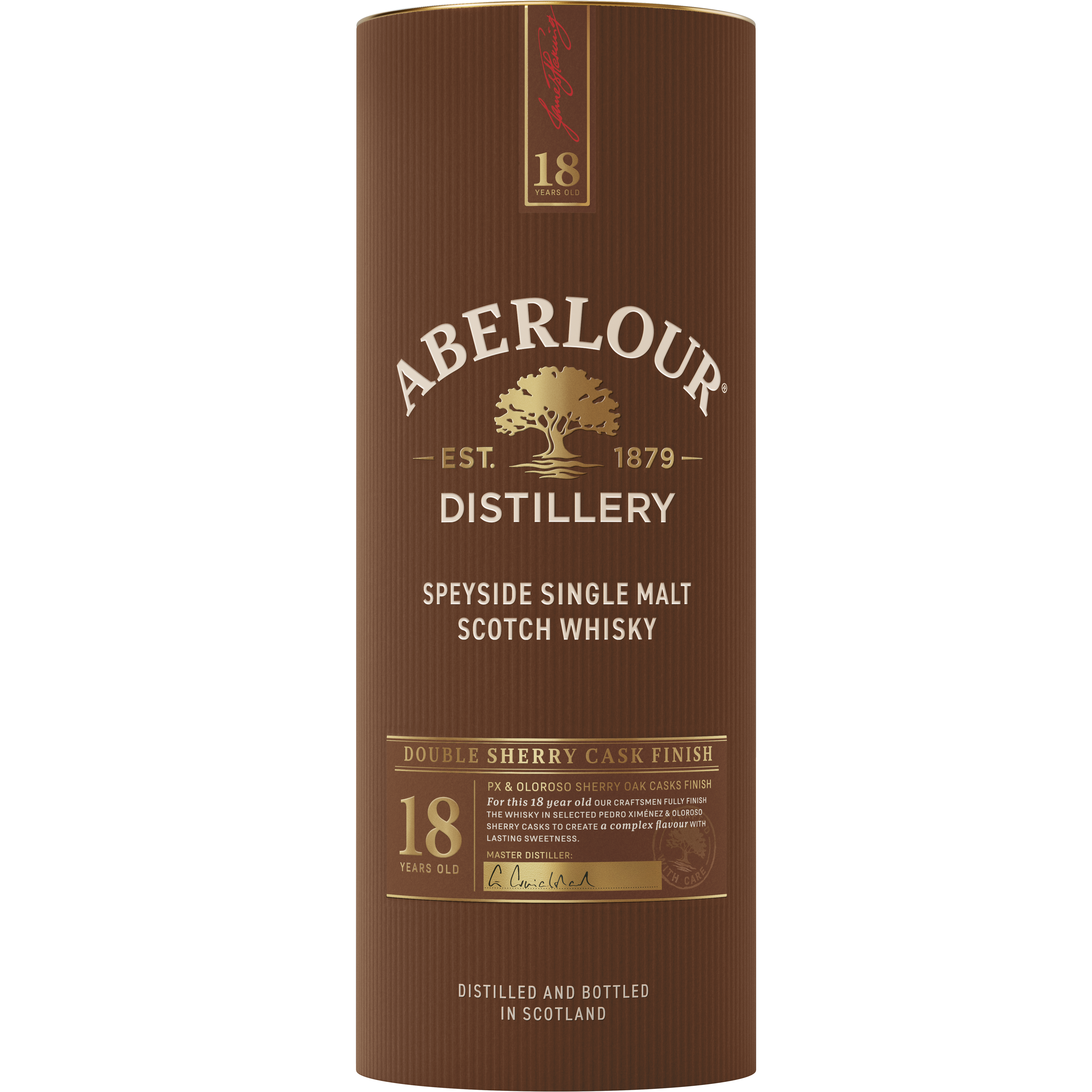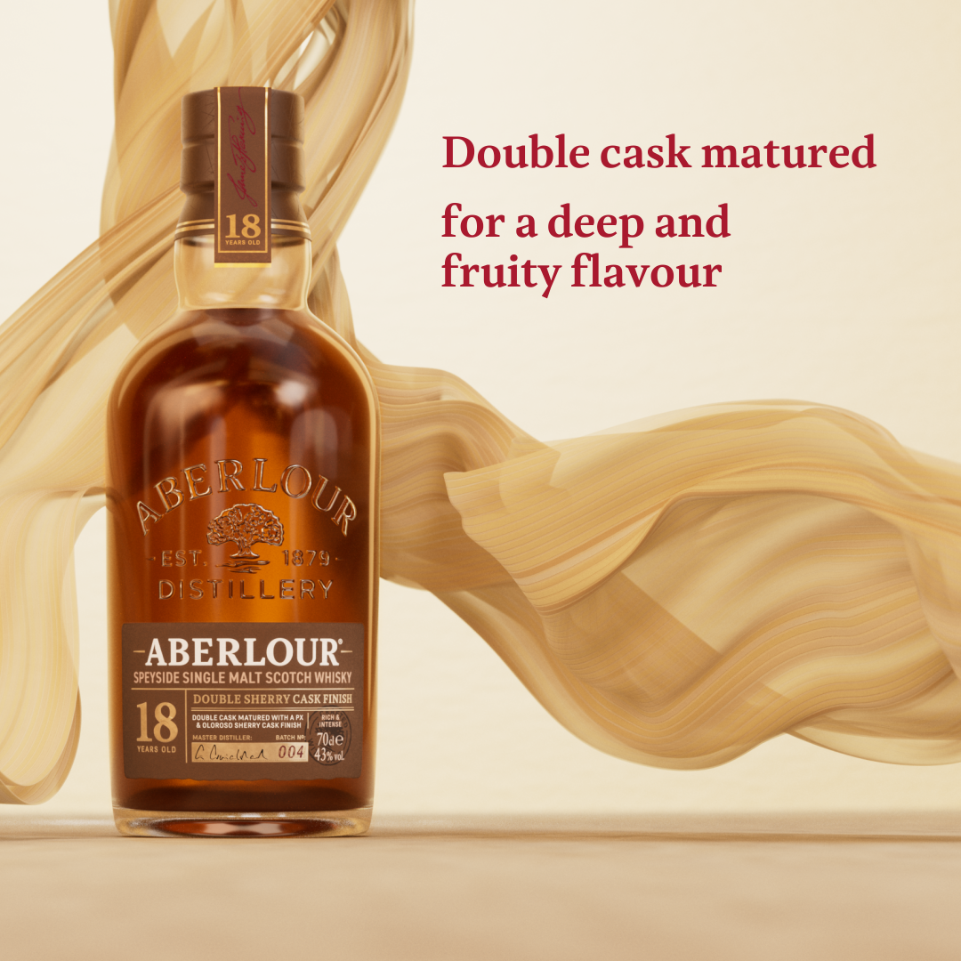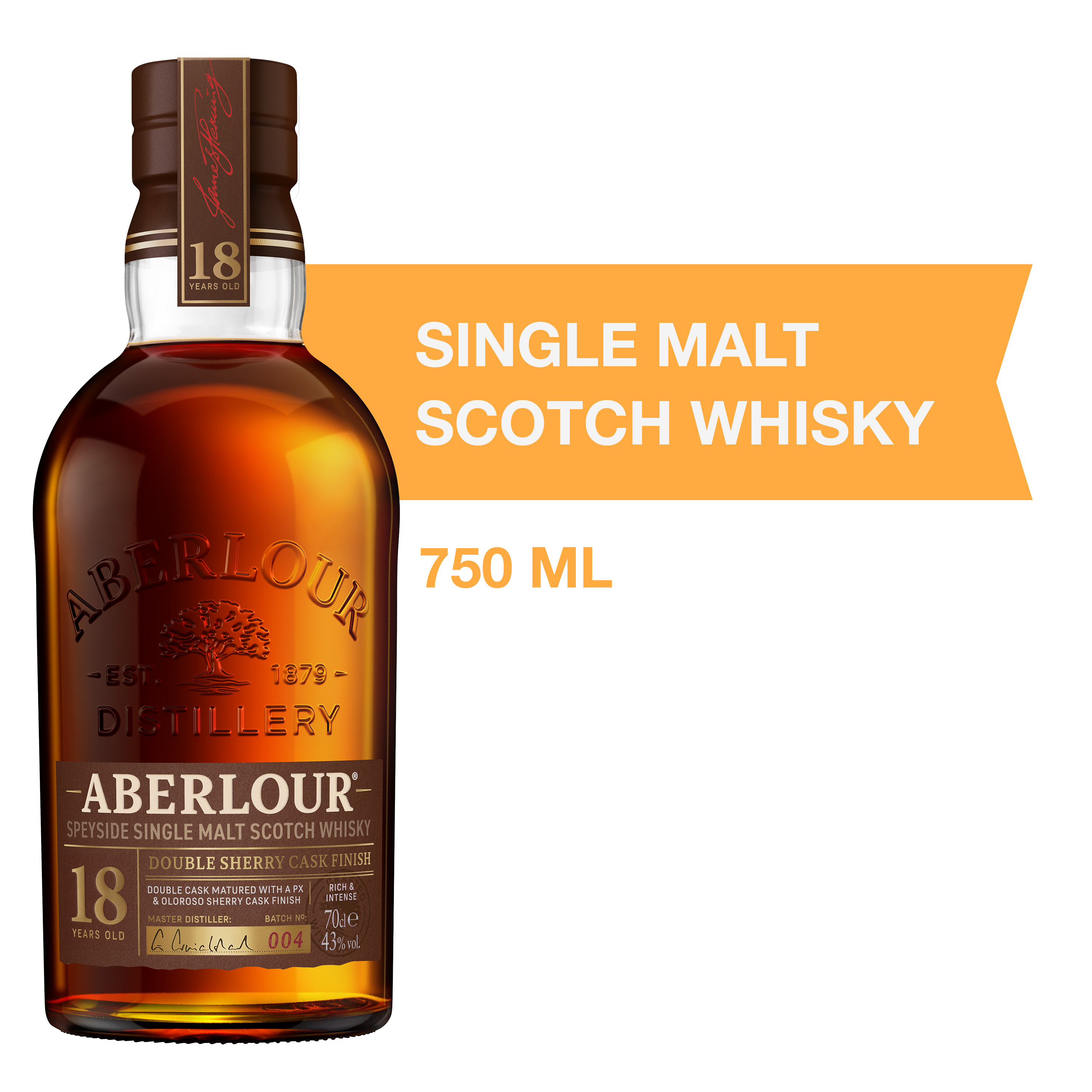 Brand Story It is in the small Speyside village of Aberlour, on the banks of the River Lour, that James Fleming, our founder, established his distillery in 1879. He always believed in working in harmony with our surroundings and community, using the finest ingredients to make the finest whisky. His ethos still lives on today. Product Title - Full (Computed) Aberlour 18 Year Old Double Cask Matured Single Malt Scotch Whisky, 750 ml Bottle, 80 Proof SKU Name ABERLOUR 18Y 86 6/750 NP GB US Marketing Brand (Computed) Aberlour Sub-Brand ABERLOUR 18 YO SKU 23008112 UPC 080432102213 GTIN 10080432102210 Country Of Origin Scotland Appellation Speyside CATEGORY SCOTCH WHISKY Manufacturer Pernod Ricard Short Description Rich & complex, indulgent. The mature, deep, spicy one: a deeper Sherry influence adds more spiciness and a licorice tang. Greater age adds body and develops the distinctive fruitiness to a rich raisin character. Long Description Spicy and luxurious, Aberlour 18 Year Old single malt Scotch whisky is crafted along the River Spey in the Aberlour distillery. A deeper Sherry influence adds more spiciness and a licorice tang. Greater age adds body and develops the distinctive fruitiness to a rich raisin character. Double Cask, Our makers mature the whisky in two different types of casks: American Oak casks bringing notes of vanilla and toffee, and Oloroso Sherry casks imparting spice and richness. During the years of maturation, the whiskies subtly absorb the casks complexity, adding intricate layers and refined depth. When the time comes, our craftsmen skilfully bring the single malts from both casks together, an art requiring dedication and years of expertise to achieve just the right balance of depth and flavour. The craft of double cask maturation. Double cask matured for a minimum of 18 years, this well-balanced single malt perfectly combines a rich and intense character, with layered notes of juicy sultanas and toffee imparted by the Oloroso and Pedro Ximénez casks. A complex and deeply sherried whisky, with a long and sweet finish. Feature Bullet 1 SPICY AND LUXURIOUS: This aged Scotch Whisky has the distinctive fruitiness to a rich raisin character using sherry for a spiciness and liquorice tang Feature Bullet 2 ENJOY RESPONSIBLY: Each 750 ml bottle of Aberlour Single Malt Scotch Whisky 18 Year Old Double Cask Matured with Gift Box is 86 proof, 43% ABV Feature Bullet 3 CONSUMPTION TIP: Add a little water to lower the intensity of the alcohol and open up the flavors, or drink this mild mannered Scotch neat Feature Bullet 4 UNIQUE SELLING POINT: Batch produced Full double Sherry finish Significant influence from Spanish oak Oloroso, PX and 1st fill Sherry butts Feature Bullet 5 TASTE: Rich and fruity on the palate with notes of apricot, chocolate coated raisins, liquorice root and freshly grated nutmeg Net Content (Computed) 750 ml Bottle Length 3.76 Bottle Width 3.76 Bottle Height 10.16 Bottles Per Case 6 Case Length 11.73 Case Width 7.87 Case Height 10.83 Case Weight 18.52 Proof 80