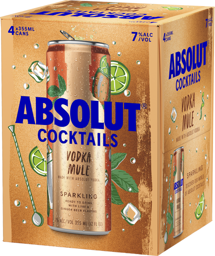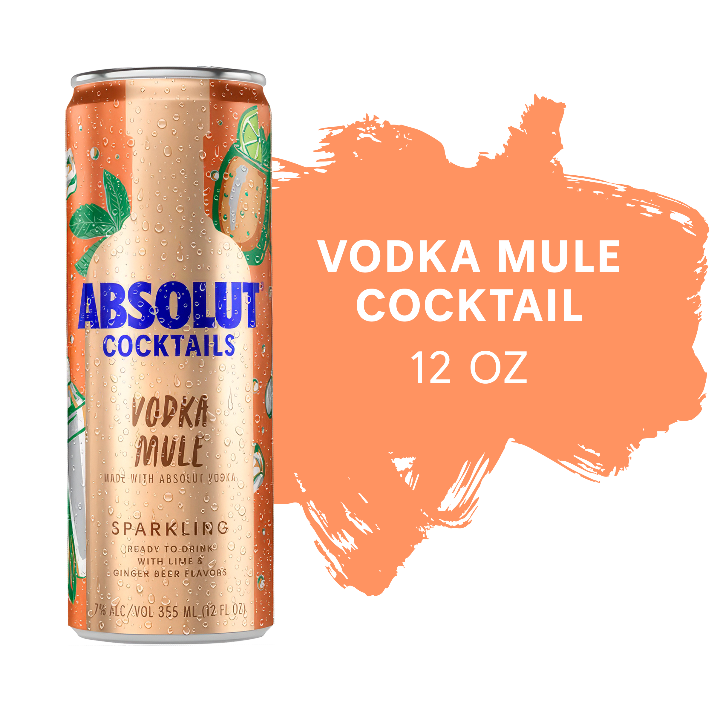 Brand Story Absolut is the Vodka for Mixing. Redefining the premium vodka landscape when introduced to the US, Absolut became synonymous with art, culture & cocktails. By inspiring a revolution in cocktail creation, Absolut launched a range of first-to-market flavors, becoming an icon it its own right. Product Title - Full (Computed) Absolut Ready to Drink Vodka Mule Cocktail, 4 Pack, 12 oz Cans, 14 Proof SKU Name ABS VODMULE14 24/355 6X4 CN US Marketing Brand (Computed) Absolut Sub-Brand ABSOLUT COCKTAIL CANS SKU 26A19001 UPC 080432002070 GTIN 10080432002046 Package UPC 080432002049 Country Of Origin United States CATEGORY VODKA Manufacturer Pernod Ricard Short Description Made with Absolut Vodka, all natural flavors, real fruit juice and mixology expertise, we are bringing sophisticated cocktails to your spur of the moment parties. Absolut Vodka Mule is always sweet, sometimes bitter and never out of place. Long Description Absolut Vodka Mule canned cocktails are an exciting variation of the Absolut Vodka Ready to Drink Cocktails line. This fruity and luscious flavored vodka cocktail has a refreshing taste of zesty lime and spicy hot ginger beer that is perfect when you want to enjoy summer cocktails that are ready to drink. These classic-flavored mixed drinks offer a sweet twist on the Absolut Vodka original liquor line with a fizzy touch that adds to the experience. Crafted with local and quality ingredients, this canned cocktail drink includes Absolut Vodka, all-natural flavors, and real fruit juice. Enjoy the alcohol beverages on the rocks in a cocktail glass with a lime wedge or enjoy chilled straight from the can. As one of the most famous vodkas in the world, Absolut continues to be a staple for your everyday get togethers and special moments with friends and family. Enjoy and Drink Responsibly. Feature Bullet 1 READY TO DRINK: Flavored pre mixed cocktails in a can with the refreshing taste of lime and ginger Feature Bullet 2 INCLUDES: Four 12 fl oz cans of Absolut Vodka Mule; 14 proof or 7% alcohol by volume; Enjoy and drink responsibly Feature Bullet 3 EASY TO ENJOY: Enjoy the alcohol drinks on the rocks with a lime zest or wedge garnish or enjoy chilled straight from the can Feature Bullet 4 CRAFTED LOCALLY: Crafted with quality, local ingredients and made with Absolut Vodka, natural flavors, and real fruit juice Feature Bullet 5 EXPERTLY DISTILLED: Premium vodka in this canned cocktail is distilled multiple times to help deliver a rich but clean taste Feature Bullet 6 VODKA FOR ANY OCCASION: Absolut continues to be the perfect vodka for everyday get togethers and special moments with friends and family Net Content (Computed) 12 oz Bottle Length 2.25 Bottle Width 2.25 Bottle Height 6.12 Bottles Per Case 24 Case Length 14.188 Case Width 9.438 Case Height 6.375 Case Weight 20.82 Proof 14