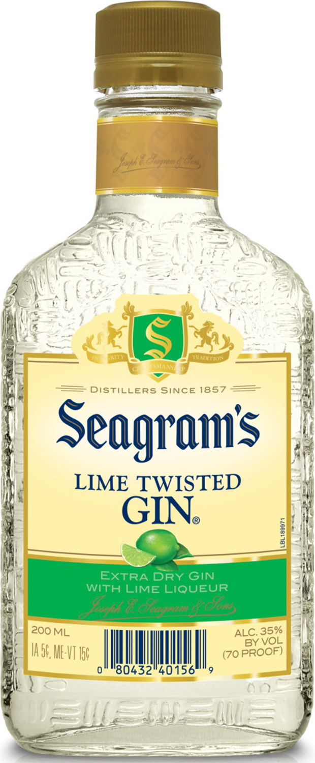 Product Title - Full (Computed) Seagram's Twisted Lime Flavored Gin, 200 ml Flask, 70 Proof SKU Name SEAG LMTW GIN70 48/200FSKNB US Marketing Brand (Computed) Seagram's Sub-Brand SEAGRAMS TWISTED GIN SKU 30203064 UPC 080432401569 GTIN 10080432401566 Country Of Origin United States CATEGORY GIN Manufacturer Pernod Ricard Short Description Seagram's Lime Twisted Gin is a subtle twist on the classic taste of Seagram's Gin. We start with Seagram's Extra Dry and mix it with a twist of natural lime flavor, complementing our time tested blend of botanicals. This flavorful gin can be enjoyed neat, in a martini, or with your favorite mixer. Long Description Made from infusing lime liqueur into quality gin, Seagram's Twisted Gin Lime has a delightfully tangy and mellow taste with a dry gin finish on the palate that is worth savoring. Use Seagram's Twisted Gin Lime for a dry, lime-flavored martini, a Tom Collins, a gin and tonic, a gimlet, or any popular gin cocktail. Seagram's Twisted Lime Gin is a classy, sophisticated option for mixing simple and refreshing cocktails. Try it in your favorite recipe along with other fruit flavors to create a customized cocktail. Feature Bullet 1 FLAVOR & NOTES: Gin with a twist of natural lime flavor, perfectly complementing a blend of botanical essences Feature Bullet 2 ENJOY RESPONSIBLY: Each 200ml bottle of Seagram's Twisted Lime Flavored Gin is 70 proof, 35% ABV Feature Bullet 3 CONSUMPTION TIP: This flavorful twisted gin can be enjoyed neat, in a martini, or with your favorite juice or mixer Feature Bullet 4 ORIGIN: Seagram's is made proudly in Fort Smith, Arkansas and has been distilled in the US from the very beginning Net Content (Computed) 200 ml Bottle Length 1.38 Bottle Width 3.083 Bottle Height 7.3 Bottles Per Case 48 Case Length 19.5 Case Width 12.22 Case Height 7.8 Case Weight 46.68 Proof 70