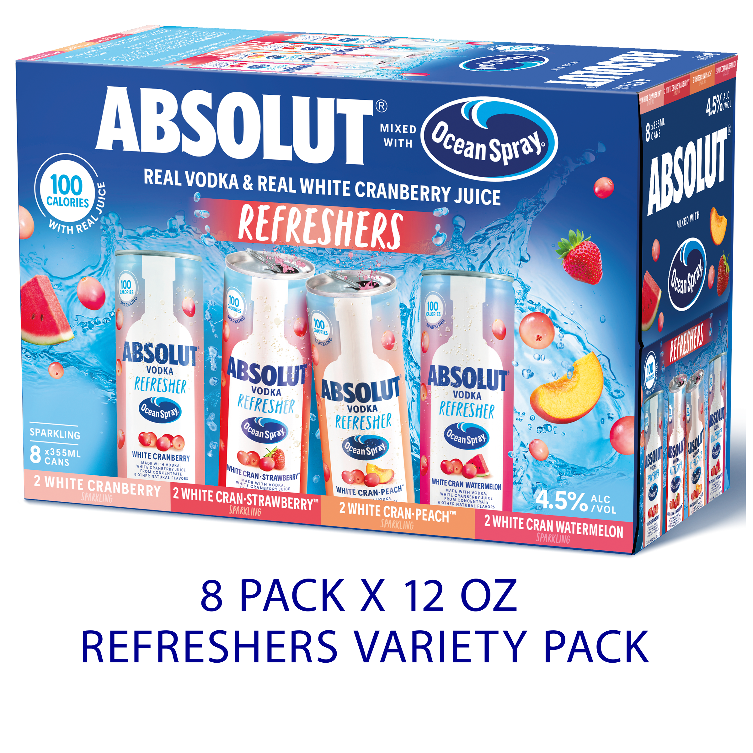Brand Story Absolut is the Vodka for Mixing. Redefining the premium vodka landscape when introduced to the US, Absolut became synonymous with art, culture & cocktails. By inspiring a revolution in cocktail creation, Absolut launched a range of first-to-market flavors, becoming an icon it its own right. Product Title - Full (Computed) Absolut Ocean Spray Refresher Variety Pack, 8 Pack, 12 oz Cans, 9 Proof SKU Name ABSOSVAR100CAL9 24/355 3X8CNUS Marketing Brand (Computed) Absolut SKU 63A19002 GTIN 10080432002855 Package UPC 080432002858 Country Of Origin United States CATEGORY VODKA Long Description Introducing Absolut and Ocean Spray Vodka Refreshers your new go-to 100 calorie cocktail They are crisp refreshing to the palate and ready to enjoy Made with premium Absolut Vodka real Ocean Spray white cranberry juice from concentrate and other natural flavors all in a convenient can Perfect for any occasion anywhere This 8 pack contains four refreshing flavors White Cranberry White Cran Strawberry White Cran Watermelon and White Cran Peach Feature Bullet 1 READY TO DRINK: Made with premium Absolut Vodka and real Ocean Spray White Cranberry juice in a convenient ready to drink variety pack Feature Bullet 2 INCLUDES: One 8-pack of Absolut Ocean Spray Refresher Variety Pack; each can is 9 proof or 4.5% ABV. Enjoy responsibly. Feature Bullet 3 CONSUMPTION TIP: Enjoy chilled straight from the can or over ice for best refreshing flavor Feature Bullet 4 INGREDIENTS: Made with premium Absolut Vodka real Ocean Spray White Cranberry juice and natural flavors Feature Bullet 5 ECO FRIENDLY: Vodka made in Sweden in a CO2 neutral distillery using local ingredients one of the most energy efficient in the world Feature Bullet 6 OCCASION: Perfect for everyday get togethers and special moments with friends and family Net Content (Computed) 12 oz Bottle Length 2.25 Bottle Width 2.25 Bottle Height 6.12 Bottles Per Case 24 Case Length 14.25 Case Width 9.375 Case Height 6.5 Case Weight 20.59 Proof 9
