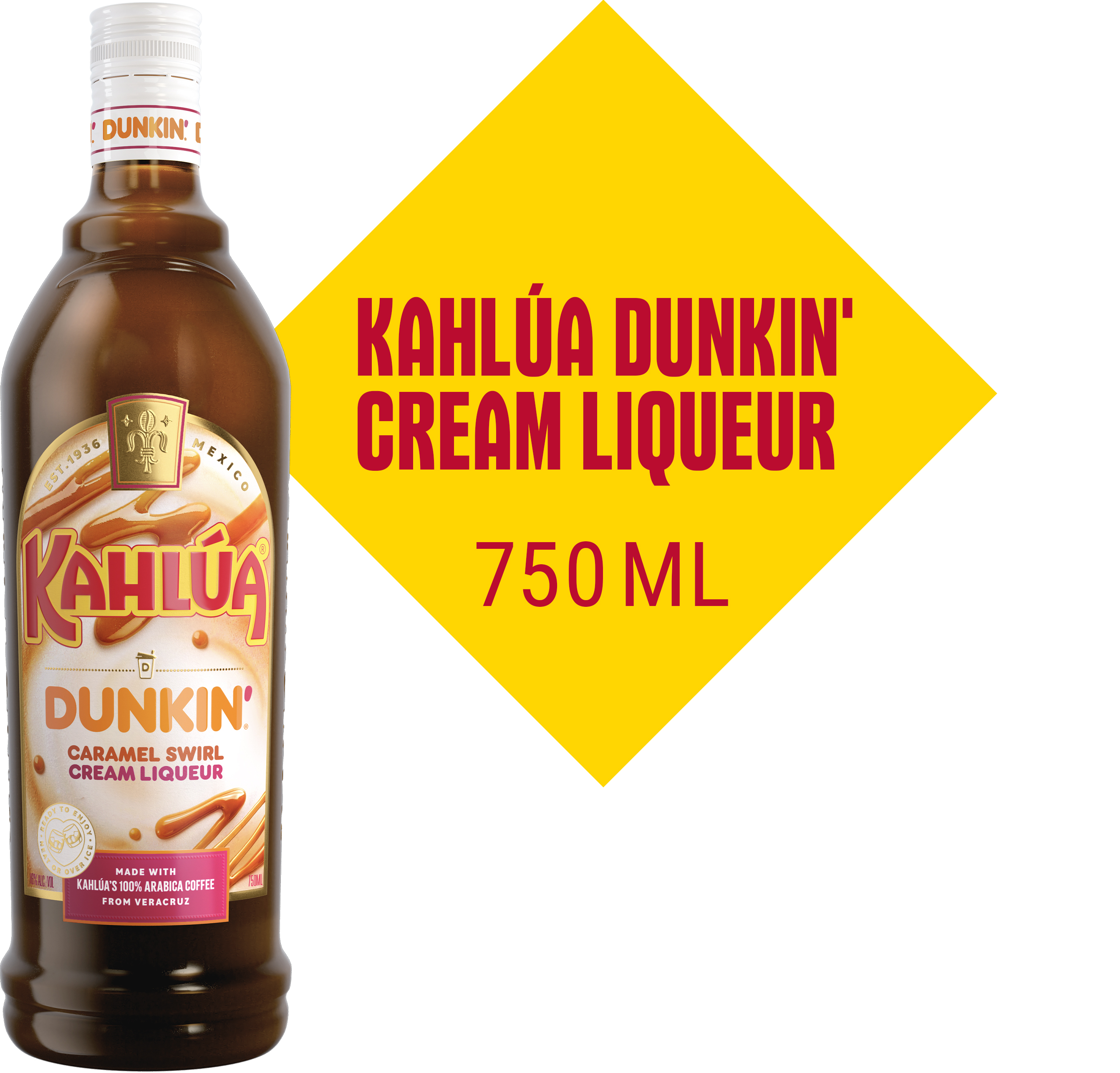 CATEGORY CORDIALS AND LIQUEURS Manufacturer Pernod Ricard Short Description We Dunkin did it! Treat yourself and give Kahlúa with a Dunkin’ swirl a whirl, a delicious, velvety, and creamy liqueur blending the iconic Dunkin Caramel Swirl flavor with real cream, 100% Arabica coffee, and a generous splash of rum. Kahlua Dunkin Cream Liqueur really is a cream come true. Ready, set, indulge! Long Description We Dunkin did it! Experience a smooth, playful and decadent flavor sensation that’s sure to tantalize your taste buds, give Kahlua with a Dunkin swirl a whirl. Kahlua Dunkin' Cream Liqueur is a rich, velvety cream liqueur that combines Dunkin’s #1 selling swirl flavor with real cream, 100% Arabica coffee, and Premium Rum. The result is a perfectly balanced caramel swirl, with a rich and sweet aroma of toffee, vanilla, and dulce de leche, harmoniously blended with hints of coffee and chocolate, and notes of rum, coconut and oak for a sophisticated finish. This full-bodied liqueur is equally enjoyable chilled, neat, or over ice, making it ideal for a cozy night in or for adding a special touch to your dinner parties, it’s truly a cream come true. Ready, set, indulge! Feature Bullet 1 SMOOTH AND INDULGENT FLAVOR: Rich, caramel swirl flavor blended with velvety cream and bold coffee liqueur Feature Bullet 2 INCLUDES: Kahlua Dunkin Caramel Swirl Cream Liqueur in a 750 ml bottle with 16% ABV Feature Bullet 3 CONSUMPTION TIP: Serve chilled, neat or over ice. Indulge and enjoy fully Feature Bullet 4 PREMIUM INGREDIENTS: Made with real cream, Arabica coffee from Veracruz, premium rum and the iconic Dunkin Caramel Swirl flavor Feature Bullet 5 ADD A LITTLE EXTRA FLAIR: Perfect for nights in with a loved one or when you want to add something extra indulgent to your dinner parties Awards Silver Medal SFWSC Net Content (Computed) 750 ml Bottle Length 3.07 Bottle Width 3.07 Bottle Height 10.87 Bottles Per Case 12 Case Length 13.17 Case Width 9.92 Case Height 11.44 Case Weight 34.6 Proof 32