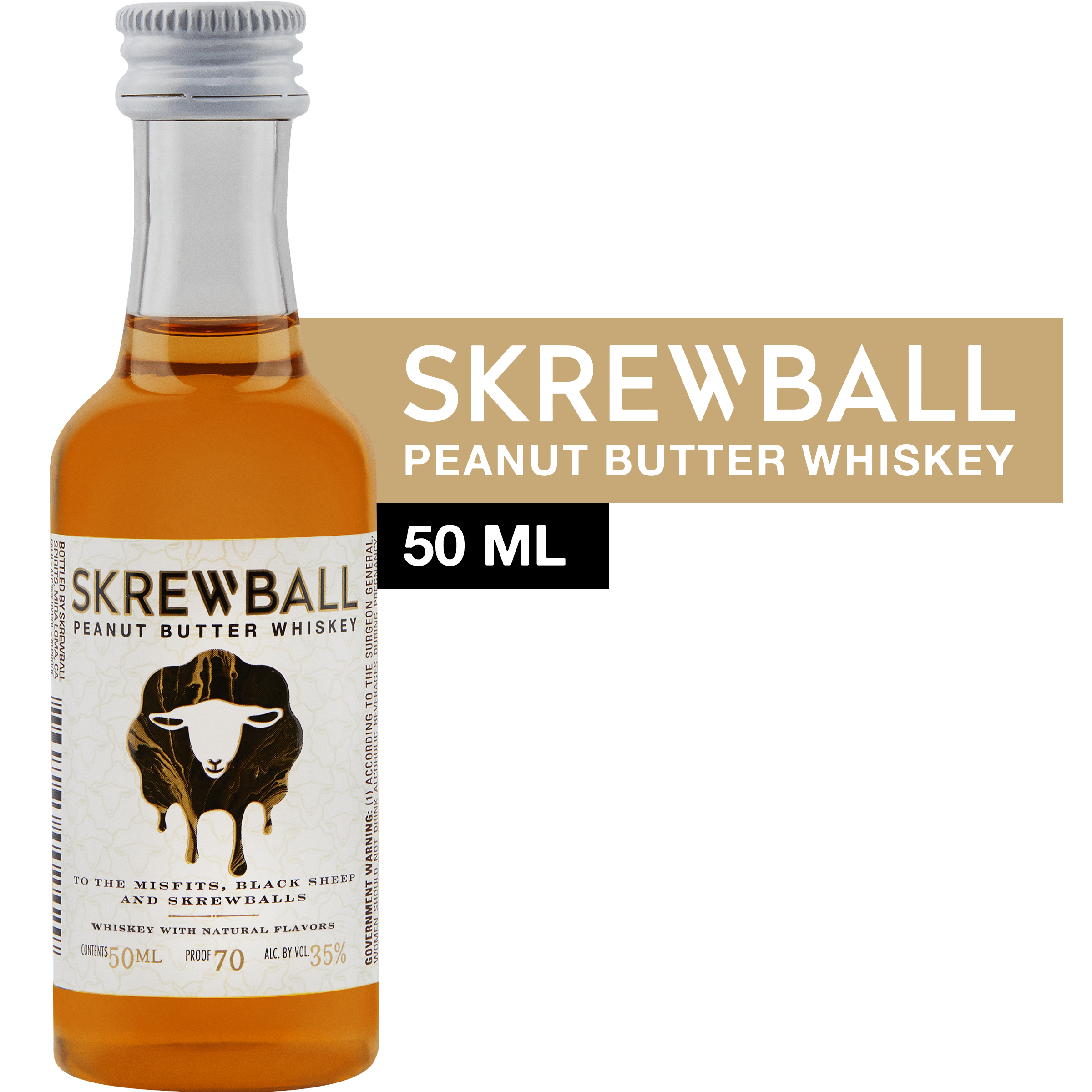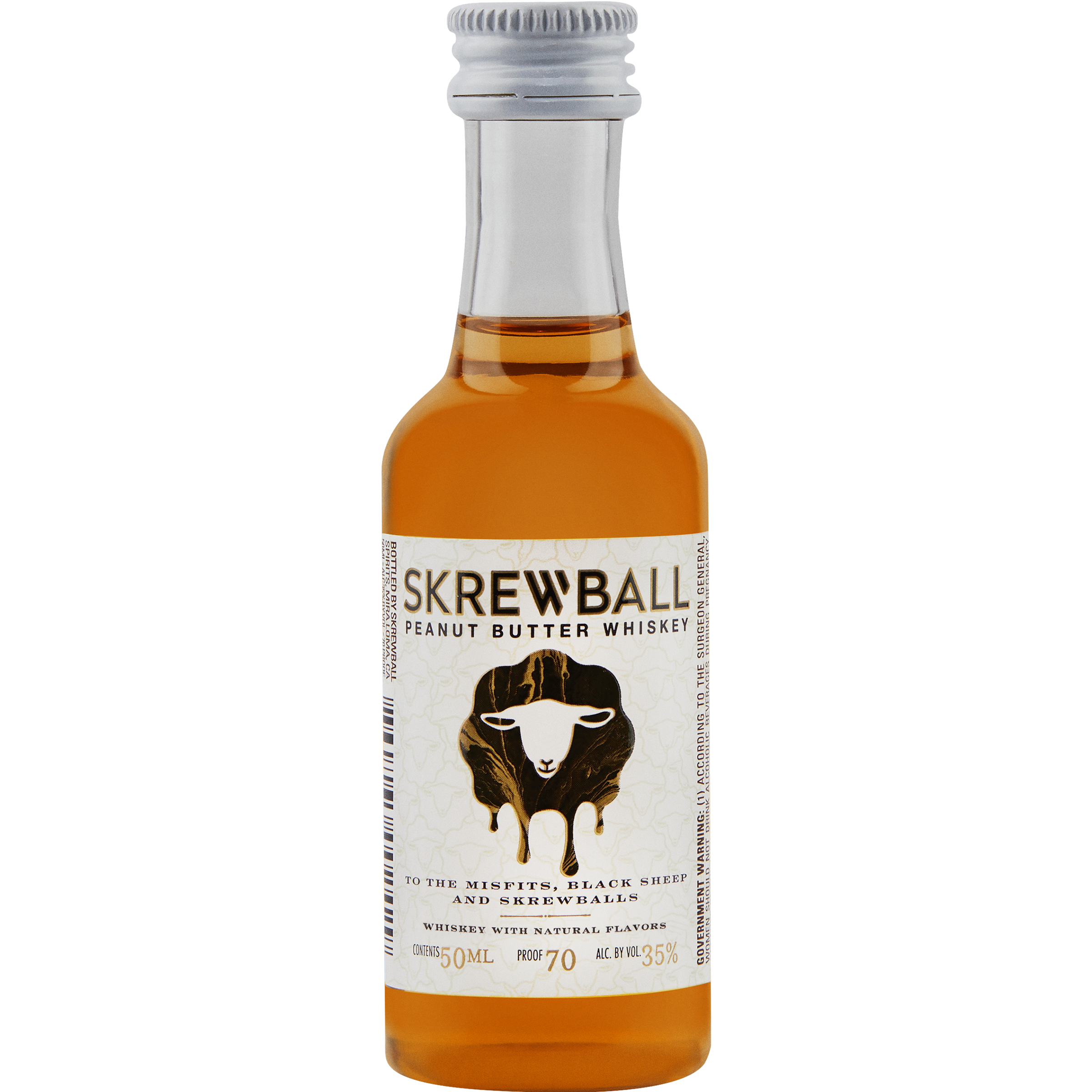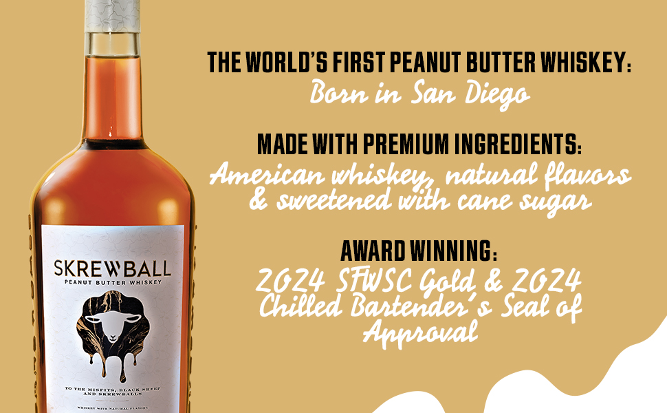 Product Title - Full (Computed) Skrewball Peanut Butter Flavored Whiskey With Natural Flavors, 4 Pack, 50 ml Bottles, 70 Proof SKU Name SB PBW 120/50 30X4PK PT US Marketing Brand (Computed) Skrewball Sub-Brand SKREWBALL WHISKEY SKU 87500010 UPC 860265002429 GTIN 10080432002503 Package UPC 080432002506 Country Of Origin United States CATEGORY DOMESTIC WHISKEY Manufacturer Pernod Ricard Short Description Skrewball embodies the bold flavors of smooth whiskey and creamy peanut butter. It was a bold choice, but Skrewball’s mix of sweet & savory flavors is exactly what makes it uniquely appropriate for any occasion, and pleasantly satisfying for even the most skeptic of your krew. Long Description Skrewball Peanut Butter Whiskey embodies both smooth whiskey and creamy peanut butter flavors simultaneously. This flavored whiskey offers an original and unique flavor profile, a delicious and harmonious blend of sweet, salty, savory, and smooth that is unlike anything you've ever tasted before. Founded in 2018 in San Diego, CA, by husband-and-wife duo Steven and Brittany Yeng, Skrewball emerged when co-founder Steve, newly arrived from Cambodia, discovered the fascinating flavor of peanut butter, leading to the creation of a renowned peanut butter whiskey cocktail. He joined forces with his wife Brittany, a skilled chemist, to create the award-winning Skrewball recipe. Crafted with both bartenders and drinkers in mind, this peanut butter whiskey is a standalone spirit that tastes great on its own and plays well in alcoholic drinks and cocktails like a Peanut Butter Old Fashioned, Nutty Russian, or Skrewball Mudslide. Enjoy Responsibly. Feature Bullet 1 THE ORIGINAL: Peanut butter whiskey made with a quality-first approach; embodying both smooth whiskey and creamy peanut butter flavors Feature Bullet 2 INCLUDES: Four 50 mL bottle of Skrewball Peanut Butter Whiskey with Natural Flavors; 70 proof or 35% alcohol by volume; Enjoy responsibly Feature Bullet 3 Consumption Tip: Enjoy this liquor as a shot, neat, over ice, or in cocktails like a Peanut Butter Old Fashioned, Nutty Russian, or Skrewball Mudslide Feature Bullet 4 FLAVOR & NOTES: A unique and original flavor profile: a mix of sweet, salty, savory, and smooth that defies expectations of whiskeys Feature Bullet 5 CONTAINS PEANUTS: Whiskey with Natural Flavors Feature Bullet 6 AWARD-WINNING WHISKEY: Skrewball Peanut Butter Whiskey won double gold at the 2021 Sip Awards Feature Bullet 7 WE ARE THE SKREWBALLS: Skrewball is a perfect celebration of the unexpected, wild and wonderful in all of us Net Content (Computed) 50 ml Bottle Length 1.25 Bottle Width 1.25 Bottle Height 4 Bottles Per Case 120 Case Length 16.63 Case Width 13.88 Case Height 4.56 Case Weight 22 Proof 70